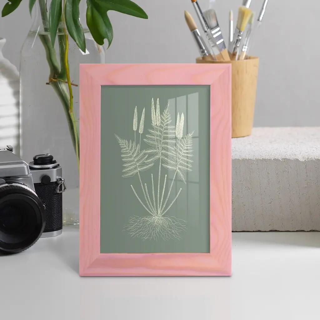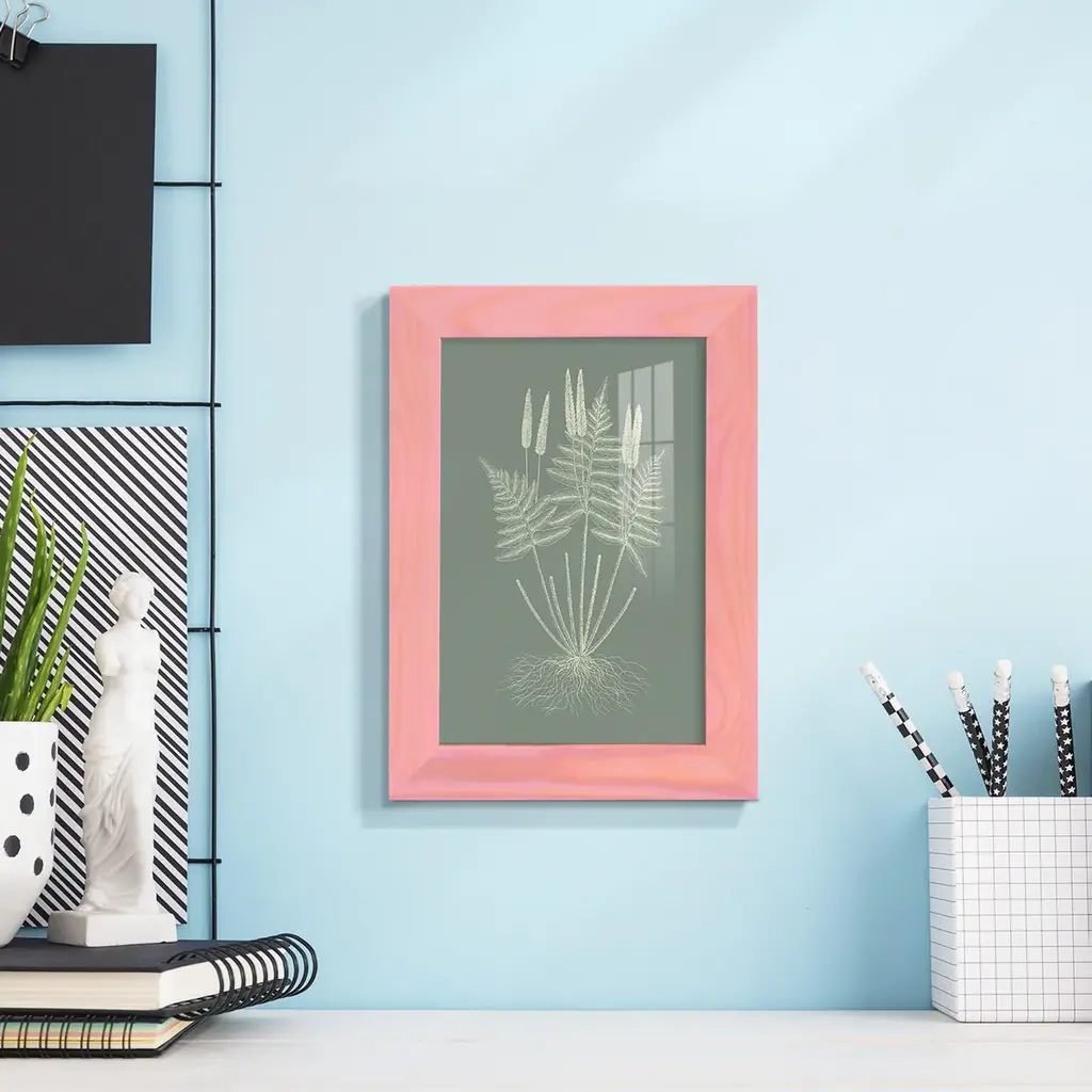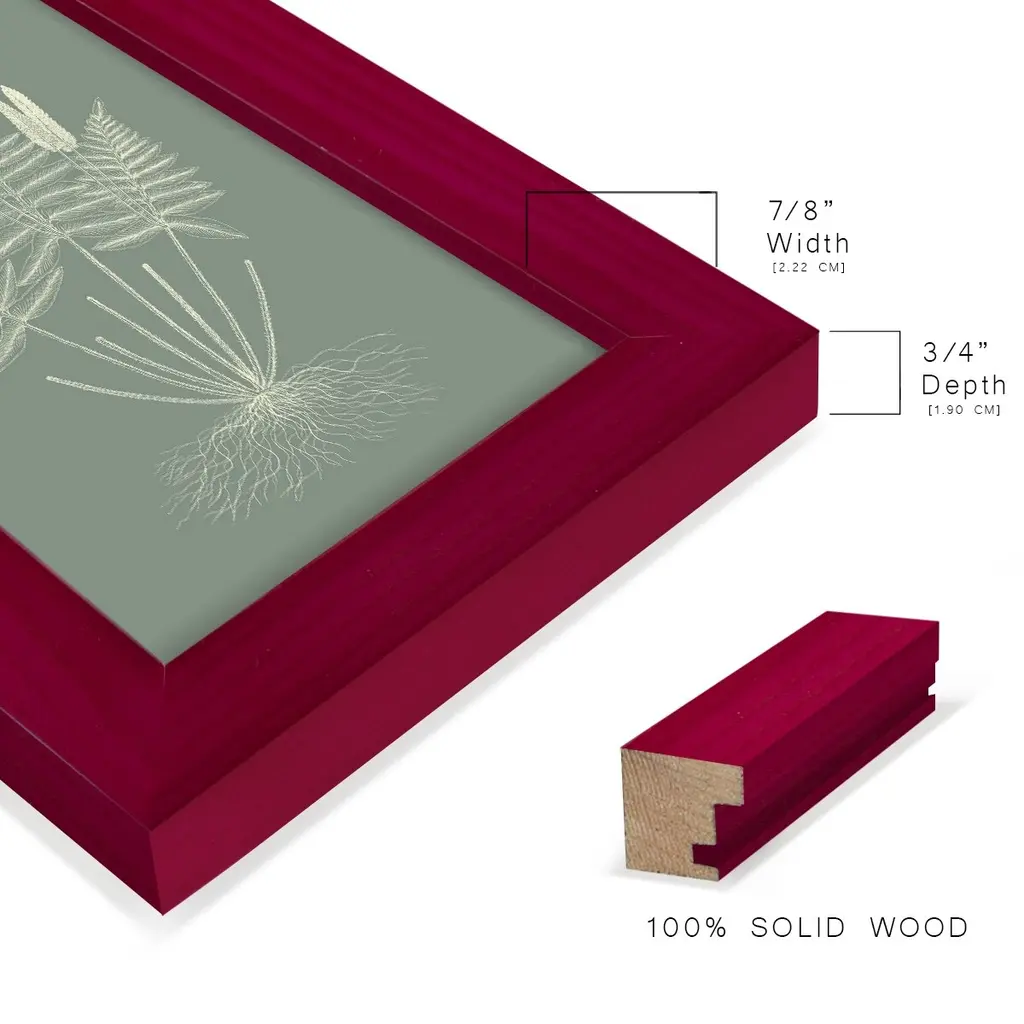 Ferns on Sage VII -EZ SWITCH Framed Print w/glass-Cherry Red A delightful, framed print. Featuring a solid wood frame with real wood glass. This premium print is giclee quality. In addition, every frame features a removable back and table top stand. This allows you to change your art in the future or to just stand the art on a table for a new look. We are sure you'll enjoy our new series of EZ SWITCH Framed Art. Solid Wood Frame Real Glass Removable / Replaceable Art Built in Tabletop Stand Sizes range from 4x6 up to 12x15 - buy just one or pair them up as sets as you see fit.