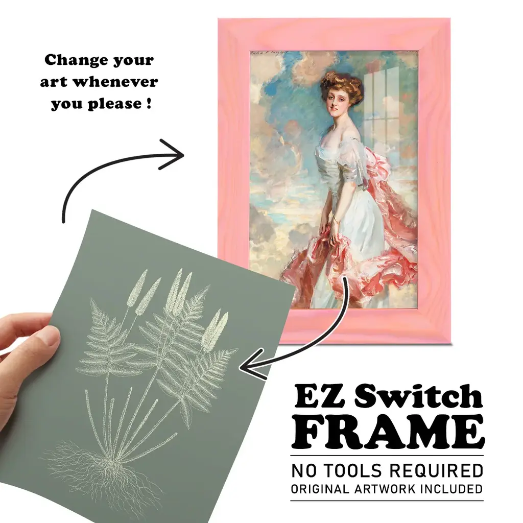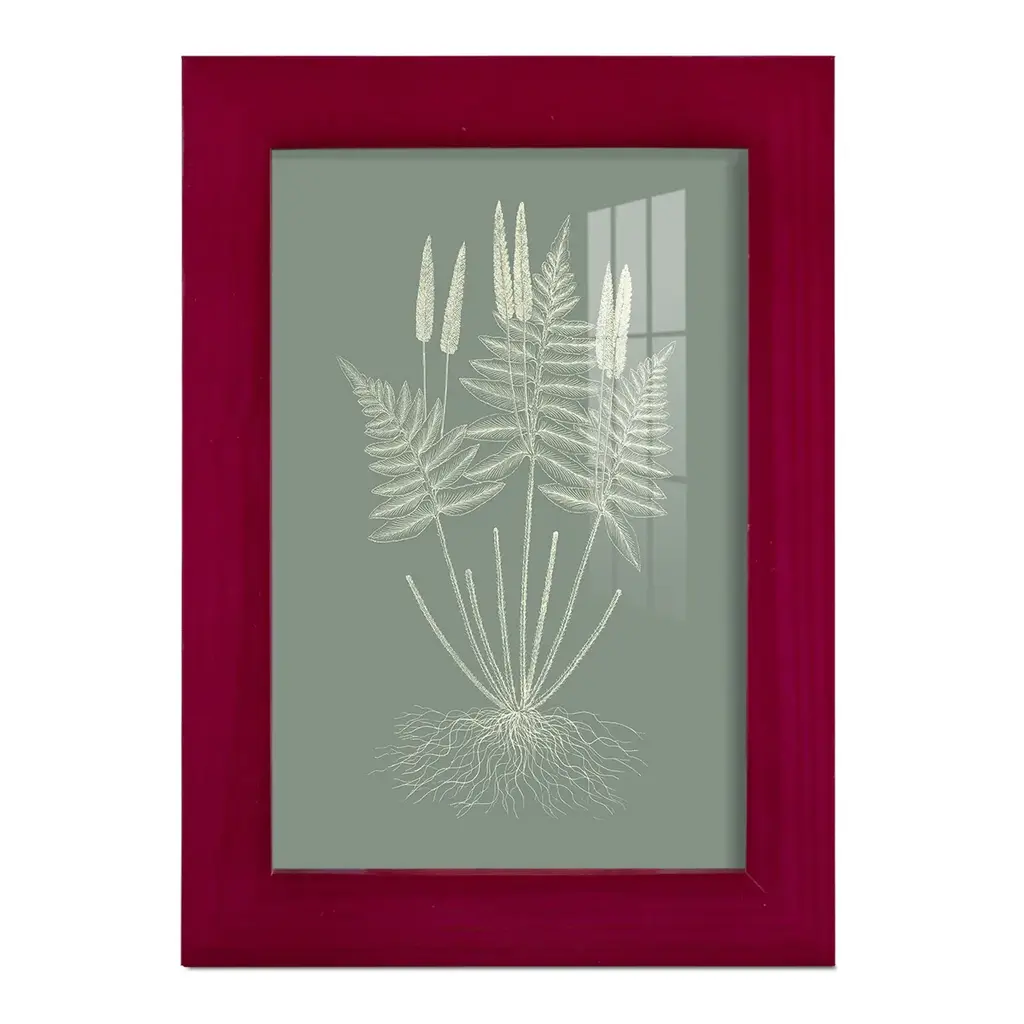 Ferns on Sage VII -EZ SWITCH Framed Print w/glass-Cherry Red A delightful, framed print. Featuring a solid wood frame with real wood glass. This premium print is giclee quality. In addition, every frame features a removable back and table top stand. This allows you to change your art in the future or to just stand the art on a table for a new look. We are sure you'll enjoy our new series of EZ SWITCH Framed Art. Solid Wood Frame Real Glass Removable / Replaceable Art Built in Tabletop Stand Sizes range from 4x6 up to 12x15 - buy just one or pair them up as sets as you see fit.