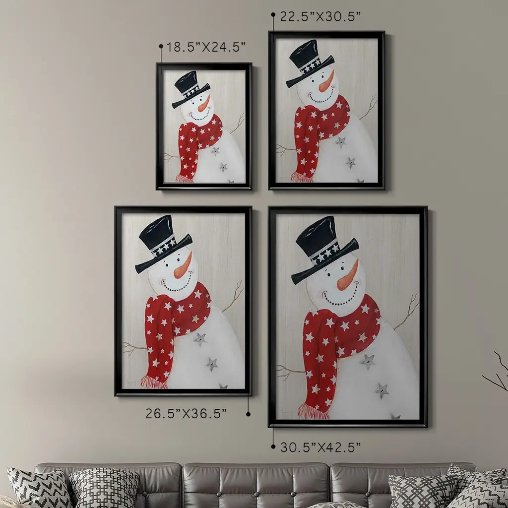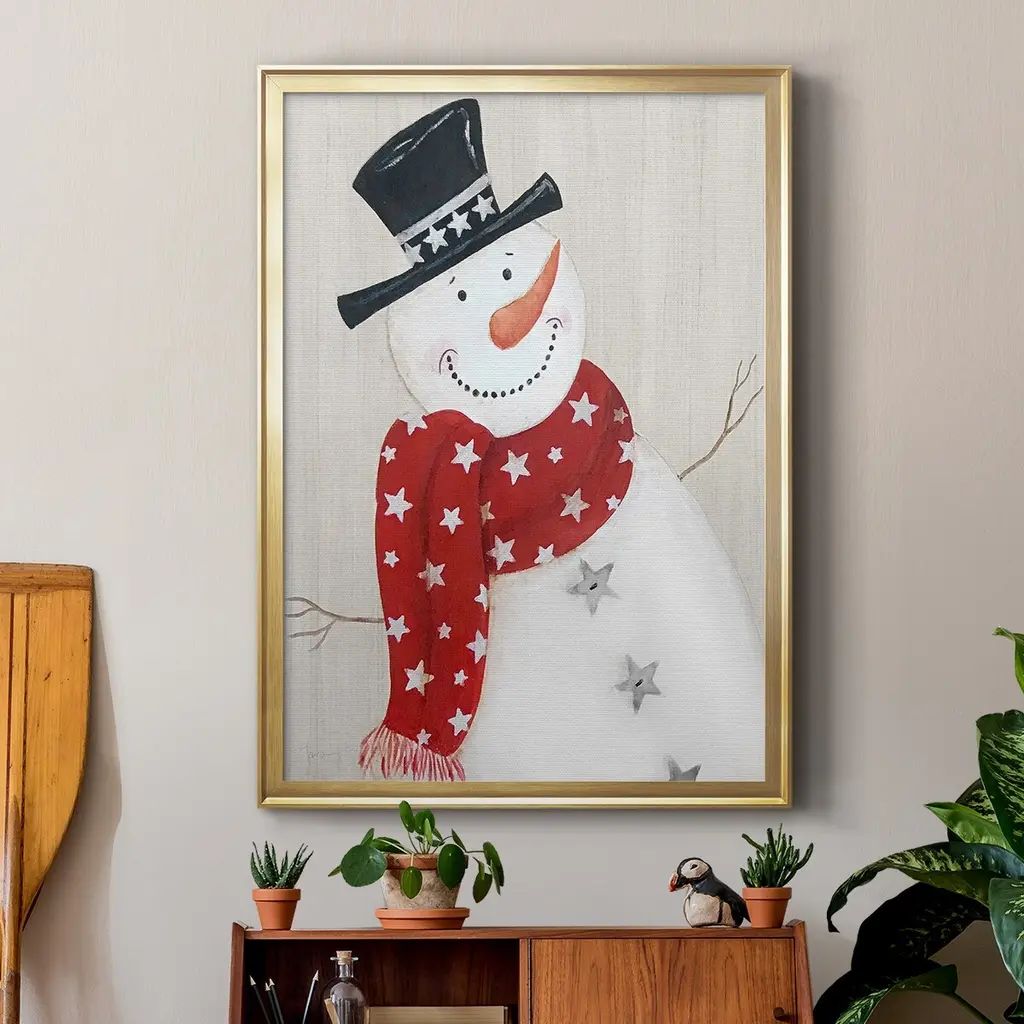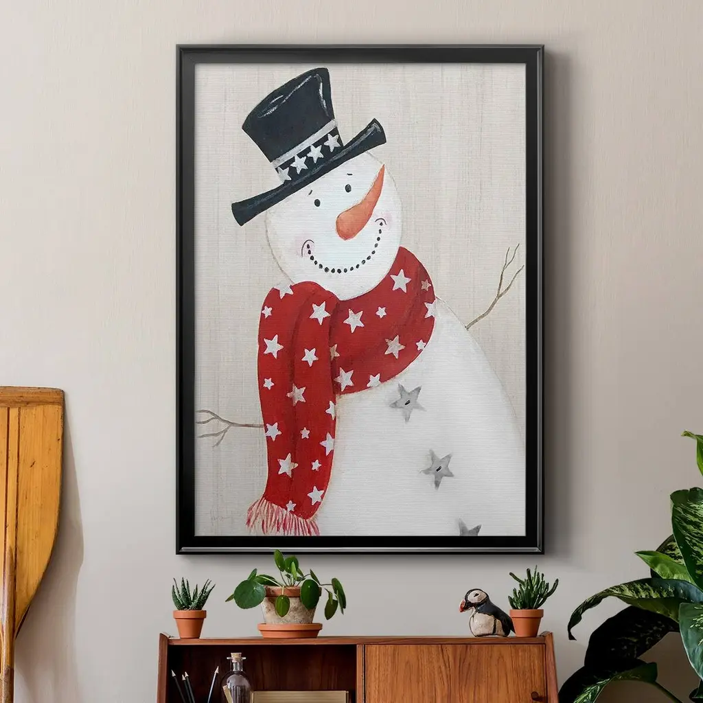 Festive Snowman I Premium Framed Print - Ready to Hang A Premium Framed Print created to last. Framed in distressed wood and available in an array of sizes and colors Featuring a beveled a solid wood stretcher bar, each piece comes ready to hand 4 SIZES AVAILABLE 30.5''X42.5'' - Overall Size 26.5'X36.5'' - Overall Size 22.5''x30.5'' - Overall Size 18.5''x24.5'' - Overall Size Each piece is made to order. Each piece comes with hanging hardware. Made in the USA Ready to Hang
