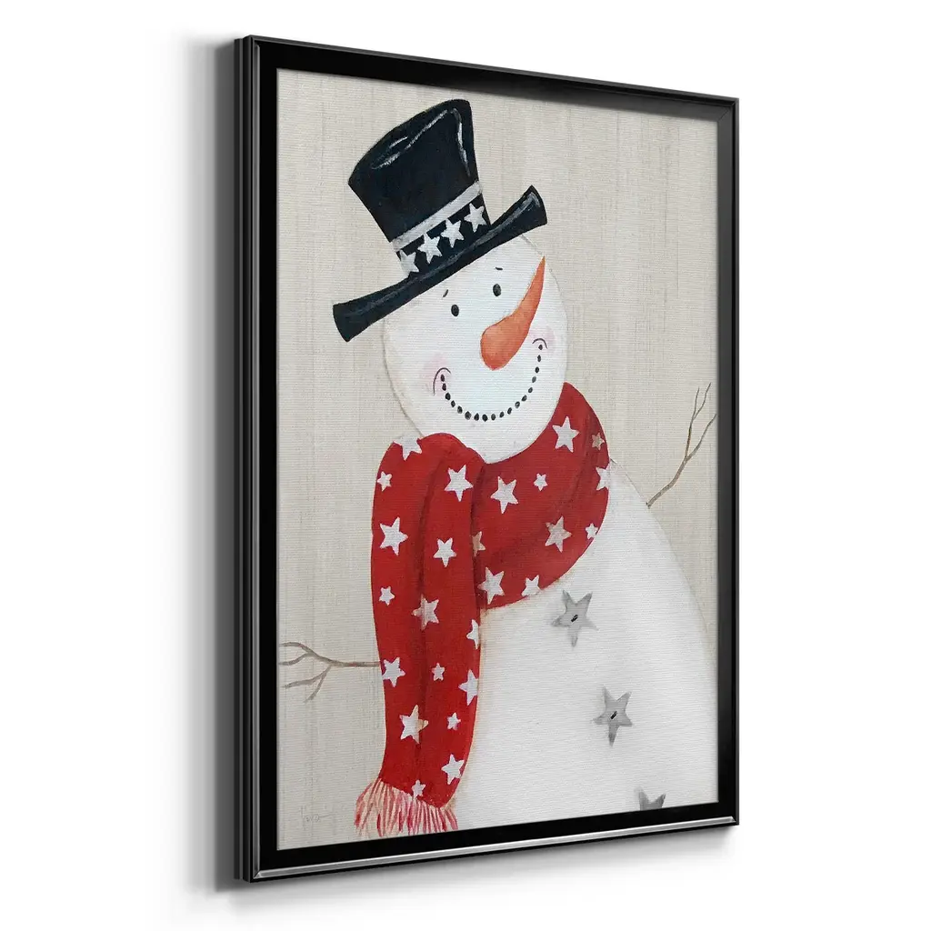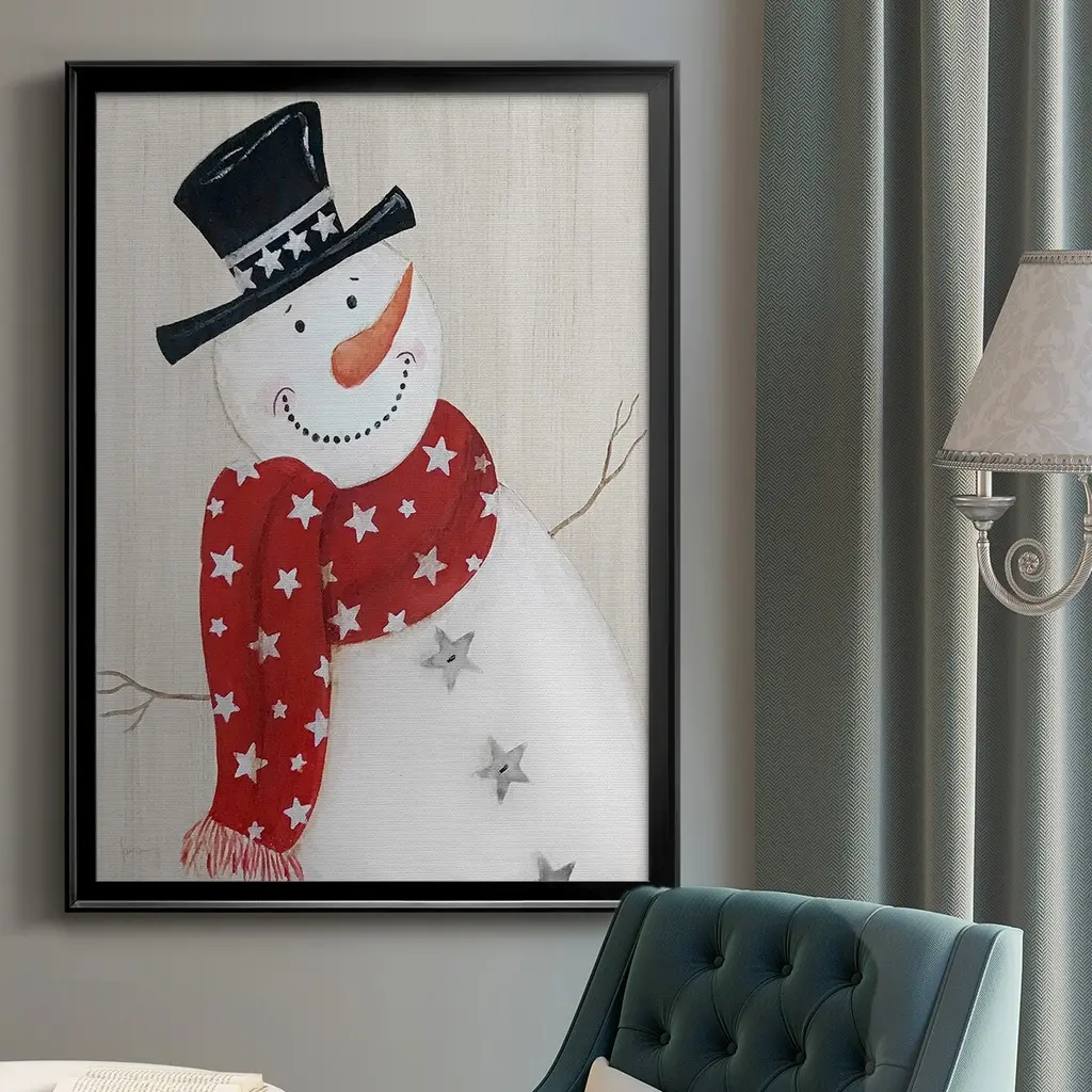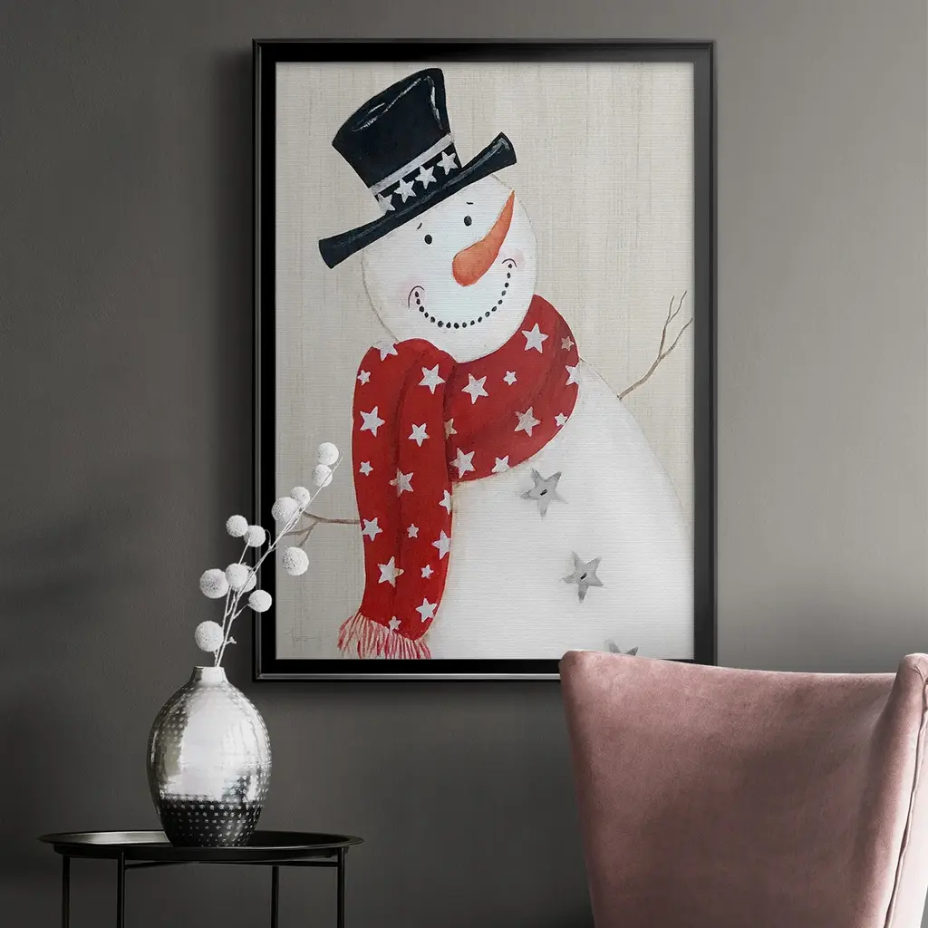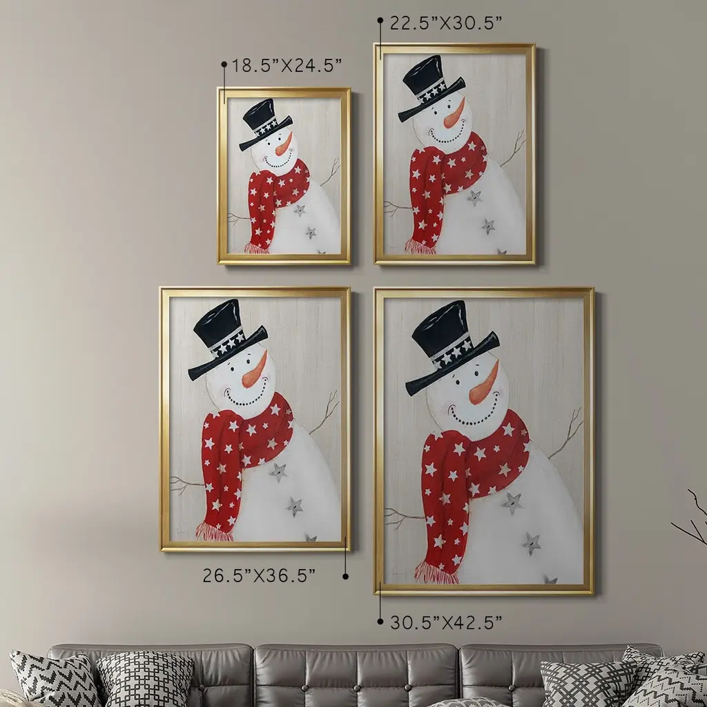 Festive Snowman I Premium Framed Print - Ready to Hang A Premium Framed Print created to last. Framed in distressed wood and available in an array of sizes and colors Featuring a beveled a solid wood stretcher bar, each piece comes ready to hand 4 SIZES AVAILABLE 30.5''X42.5'' - Overall Size 26.5'X36.5'' - Overall Size 22.5''x30.5'' - Overall Size 18.5''x24.5'' - Overall Size Each piece is made to order. Each piece comes with hanging hardware. Made in the USA Ready to Hang
