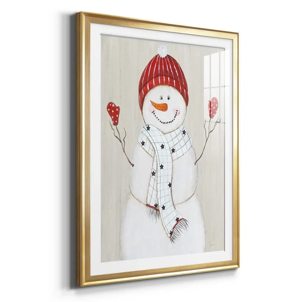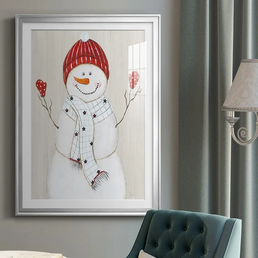 Festive Snowman III Premium Framed Print - Ready to Hang A Premium Framed Print created to last. Framed in distressed wood and available in an array of sizes and colors Featuring a beveled a solid wood stretcher bar, each piece comes ready to hand 4 SIZES AVAILABLE 30.5''X42.5'' - Overall Size 26.5'X36.5'' - Overall Size 22.5''x30.5'' - Overall Size 18.5''x24.5'' - Overall Size Each piece is made to order. Each piece comes with hanging hardware. Made in the USA Ready to Hang Giclee Paper Print Acrylic Glass Beveled Matt Board
