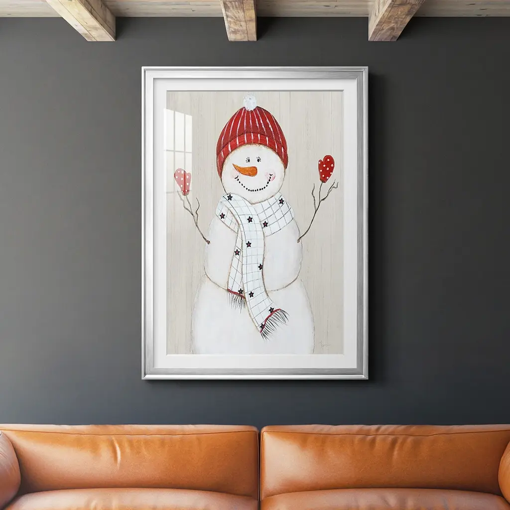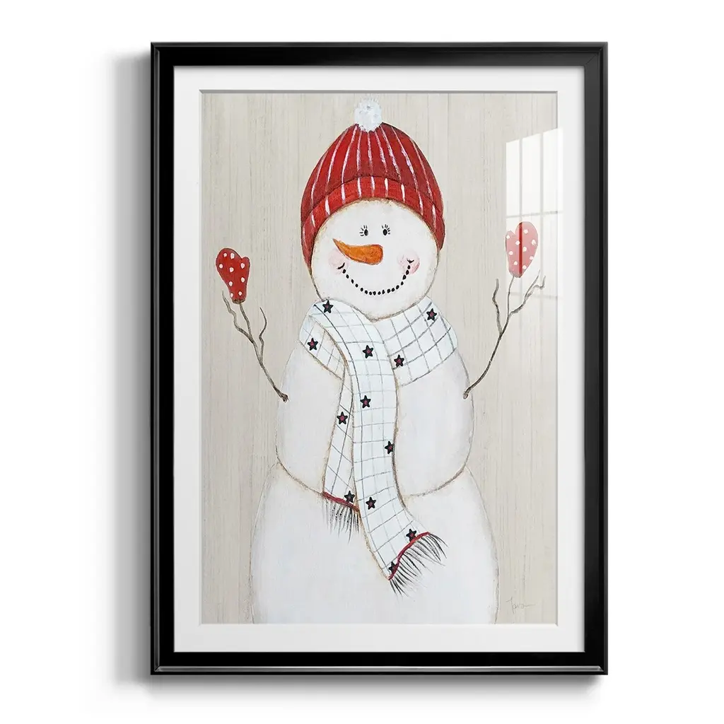 Festive Snowman III Premium Framed Print - Ready to Hang A Premium Framed Print created to last. Framed in distressed wood and available in an array of sizes and colors Featuring a beveled a solid wood stretcher bar, each piece comes ready to hand 4 SIZES AVAILABLE 30.5''X42.5'' - Overall Size 26.5'X36.5'' - Overall Size 22.5''x30.5'' - Overall Size 18.5''x24.5'' - Overall Size Each piece is made to order. Each piece comes with hanging hardware. Made in the USA Ready to Hang Giclee Paper Print Acrylic Glass Beveled Matt Board