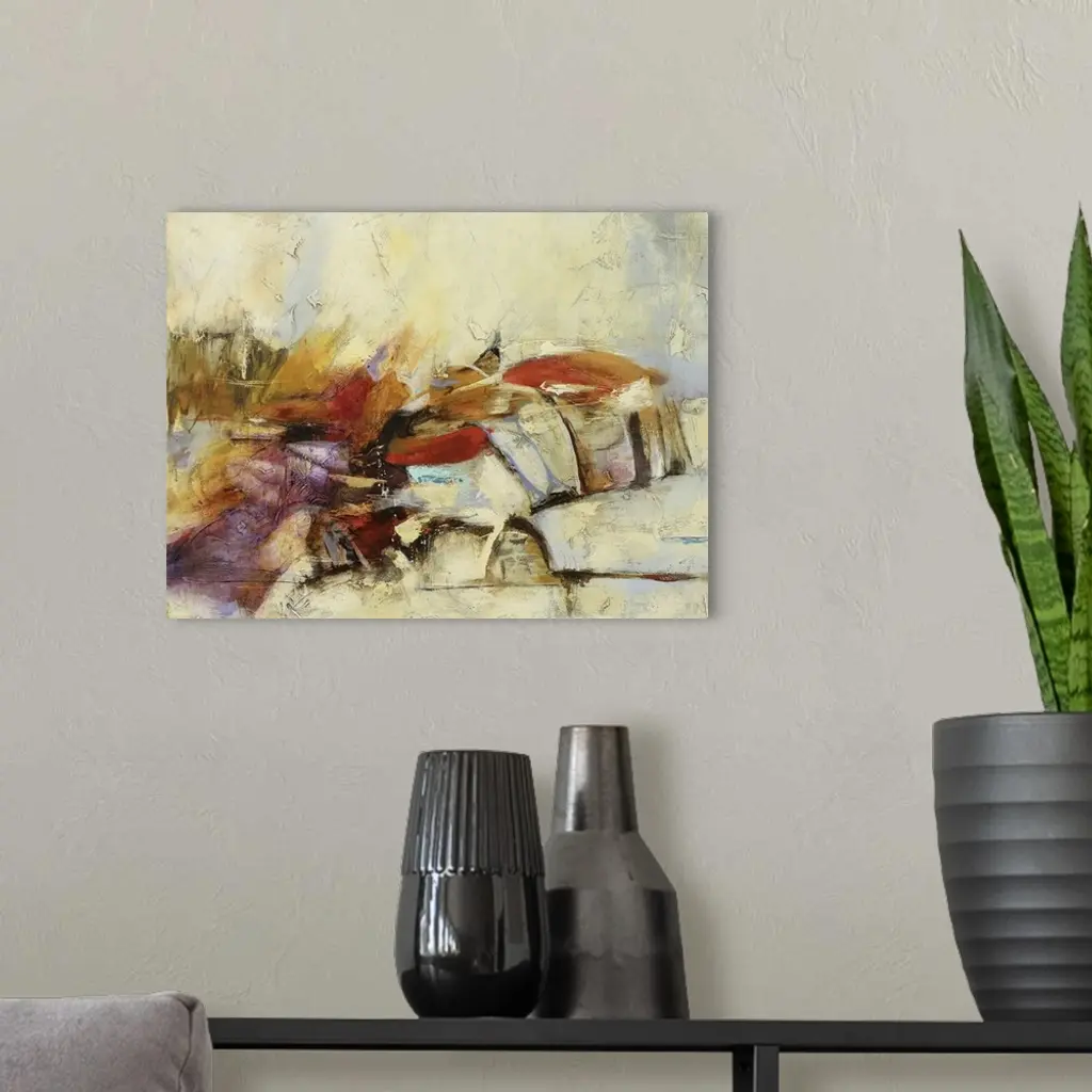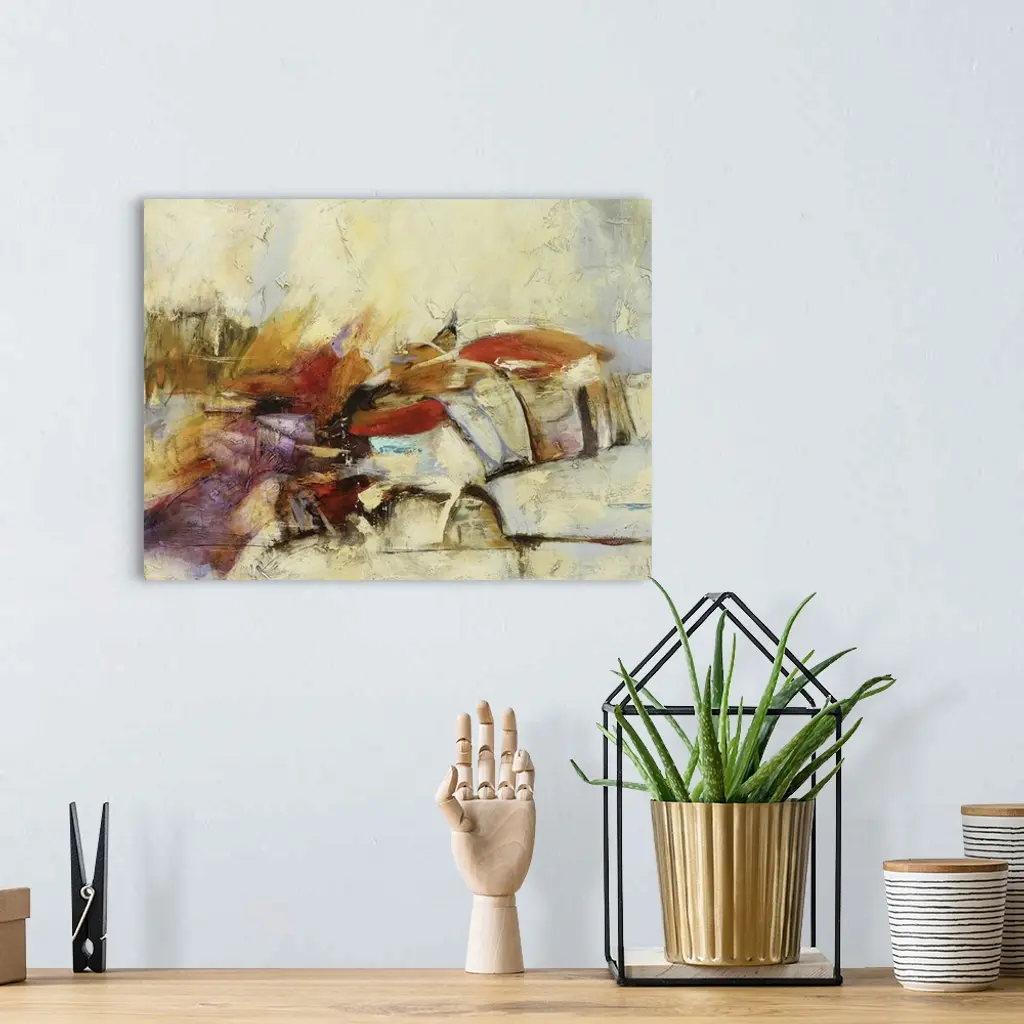 Horizontal abstract painting in tones of yellow, orange and red with textured cream accents.