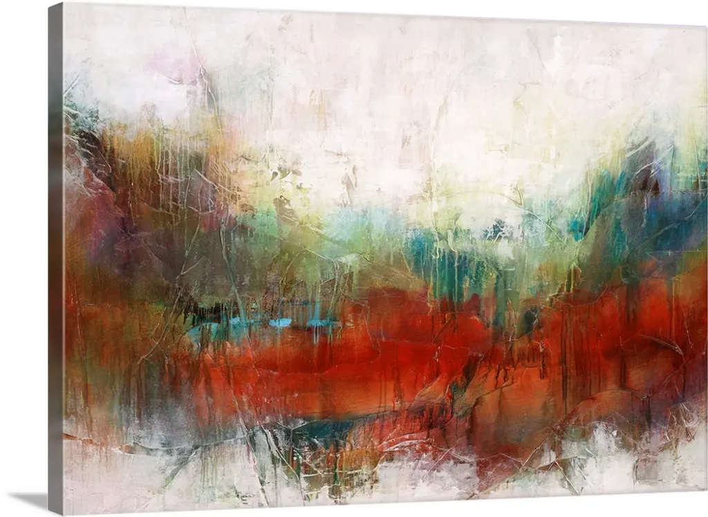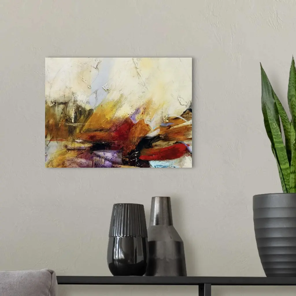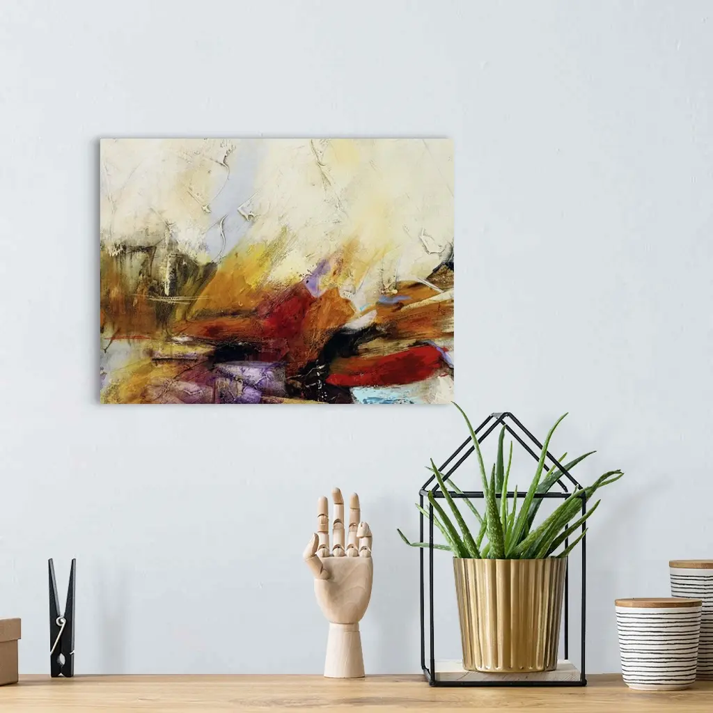Horizontal abstract painting in tones of yellow, orange and red with textured cream accents.