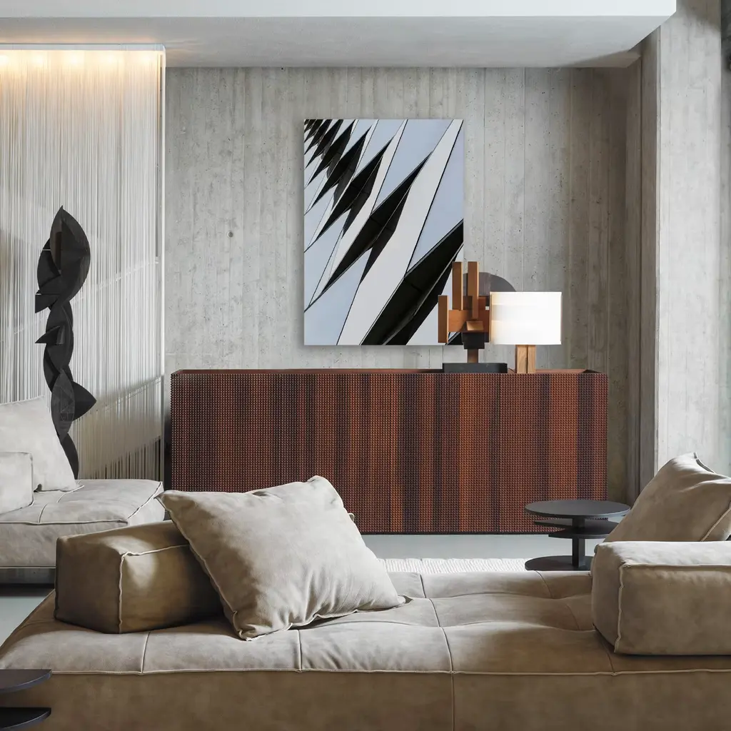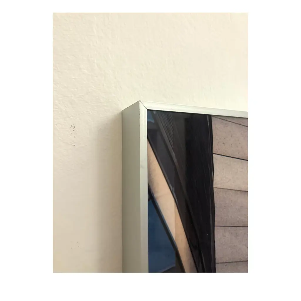 Fetter Lane takes up a series of photographs whose theme is architectural detail. The cut and angular forms enhance the glassy, mirrored surface of the architectural element through a formal composition inspired by Avant-Garde and Modernist painting. The technique used to create this photograph is Chromaluxe. Please, contact the Concierge for customization options. The frame is included. Delivered with a certificate of authenticity.