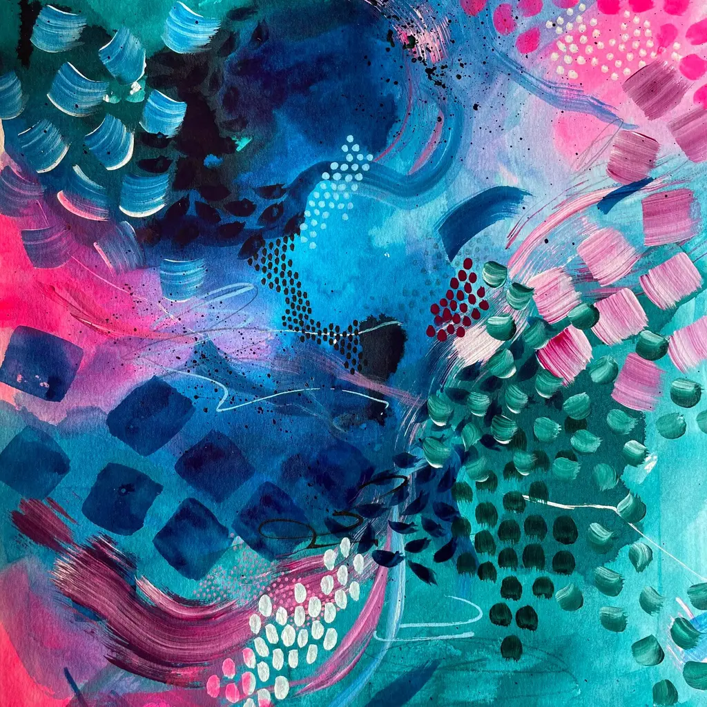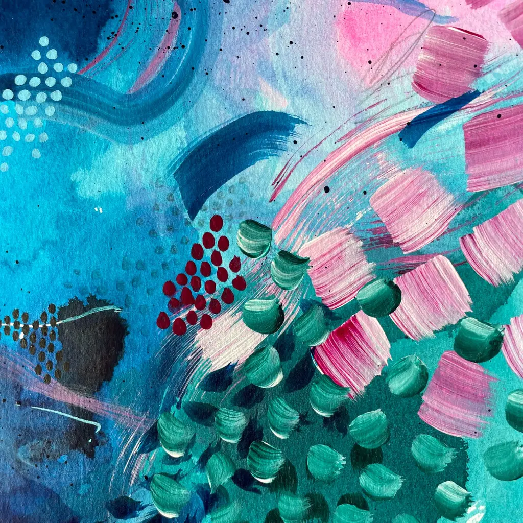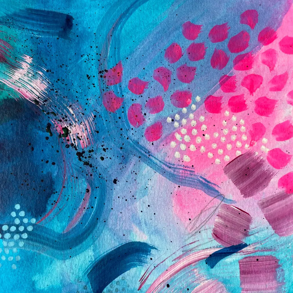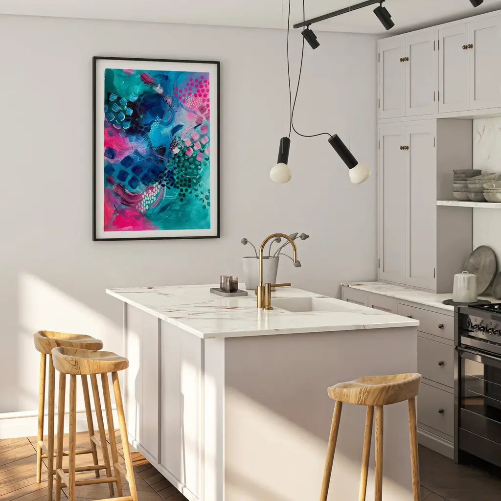 This vibrant contemporary abstract print features beautiful hues of blues, cobalts, teals and hot pink to create a joyful and uplifting piece of art for any interior. Originally painted using acrylic paint, inks, oil pastels and pencil, this luxurious-quality fine art print beautifully captures every brushstroke and hand-crafted mark. Printed on heavyweight 316gsm cotton rag textured paper using archival-quality inks, this A3 giclée print will maintain its beautiful vibrancy for many years to come. Each print has a white border so it can easily fit into a standard-size frame. Print is sold unframed.
