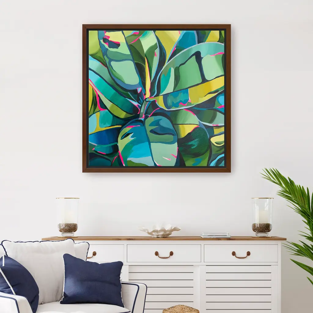 Enhance your living space with this captivating abstract botanical green canvas art "Ficus - Breeze" by Nadine Montille. Featuring a vibrant interplay of lush green tones and organic botanical elements, this artwork brings a refreshing touch of nature indoors. The dynamic composition and soothing hues create a harmonious and serene atmosphere, making it a perfect addition to both contemporary and classic interiors. Available in black frame, dark walnut frame, oak frame, or as a wrapped canvas. Our Gallery Wrap Canvas Prints are proudly assembled with high quality materials in California, USA. Each piece is printed on a thick, archival grade canvas using Giclee technology. It is then hand-stretched by our experienced artisans over solid wood bars, which will not warp over time. The final product is a piece personally crafted for you to confidently display on your wall. Care and Assembly: Ensure that the location of your piece has little to no exposure to heat, sunlight, and moisture. Wipe clean, only if needed. Each piece includes a sawtooth hanger to hang on your wall horizontally.