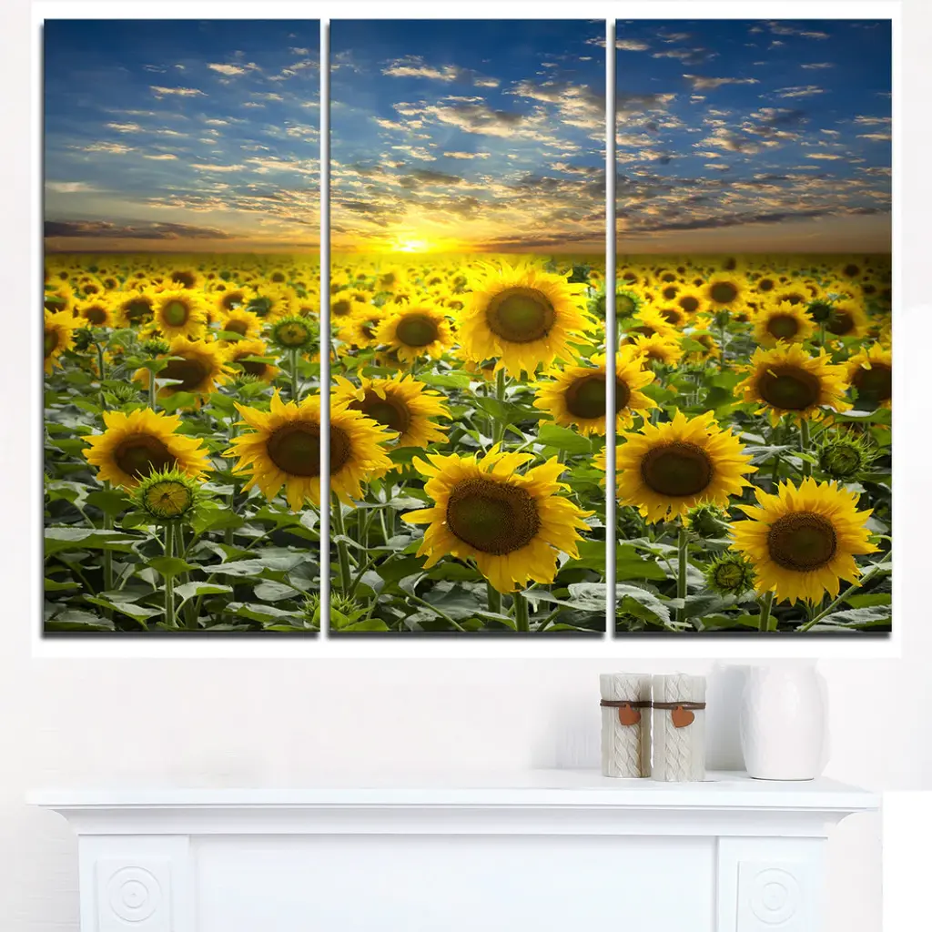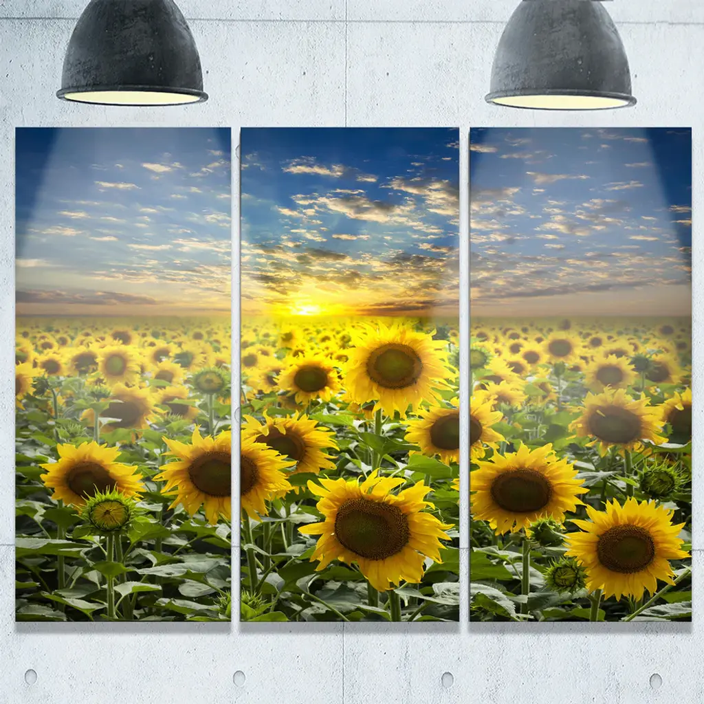 "Field Of Blooming Sunflowers" Metal Wall Art, 3 Panels, 36"x28"