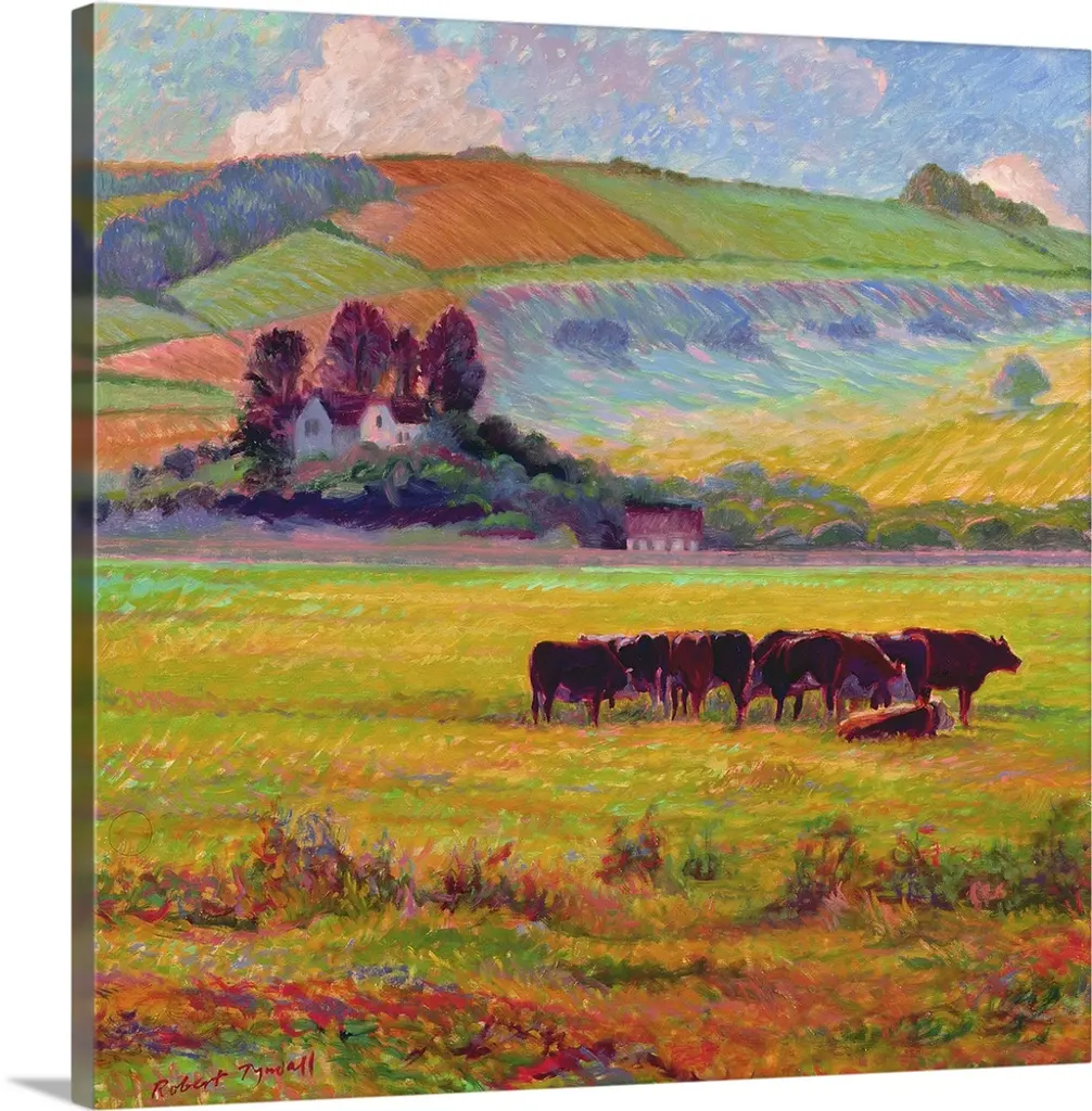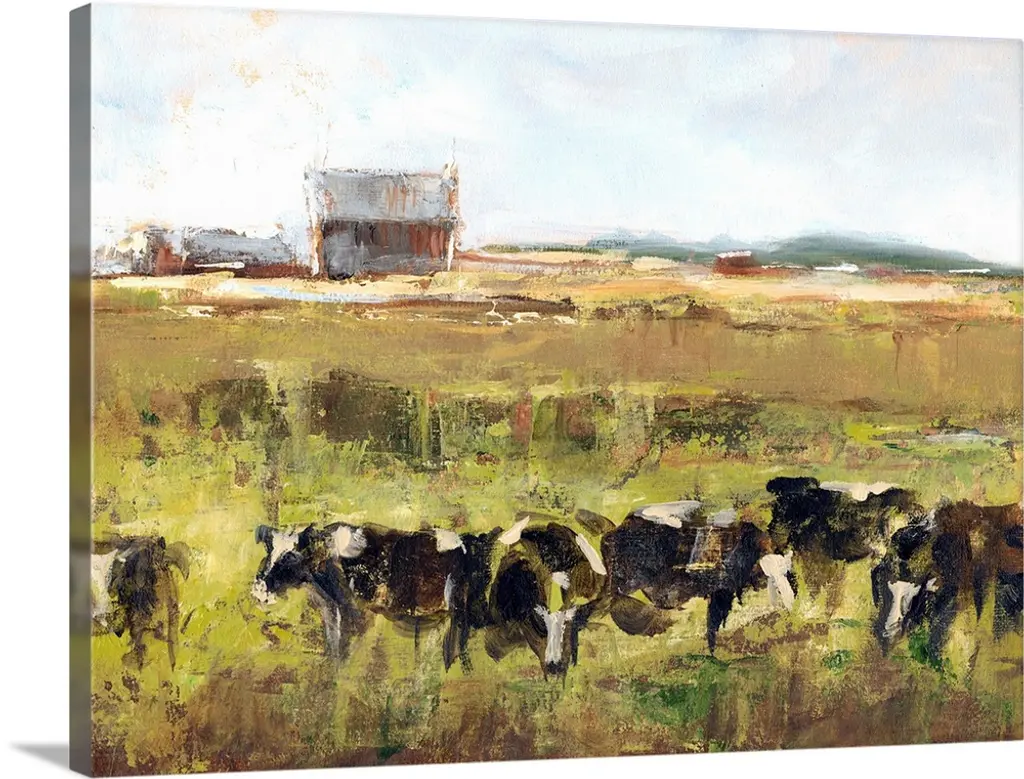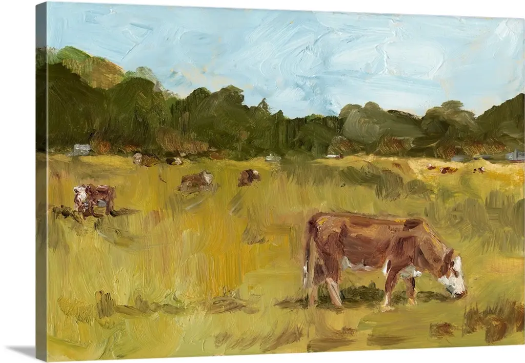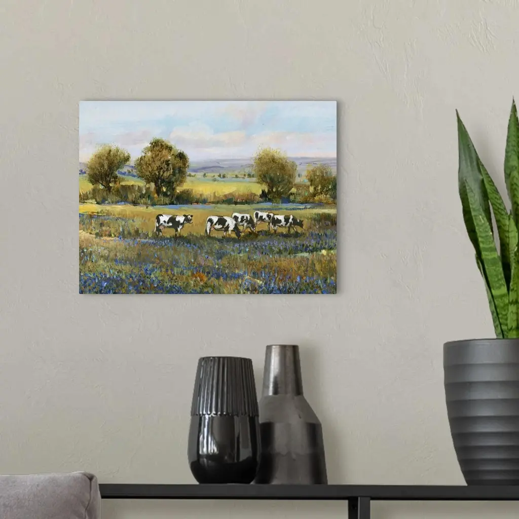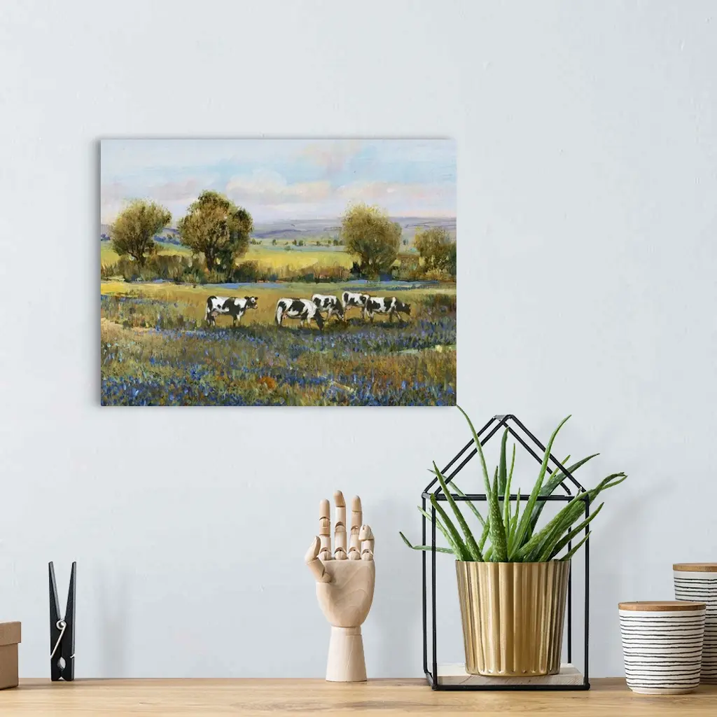 Contemporary artwork of a calm countryside filled with grazing cows and blue flowers created with nimble brush strokes.