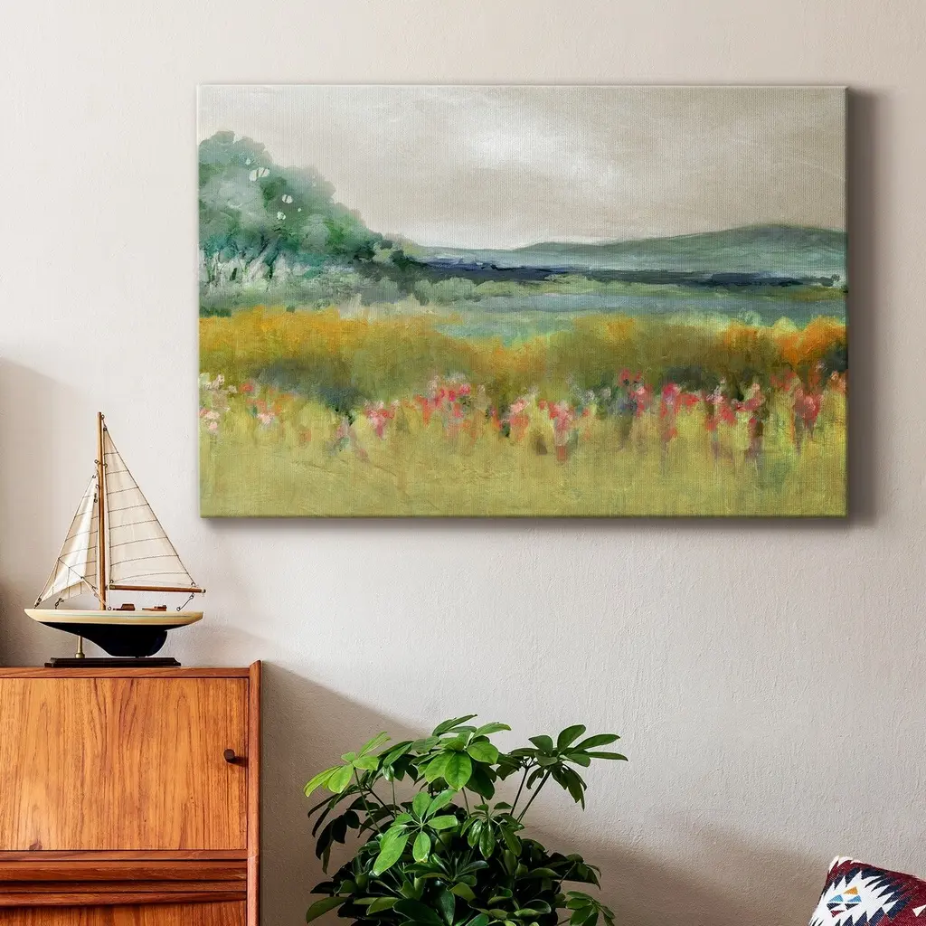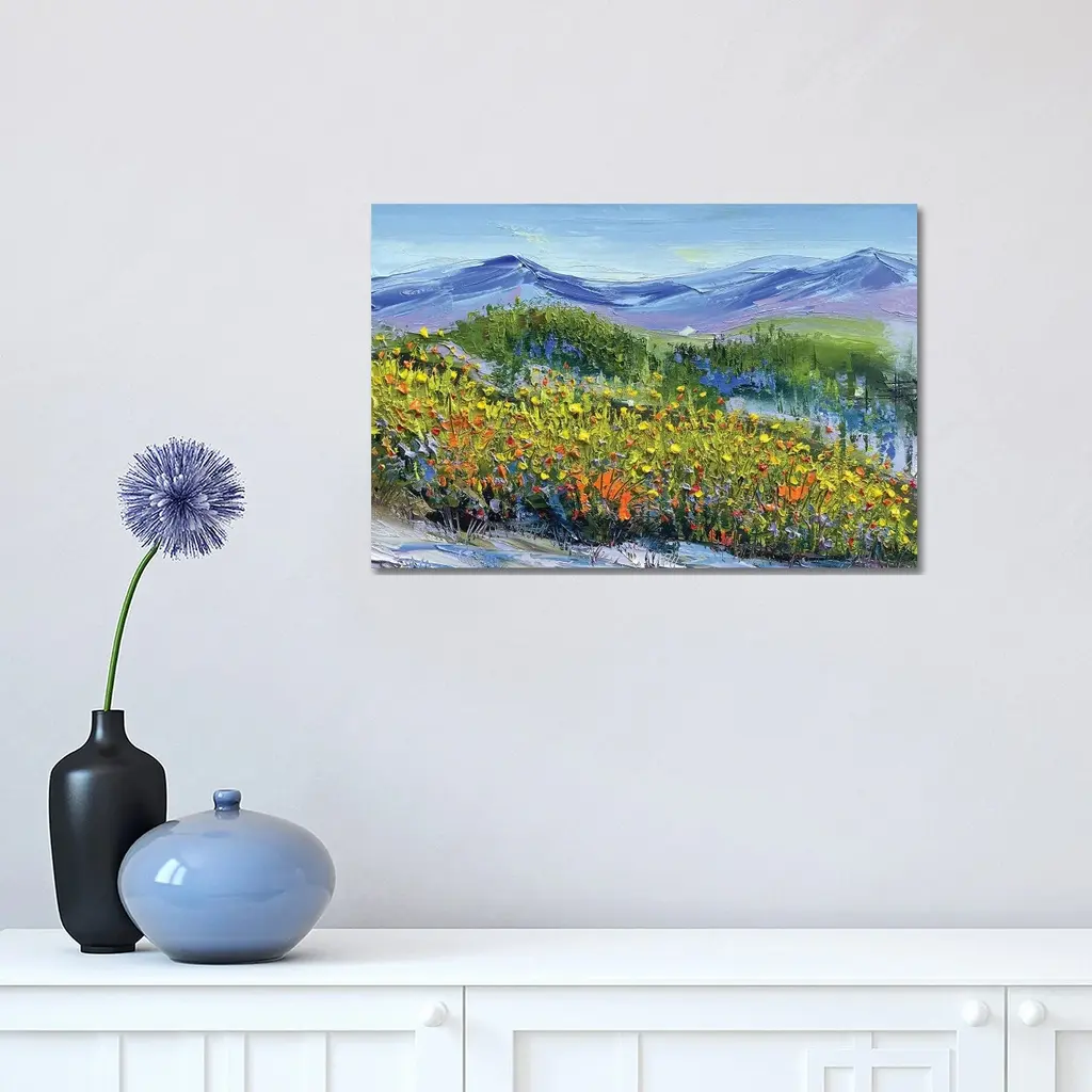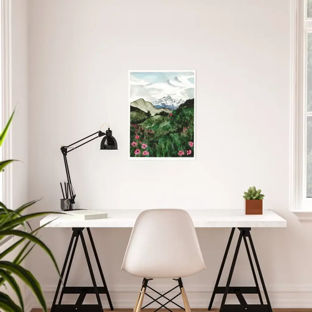 Field Of Flowers And Mountains Dreamy Watercolor, Landscape Painting Poster