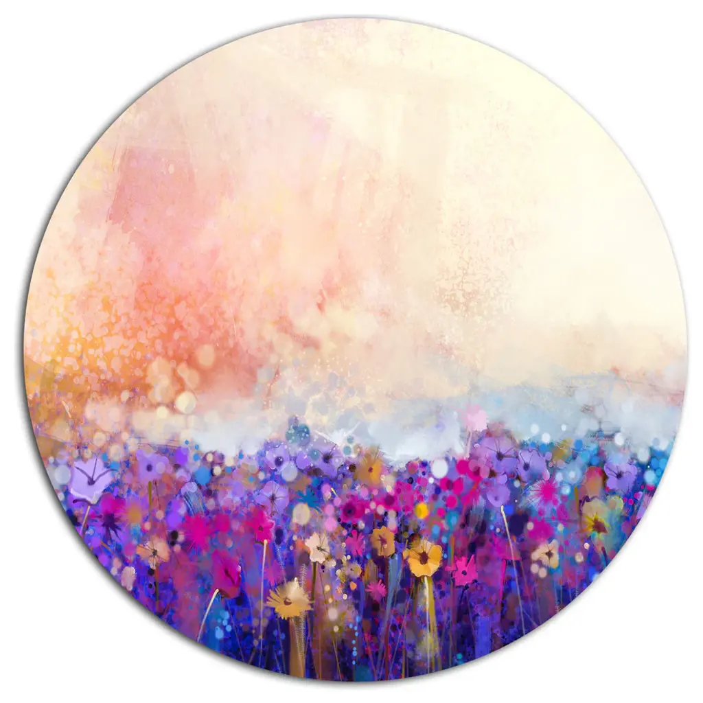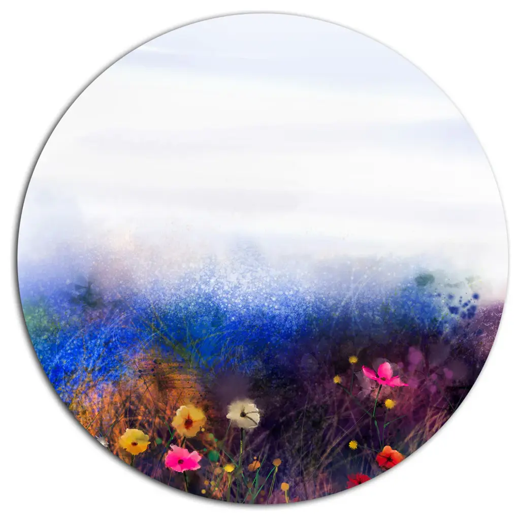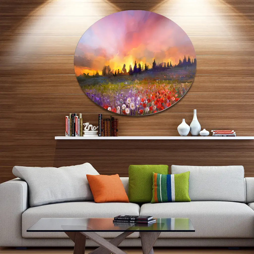 Bring Contemporary Abstraction to your home with this large Circle Metal wall art. This Field of Poppy Dandelion and Daisy Metal Artwork makes it the focal point of any room or office. - White Gloss Coating ensures colors are extra vibrant with light reflection.- Aluminum grade Sheet Metal with 1 inch mounting frame on the back giving the illusion that the artwork is floating on the wall..- Mounting Brackets are included along with instructions.- High Quality Digital images are created directly into a glossy aluminum panel producing a stunning and captivating print into the glossy finish of the metal.- Water, Fire and Scratch resistant HD Aluminum panels.- Looks better than any photo paper and guaranteed to last at least 20 years- Easy to clean with a microfiber cloth. Colors are far superior to regular Canvas Art. - Easy to Hang