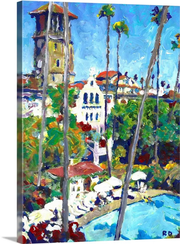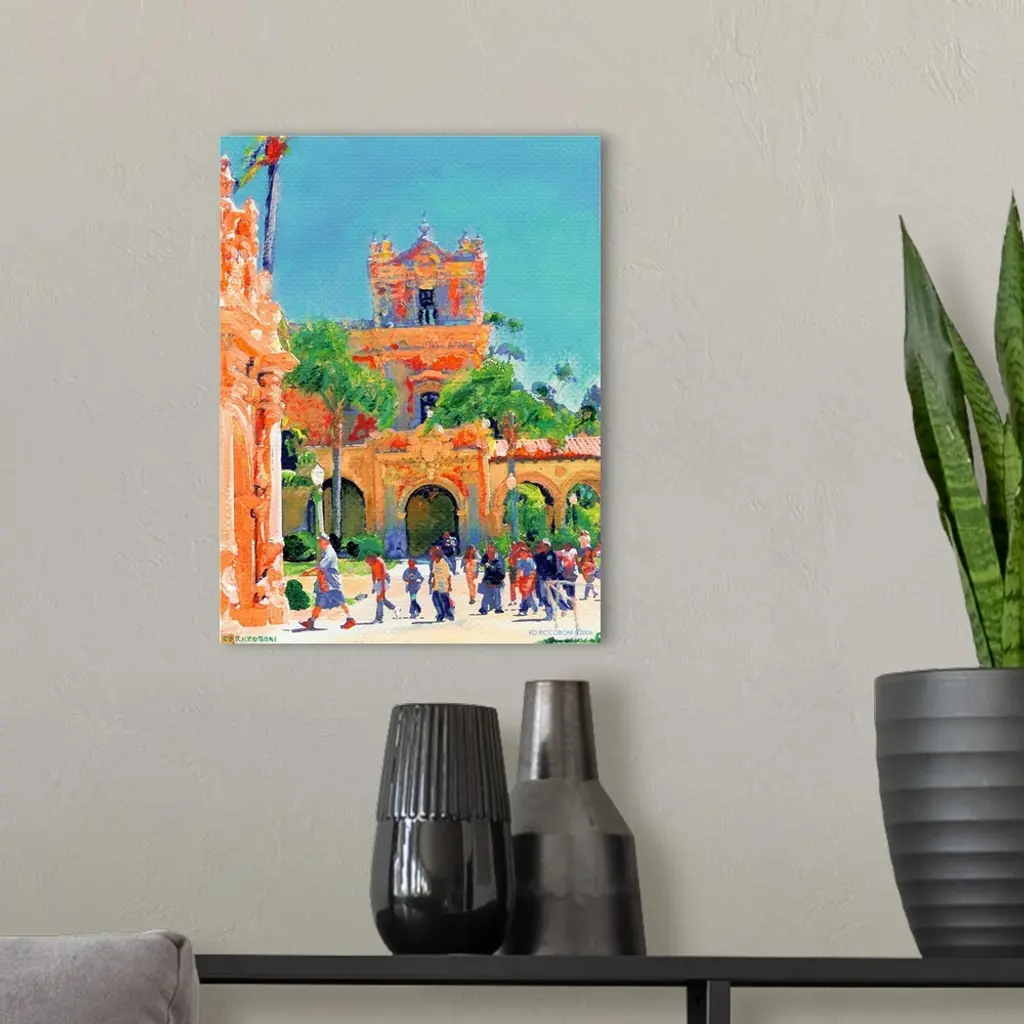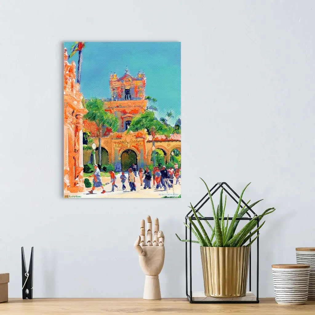 Field Trip, painting by american artist RD Riccoboni takes place in San Diego California Balboa Park. Beautiful Spanish Colonial architecture in bright colors make this location a favorite for the artist to paint.