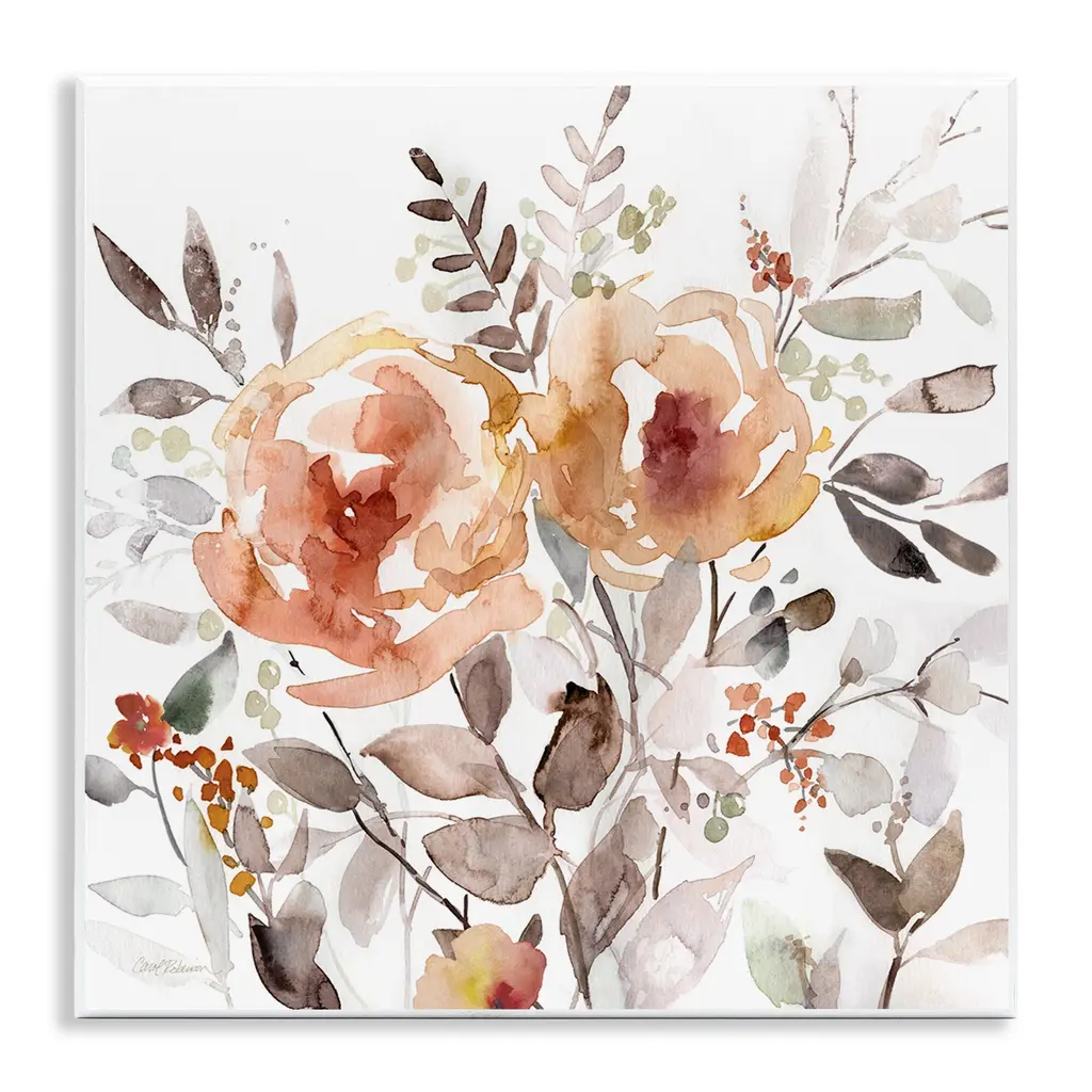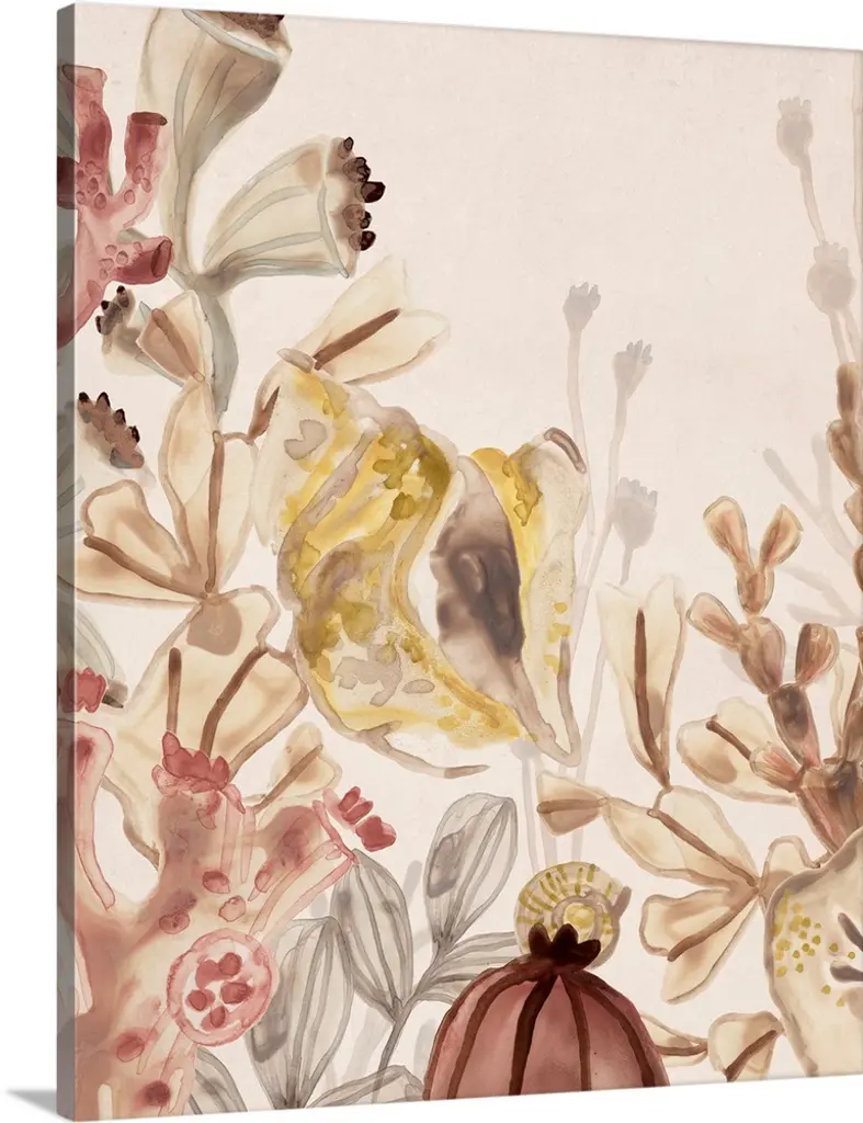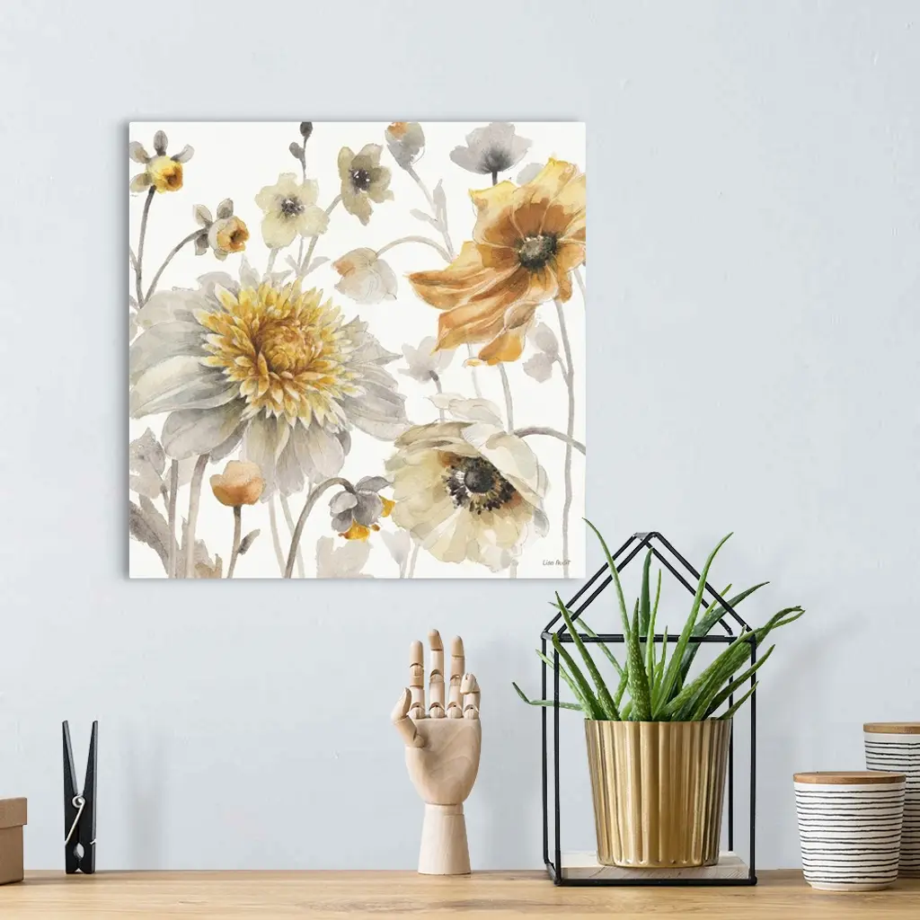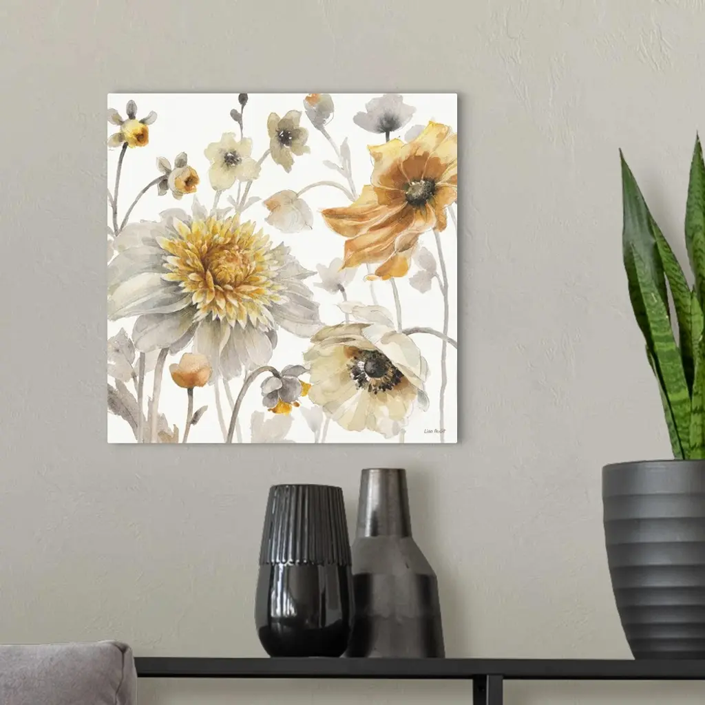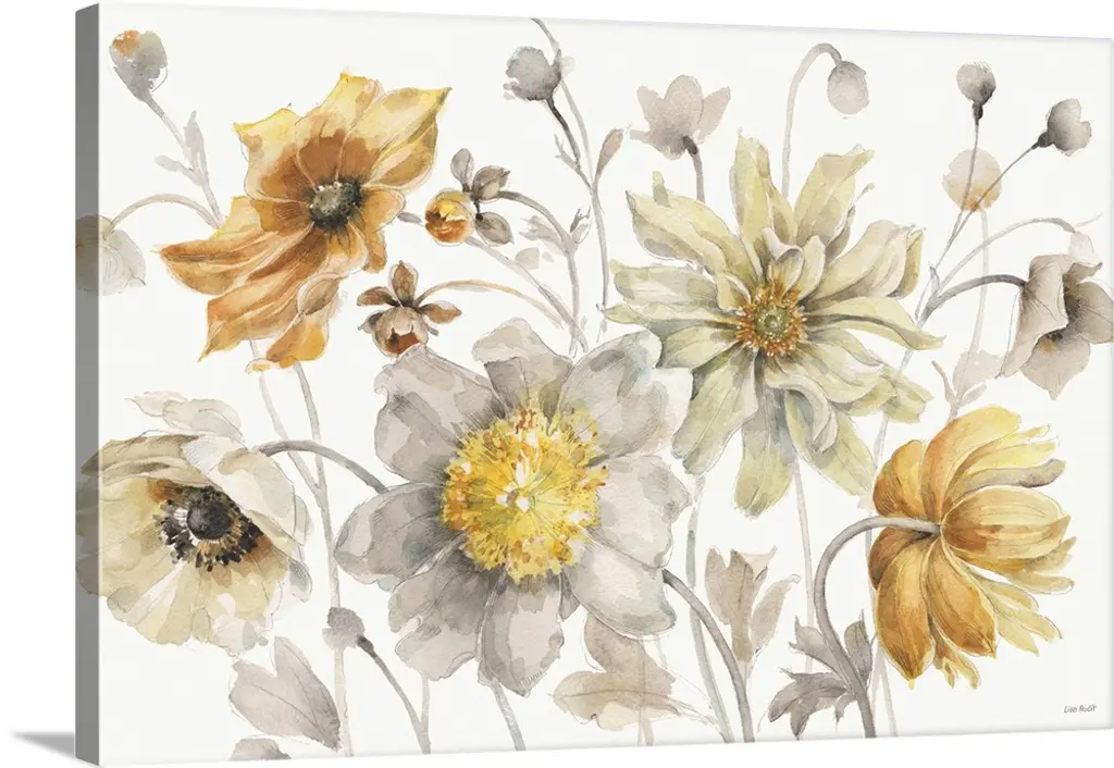 Decorative artwork of group of flowers in muted tones of gold, yellow and gray.