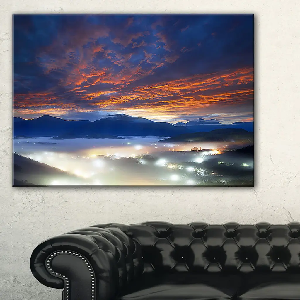 The Fiery Clouds and Lit-up Villages canvas art print is sure to make an impression on anyone who sees it. This artwork is gallery wrapped around a 1-inch solid wood frame and arrives carefully packaged and entirely ready to hang on the wall. Design Art only uses the highest resolution and pigments to ensure a crisp colorful print that is never faded or pixelated. This artwork is sure to be a conversation starter in any home or office.