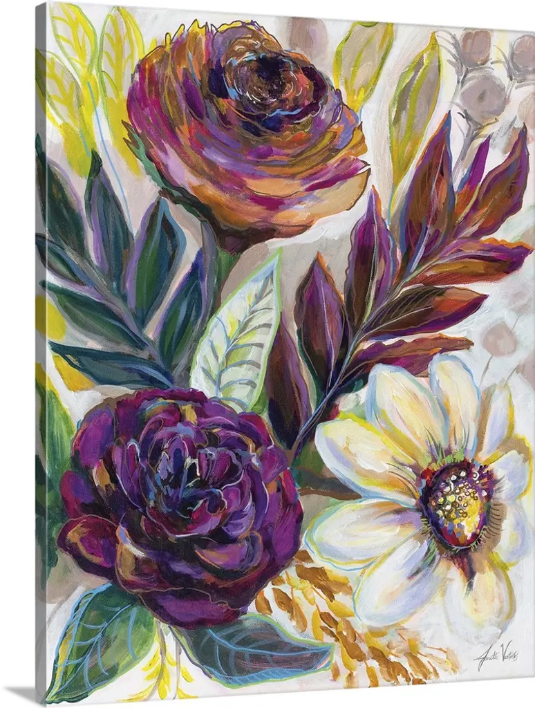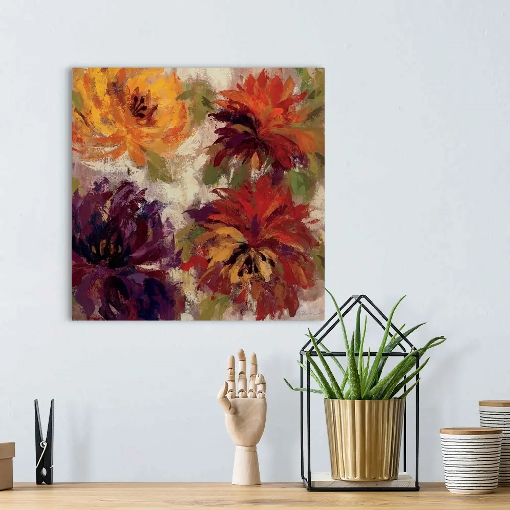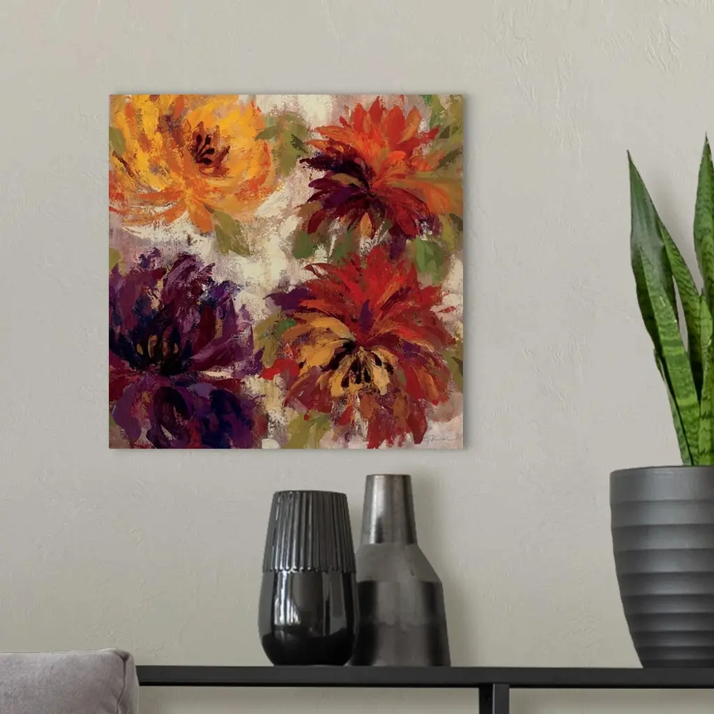 Contemporary artwork of different colored flowers close-up in the frame of the image.