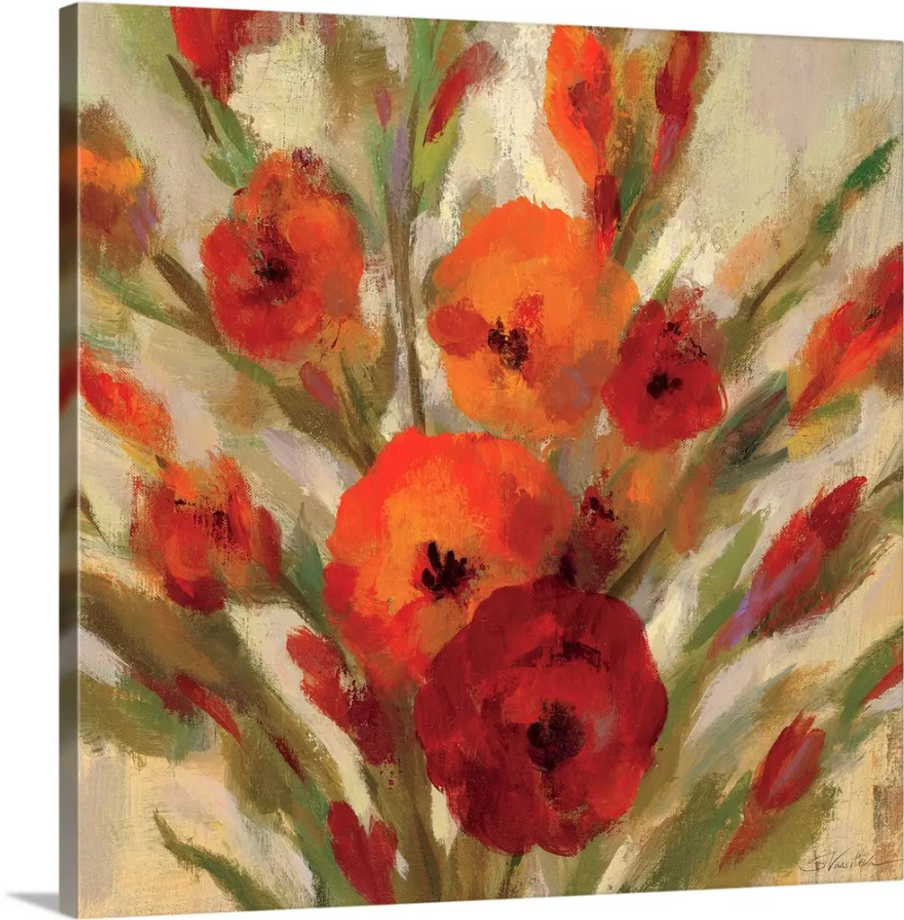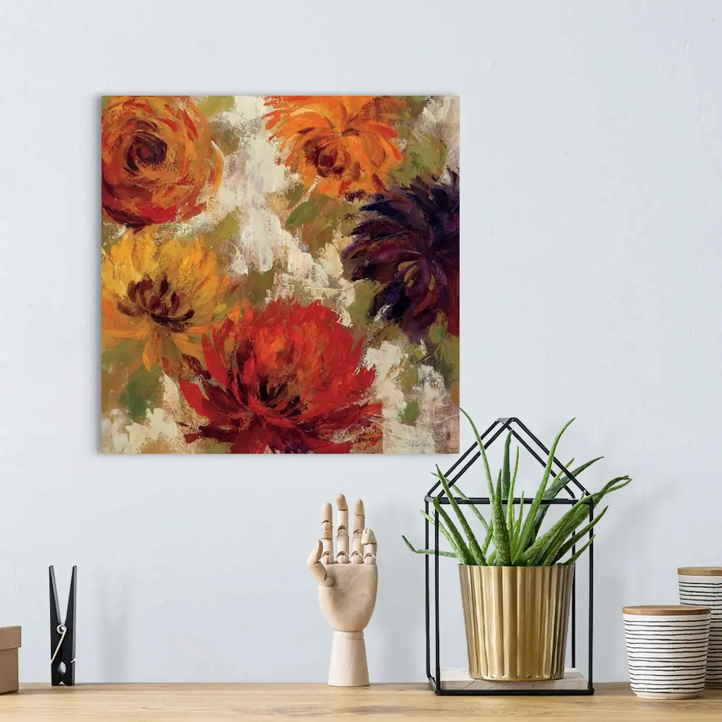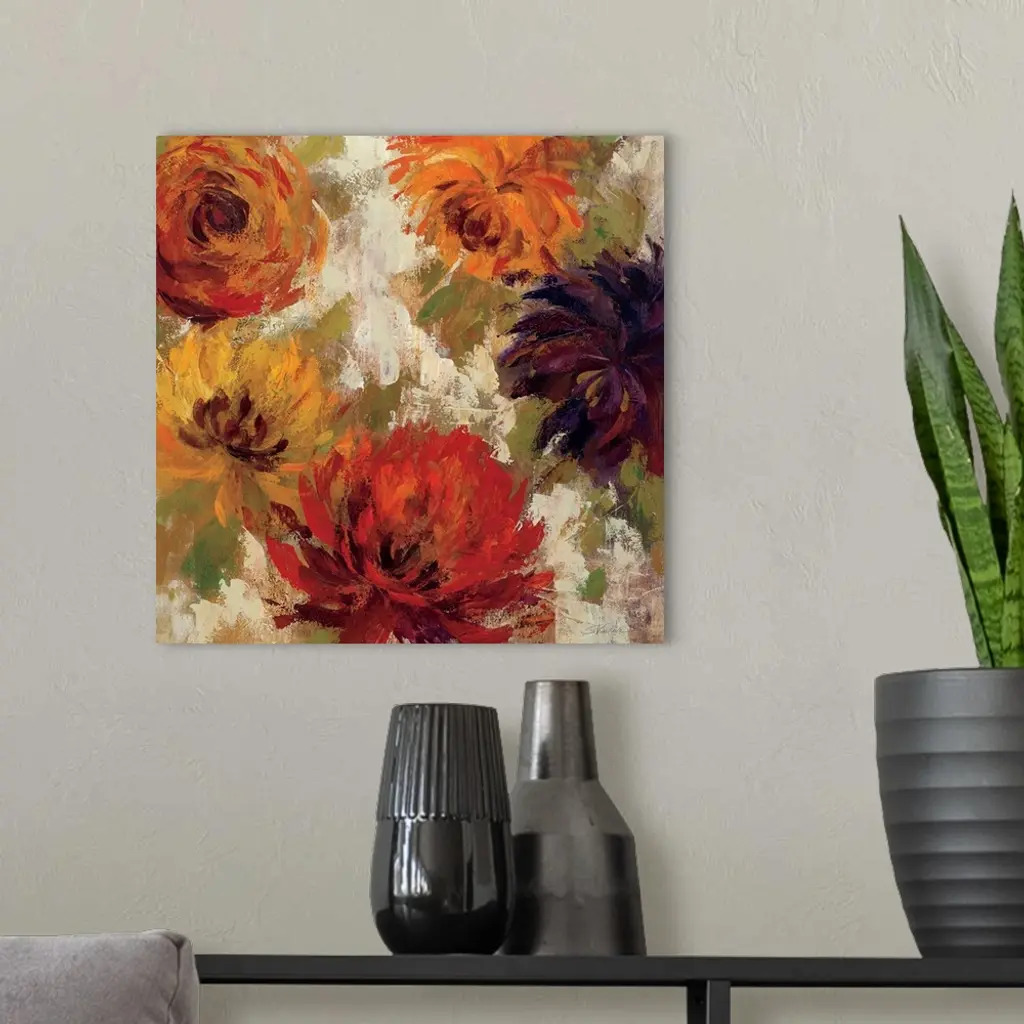 Contemporary artwork of different colored flowers close-up in the frame of the image.
