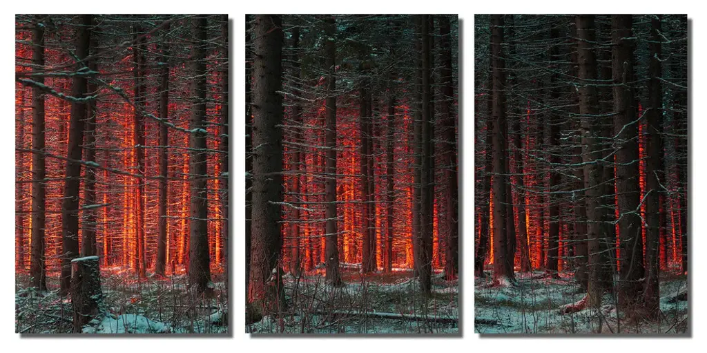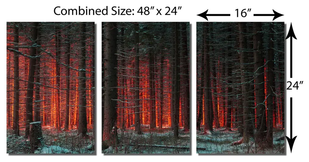 48" x 24" total size. Ready To Hang! (3 pieces - 16" x 24" each). 3 Panel Split (Triptych) Metal Print of a fiery red colored dark, creepy forest. Modern metal wall art for home or office wall decor & interior design. Printed on Luxurious, HD aluminum glossy metal panels. Multi panel art.. HD aluminum panels. Metal print wall art. Includes Shadow Wall Mount on the back.• Aluminum Metal Wall Art• Made in USA• Ready to hang - No assembly required• Shadow mount hardware on the back• 0.045" thick HD Aluminum Panels• Scratch resistant, glossy finish• Superb color clarity, luxurious prints• Epson printing process• For indoor or moisture rich environment use• Easy to clean. Gently wipe with microfiber cloth.