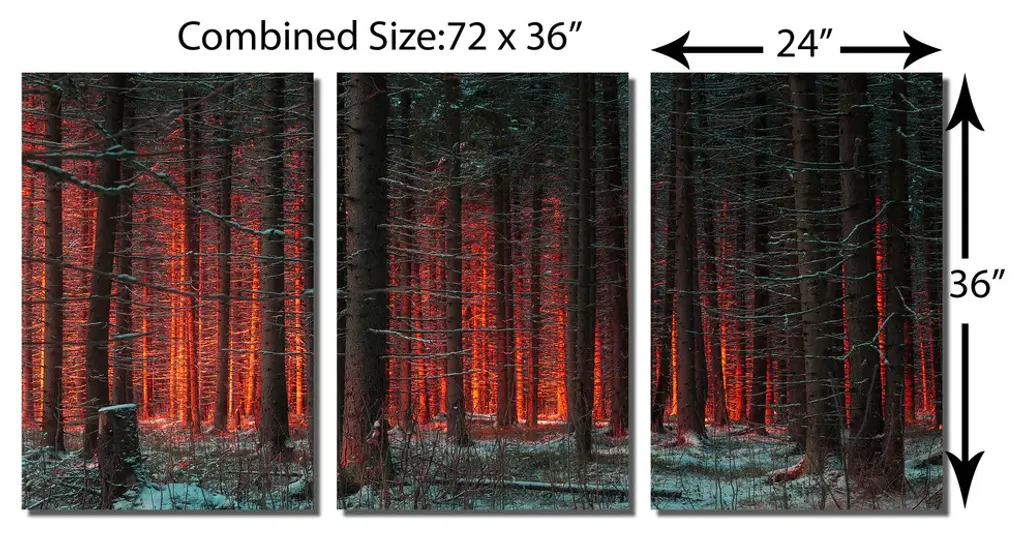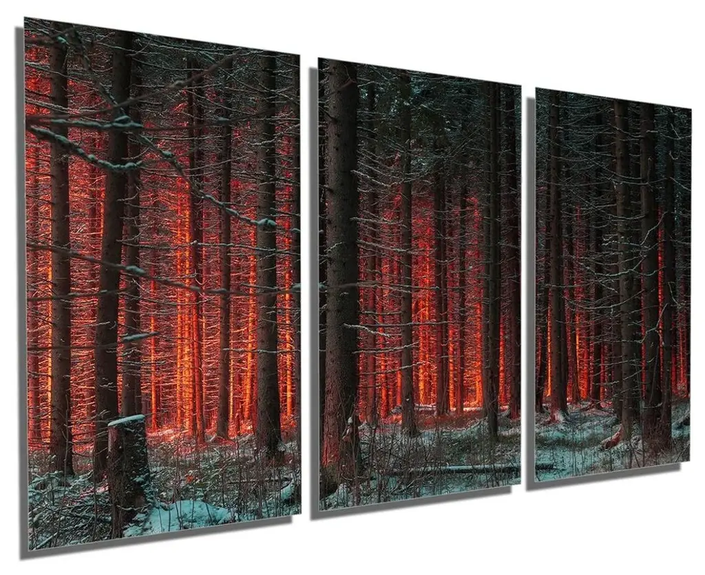 72" x 36" total size. Ready To Hang! (3 pieces - 24" x 36" each). 3 Panel Split (Triptych) Metal Print of a fiery red colored dark, creepy forest. Modern metal wall art for home or office wall decor & interior design. Printed on Luxurious, HD aluminum glossy metal panels. Multi panel art.. HD aluminum panels. Metal print wall art. Includes Shadow Wall Mount on the back.• Aluminum Metal Wall Art• Made in USA• Ready to hang - No assembly required• Shadow mount hardware on the back• 0.045" thick HD Aluminum Panels• Scratch resistant, glossy finish• Superb color clarity, luxurious prints• Epson printing process• For indoor or moisture rich environment use• Easy to clean. Gently wipe with microfiber cloth.