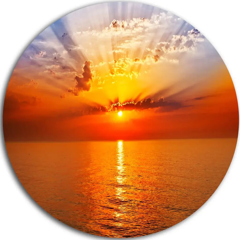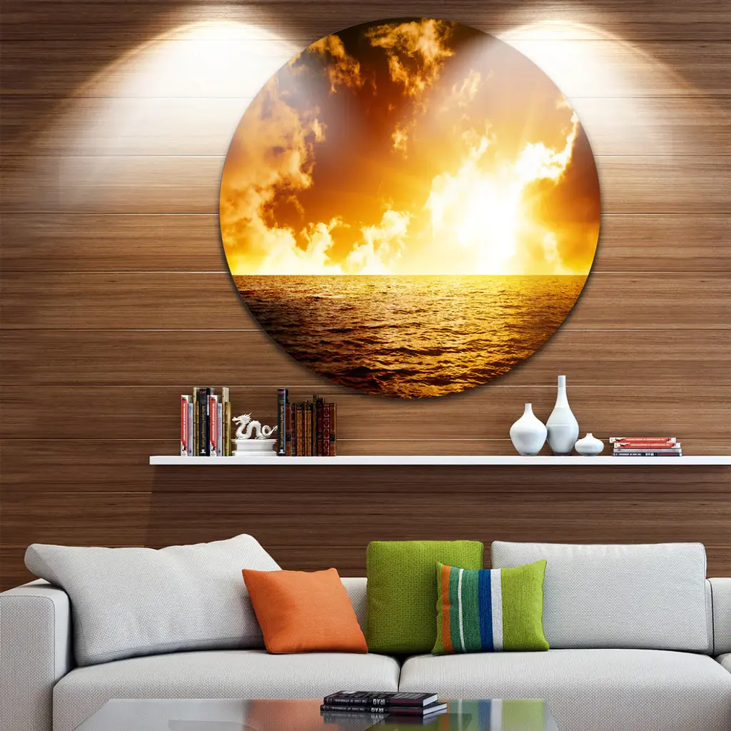 Bring Contemporary Abstraction to your home with this large Circle Metal wall art. This Fiery Sunlight in Beach during Sunset Metal Artwork makes it the focal point of any room or office. - White Gloss Coating ensures colors are extra vibrant with light reflection.- Aluminum grade Sheet Metal with 1 inch mounting frame on the back giving the illusion that the artwork is floating on the wall..- Mounting Brackets are included along with instructions.- High Quality Digital images are created directly into a glossy aluminum panel producing a stunning and captivating print into the glossy finish of the metal.- Water, Fire and Scratch resistant HD Aluminum panels.- Looks better than any photo paper and guaranteed to last at least 20 years- Easy to clean with a microfiber cloth. Colors are far superior to regular Canvas Art. - Easy to Hang