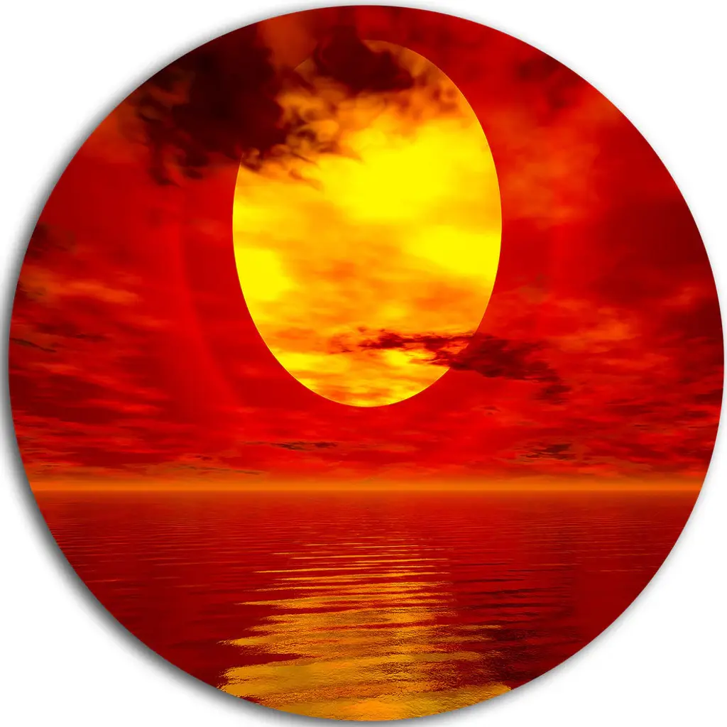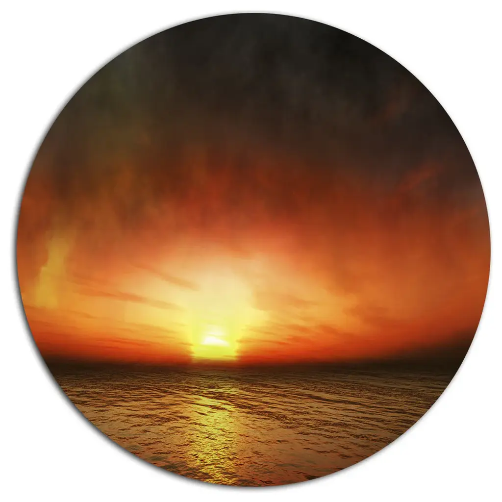 Bring Contemporary Abstraction to your home with this large Circle Metal wall art. This Fiery Sunset Beach under Cloudy Sky Metal Artwork makes it the focal point of any room or office. - White Gloss Coating ensures colors are extra vibrant with light reflection.- Aluminum grade Sheet Metal with 1 inch mounting frame on the back giving the illusion that the artwork is floating on the wall..- Mounting Brackets are included along with instructions.- High Quality Digital images are created directly into a glossy aluminum panel producing a stunning and captivating print into the glossy finish of the metal.- Water, Fire and Scratch resistant HD Aluminum panels.- Looks better than any photo paper and guaranteed to last at least 20 years- Easy to clean with a microfiber cloth. Colors are far superior to regular Canvas Art. - Easy to Hang