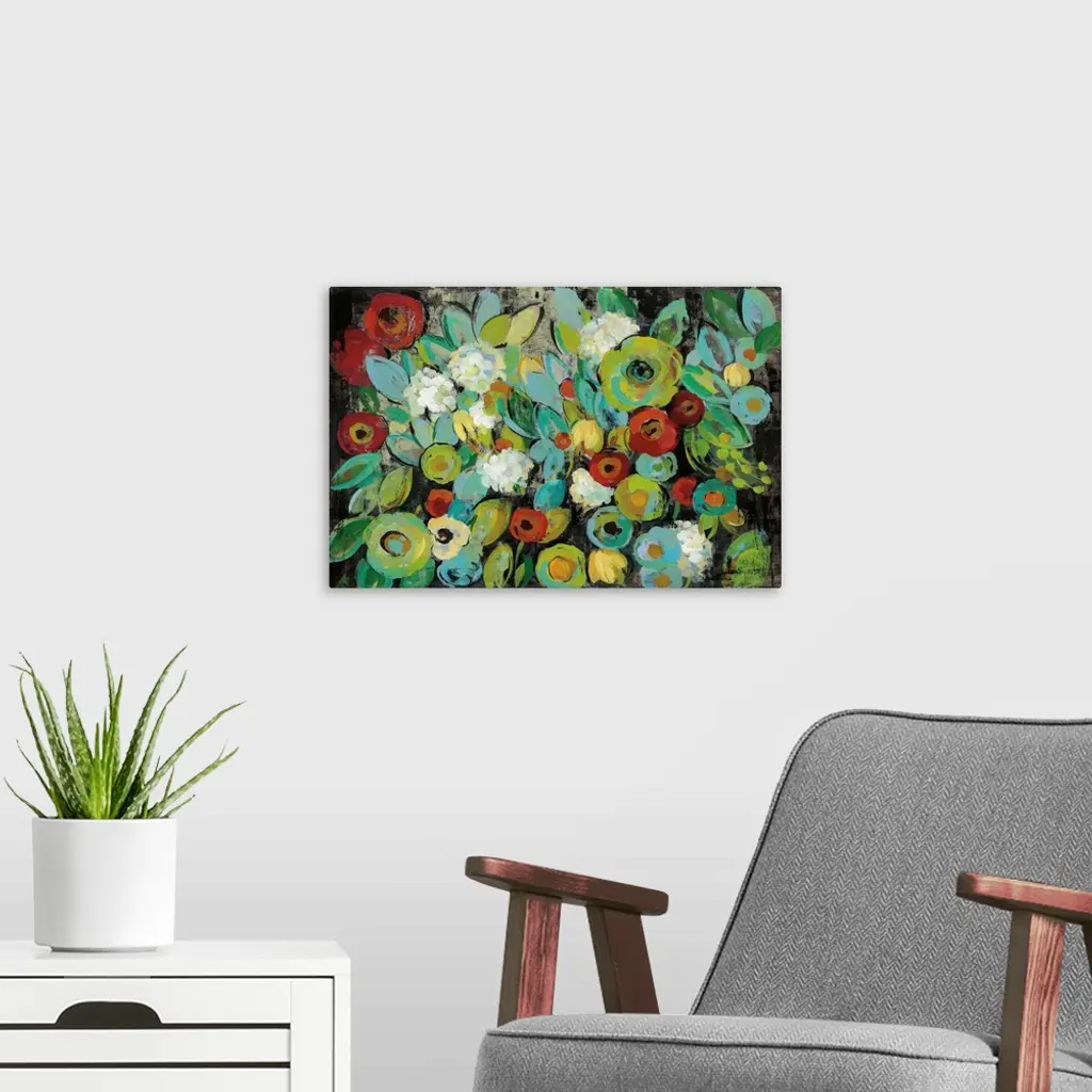 Contemporary floral abstract painting with bright colored flowers on a dark black background.