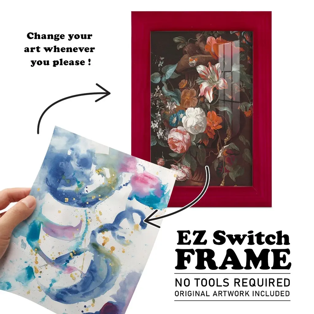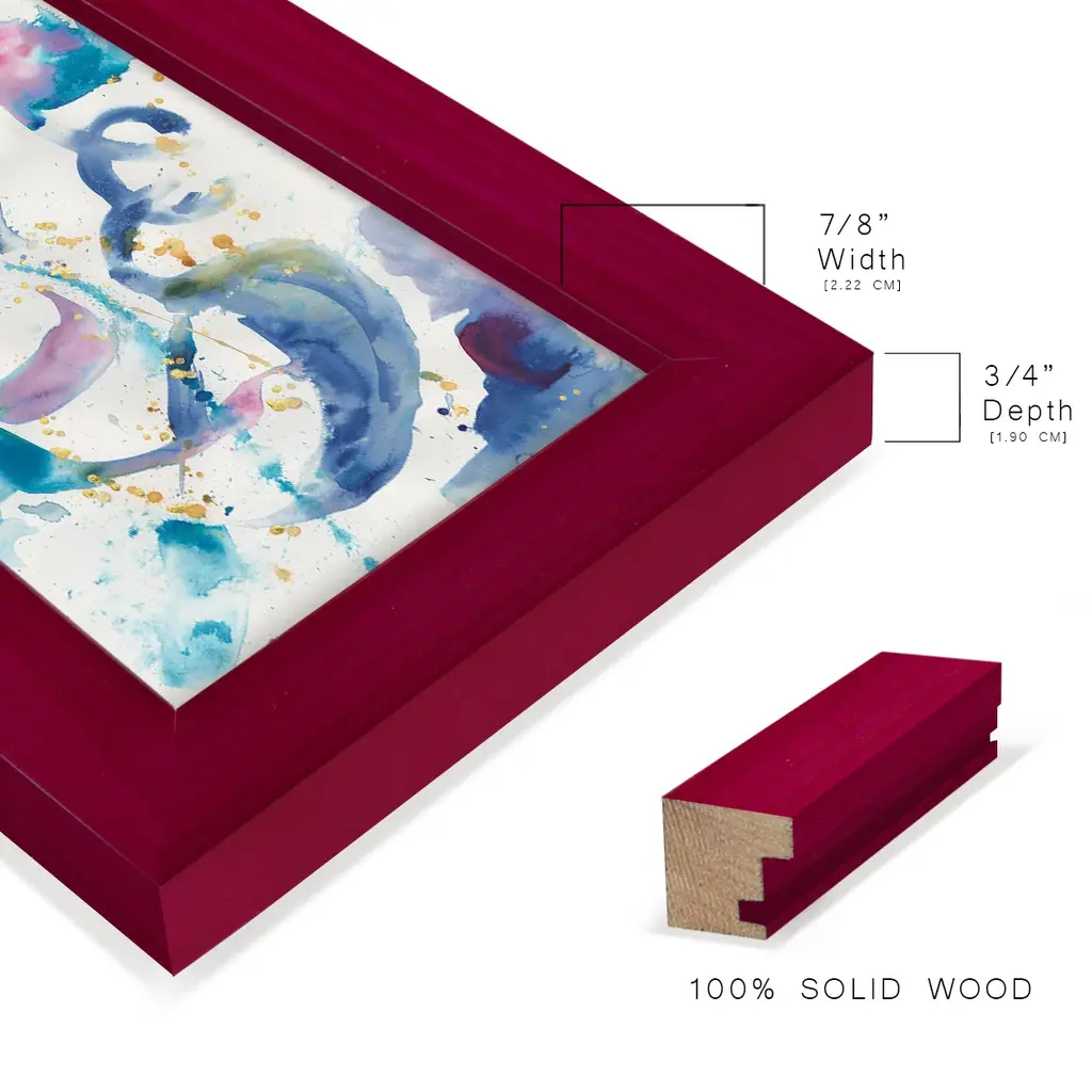 Fiesta I -EZ SWITCH Framed Print w/glass-Cherry Red A delightful, framed print. Featuring a solid wood frame with real wood glass. This premium print is giclee quality. In addition, every frame features a removable back and table top stand. This allows you to change your art in the future or to just stand the art on a table for a new look. We are sure you'll enjoy our new series of EZ SWITCH Framed Art. Solid Wood Frame Real Glass Removable / Replaceable Art Built in Tabletop Stand Sizes range from 4x6 up to 12x15 - buy just one or pair them up as sets as you see fit.