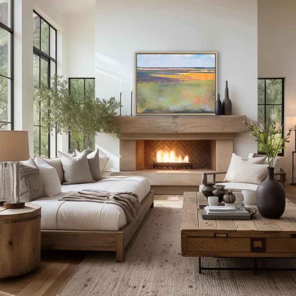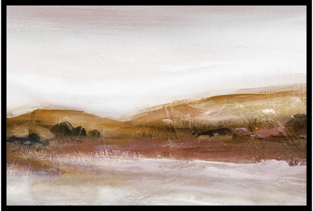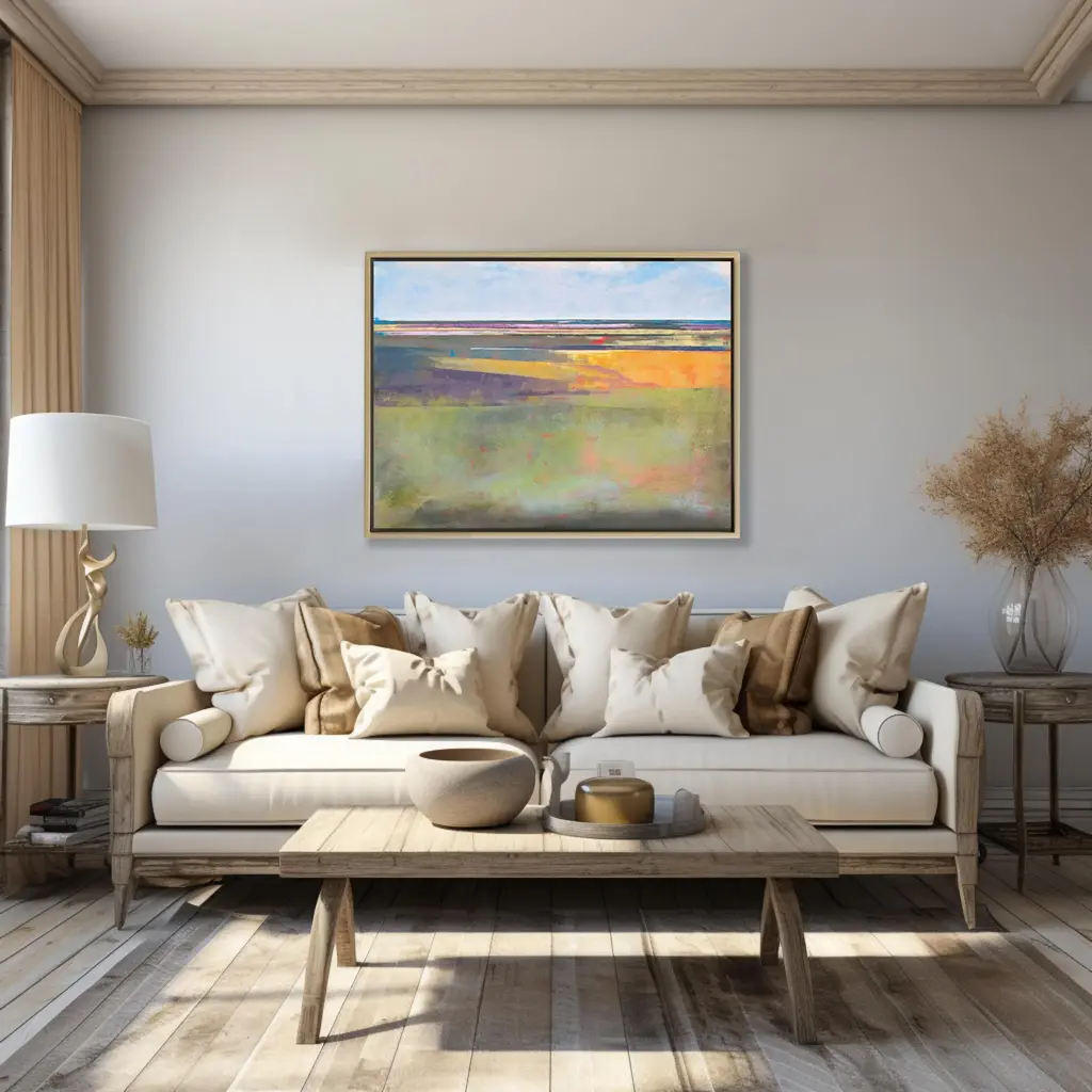 "Fiesta Key" offers a serene blend of color and texture, with soft greens, warm purples, and sky blues layered in horizontal bands that evoke the peaceful meeting of earth and sky. A rich stretch of deep purple melts into warm oranges and yellows, suggesting shifting light or changing terrain and adding a sense of gentle movement. Its rich, atmospheric depth brings calm and balance to any space, making it a perfect centerpiece for creating a soothing, contemplative environment. • Archival giclée print on stretched canvas, with the image wrapping seamlessly around the edges for a clean, gallery‑style finish • Slim, simple natural wood frame option adds subtle warmth without distracting from the artwork • Ships free and arrives wired, ready to elevate your space with style