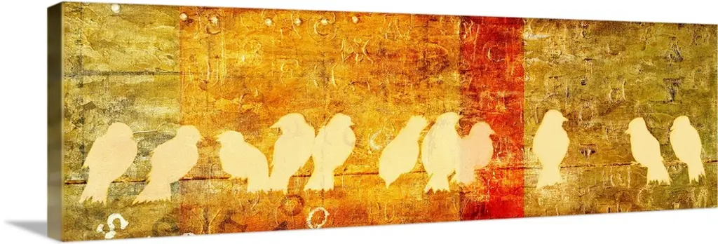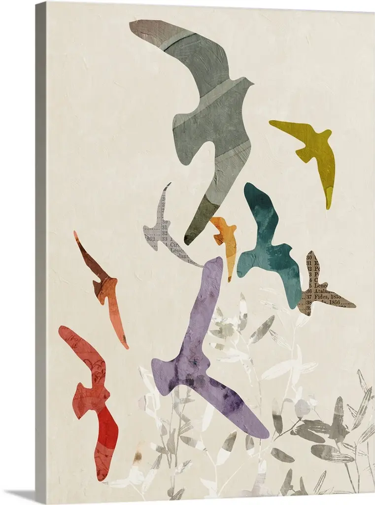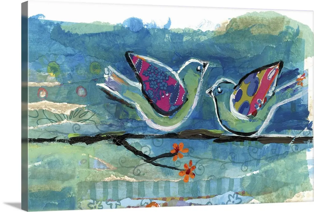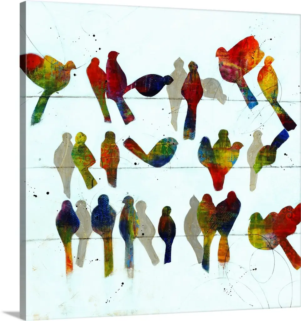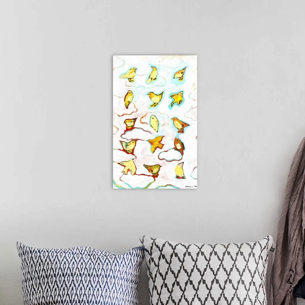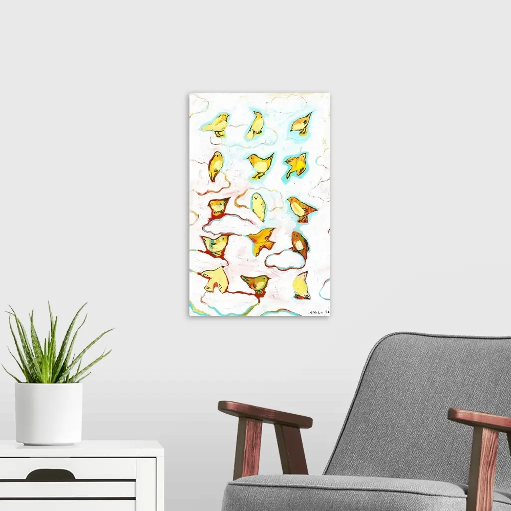 Bright and colorful contemporary painting of birds perched in clouds.