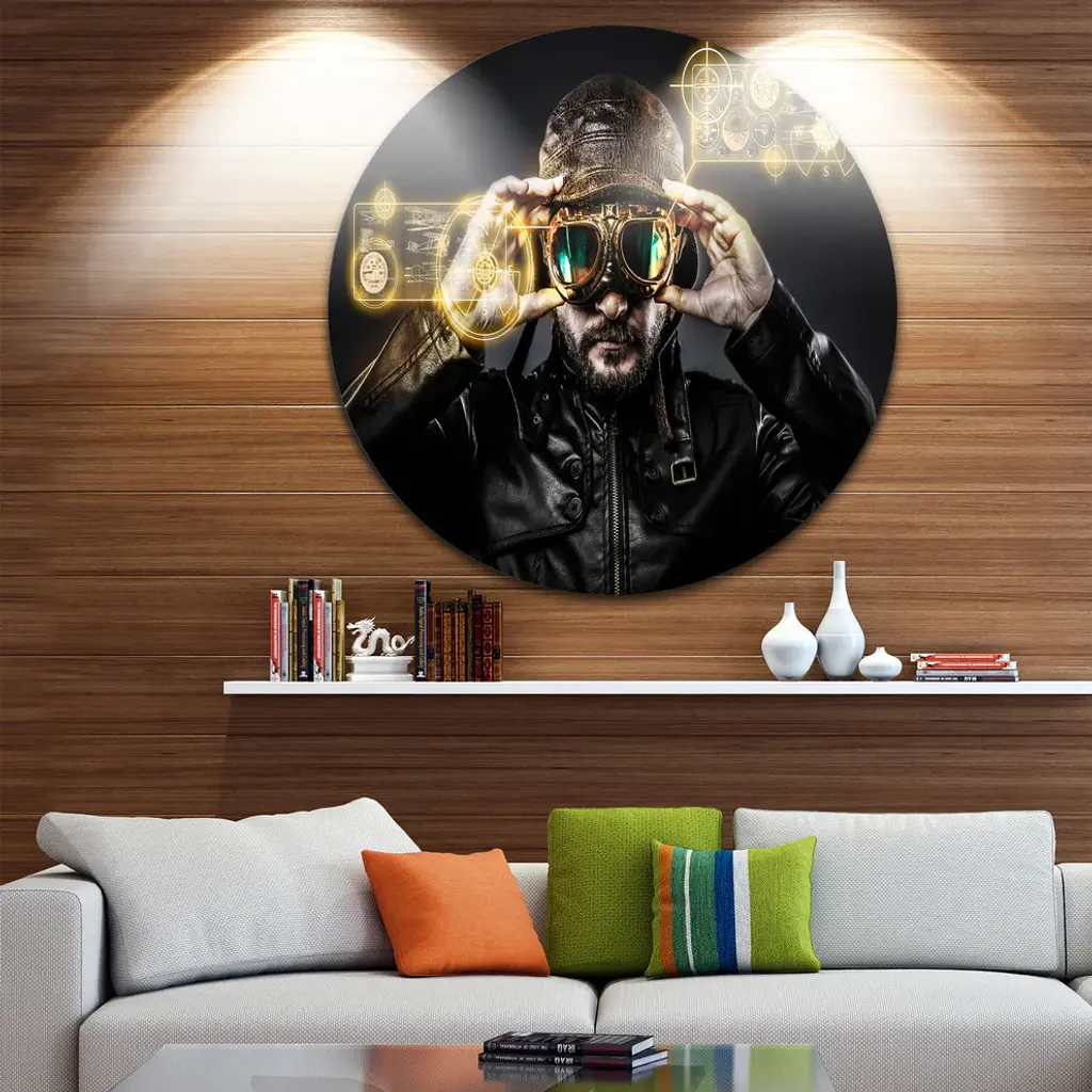 Bring Contemporary Abstraction to your home with this large Circle Metal wall art. This Fighter Pilot with Hat and Glasses Metal Artwork makes it the focal point of any room or office. - White Gloss Coating ensures colors are extra vibrant with light reflection.- Aluminum grade Sheet Metal with 1 inch mounting frame on the back giving the illusion that the artwork is floating on the wall..- Mounting Brackets are included along with instructions.- High Quality Digital images are created directly into a glossy aluminum panel producing a stunning and captivating print into the glossy finish of the metal.- Water, Fire and Scratch resistant HD Aluminum panels.- Looks better than any photo paper and guaranteed to last at least 20 years- Easy to clean with a microfiber cloth. Colors are far superior to regular Canvas Art. - Easy to Hang
