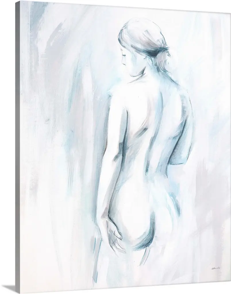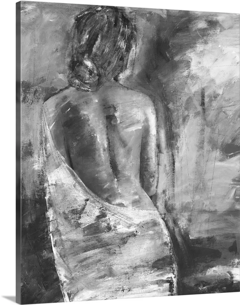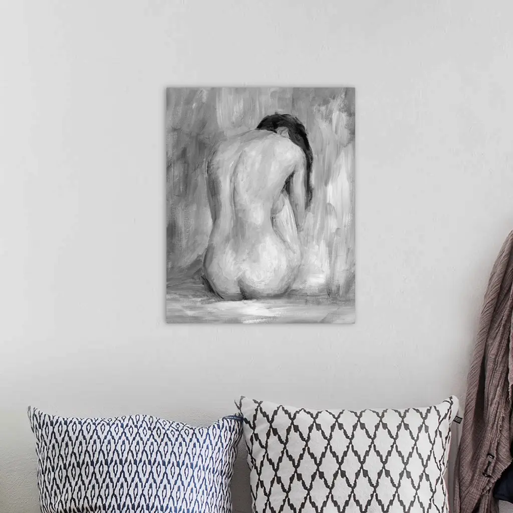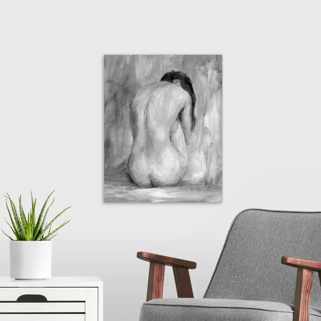 Portrait, large figurative painting of the back of a nude woman sitting on the floor, her head hanging down. Painted in heavy, rough brushstrokes.
