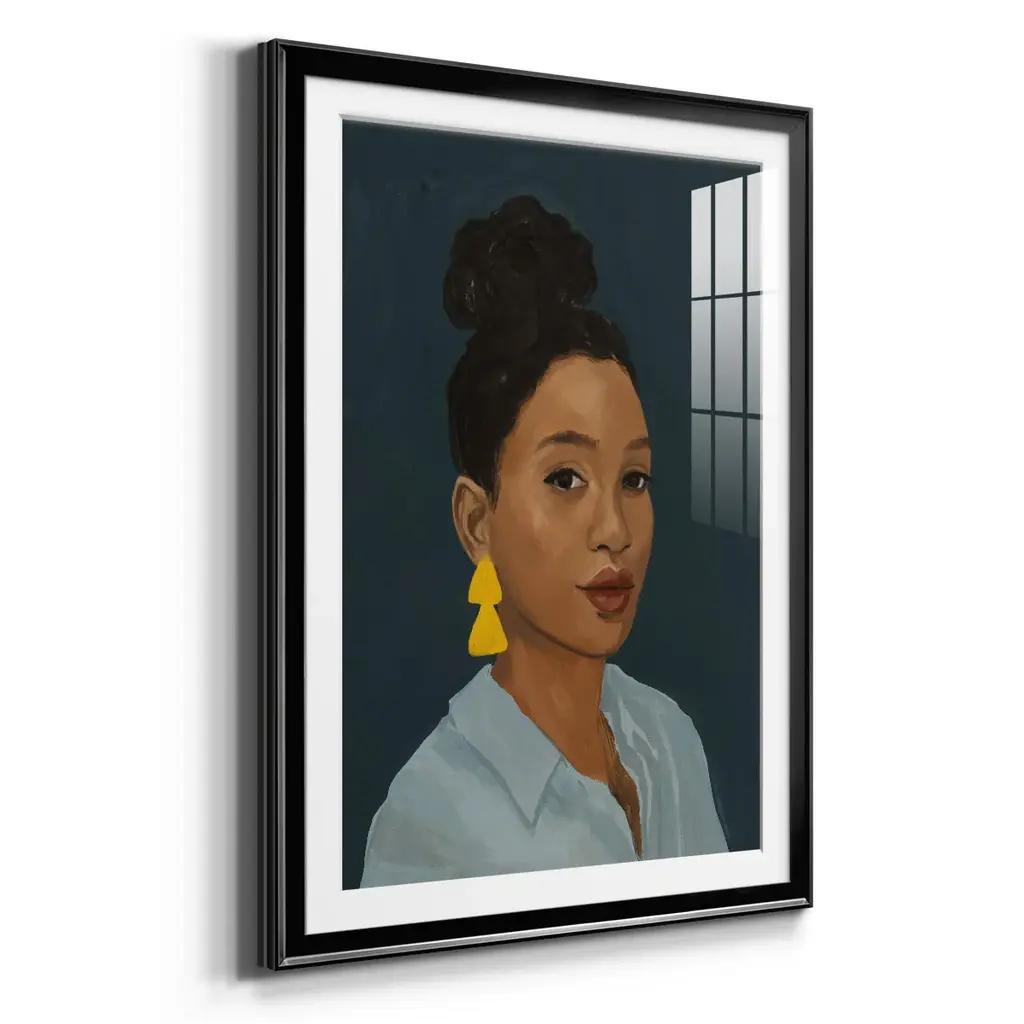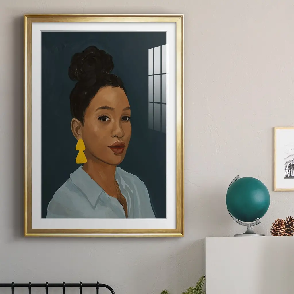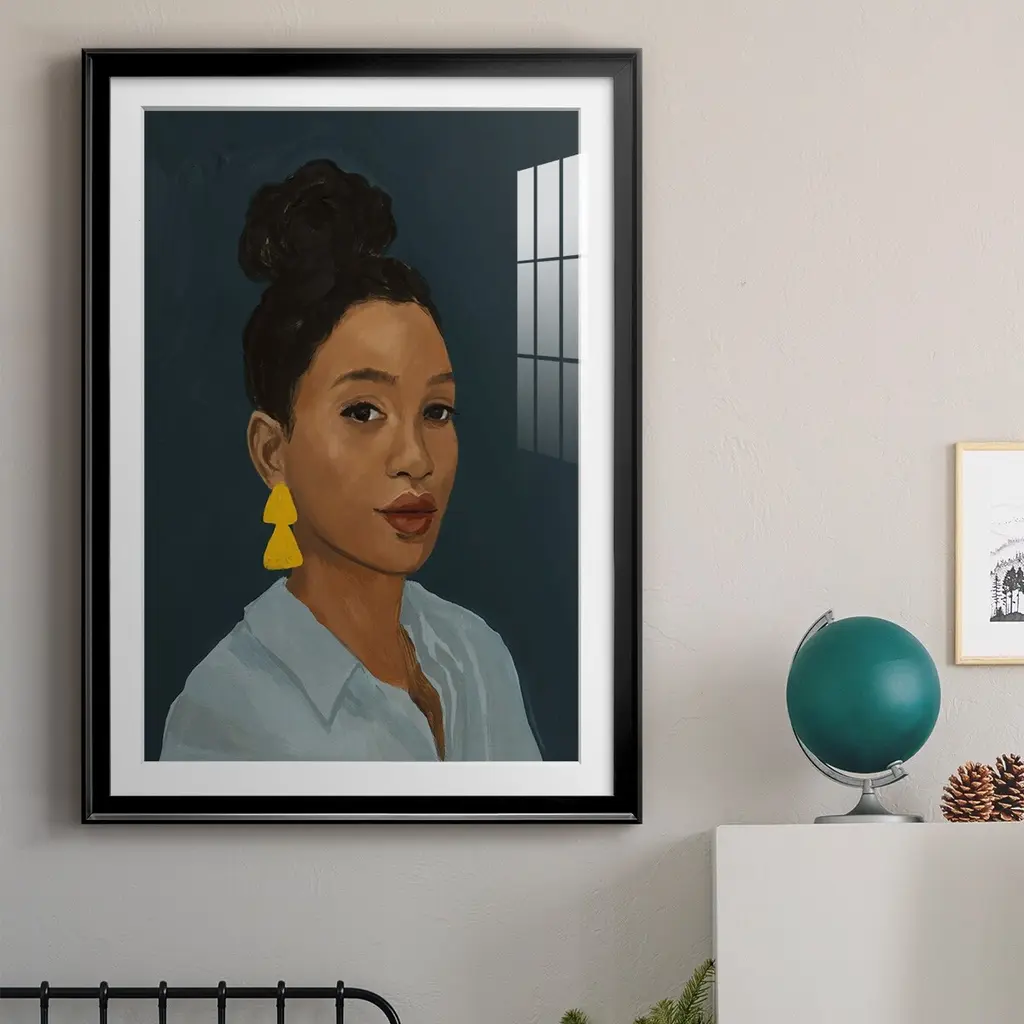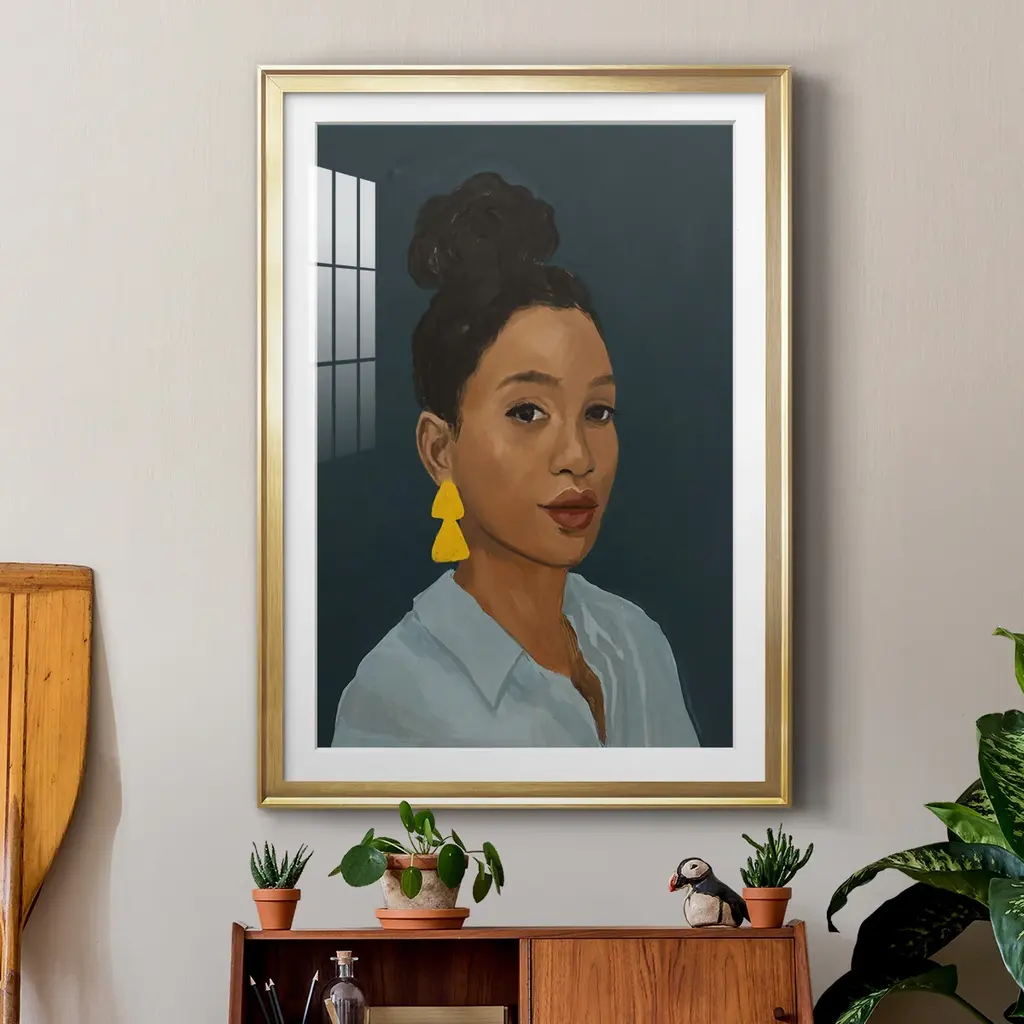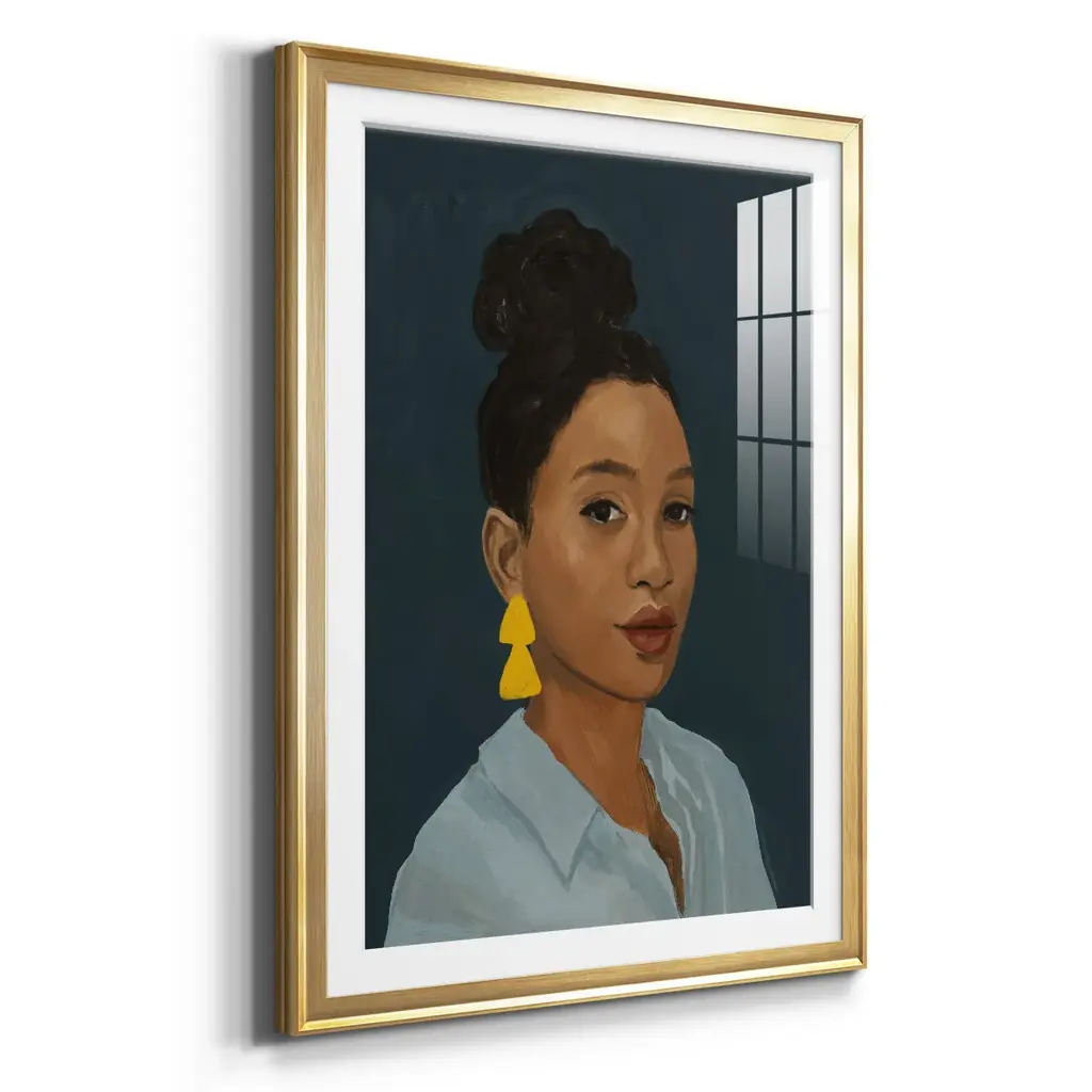 Figure in Yellow Earring Premium Framed Print - Ready to Hang A Premium Framed Print created to last. Framed in distressed wood and available in an array of sizes and colors Featuring a beveled a solid wood stretcher bar, each piece comes ready to hand 4 SIZES AVAILABLE 30.5''X42.5'' - Overall Size 26.5'X36.5'' - Overall Size 22.5''x30.5'' - Overall Size 18.5''x24.5'' - Overall Size Each piece is made to order. Each piece comes with hanging hardware. Made in the USA Ready to Hang Giclee Paper Print Acrylic Glass Beveled Matt Board