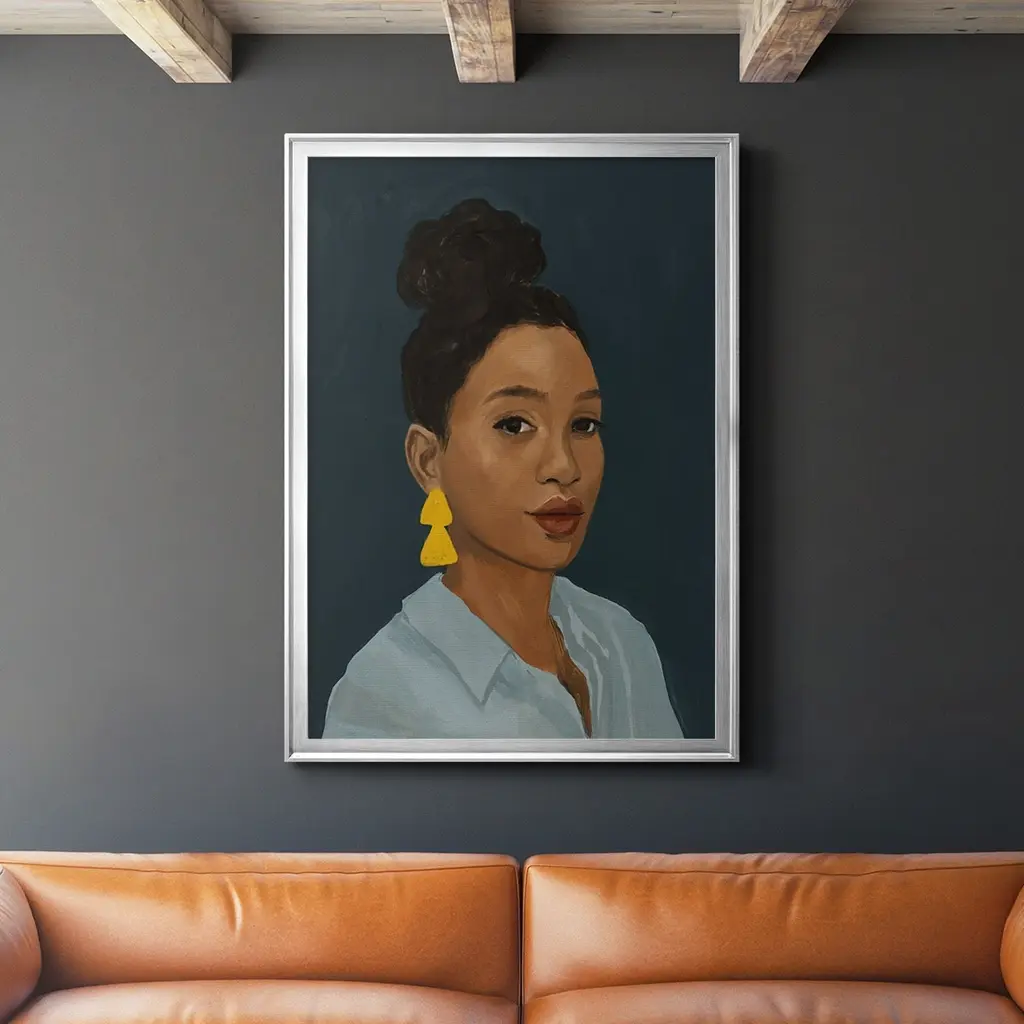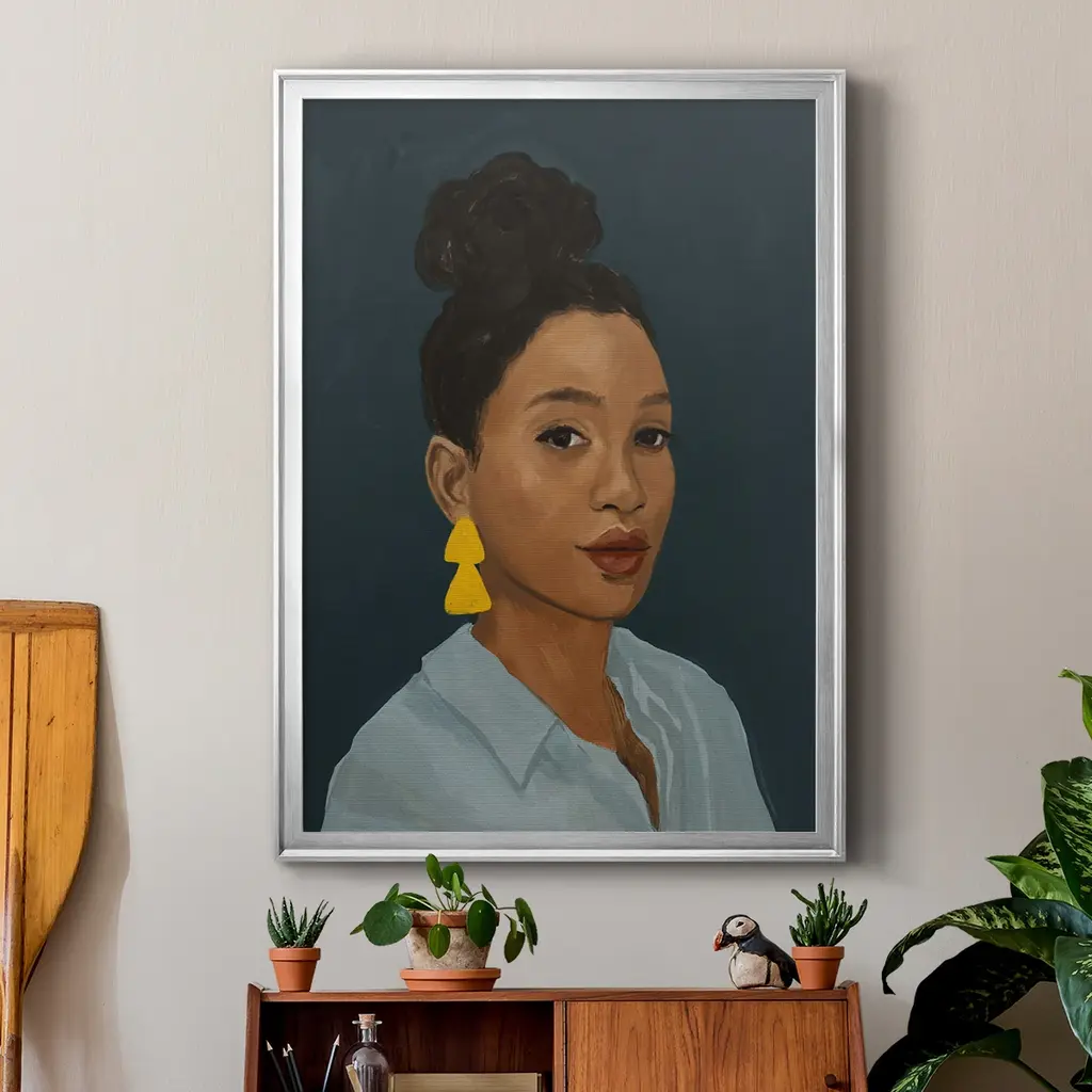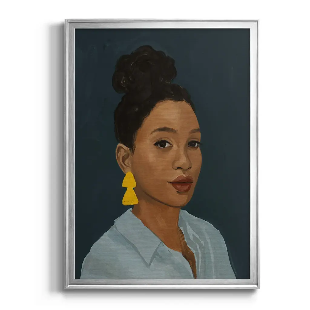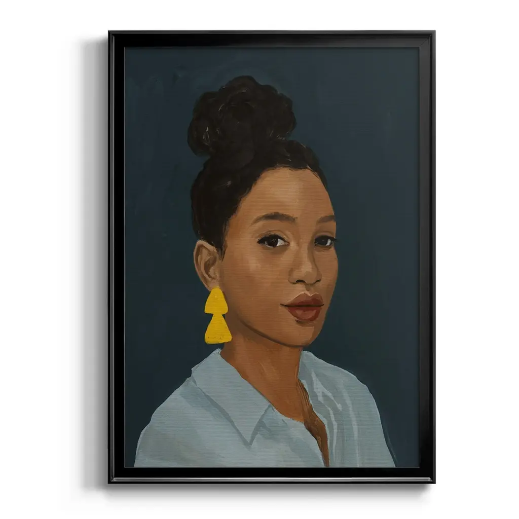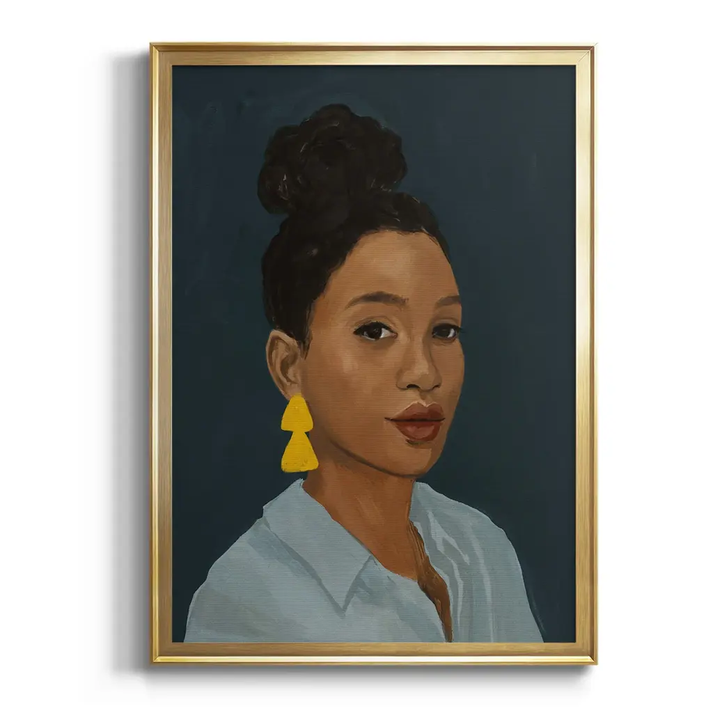 Figure in Yellow Earring Premium Framed Print - Ready to Hang A Premium Framed Print created to last. Framed in distressed wood and available in an array of sizes and colors Featuring a beveled a solid wood stretcher bar, each piece comes ready to hand 4 SIZES AVAILABLE 30.5''X42.5'' - Overall Size 26.5'X36.5'' - Overall Size 22.5''x30.5'' - Overall Size 18.5''x24.5'' - Overall Size Each piece is made to order. Each piece comes with hanging hardware. Made in the USA Ready to Hang