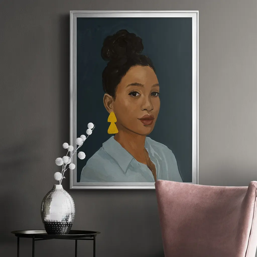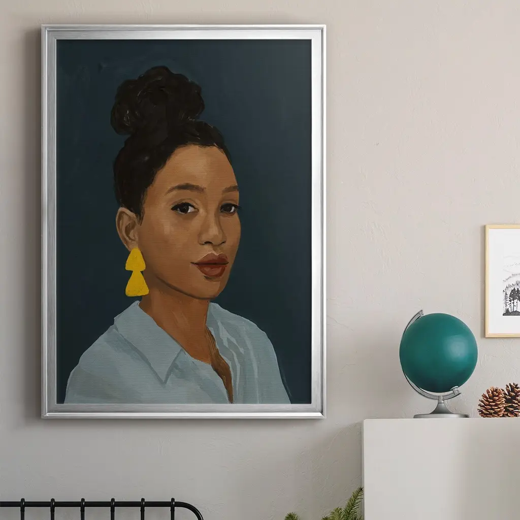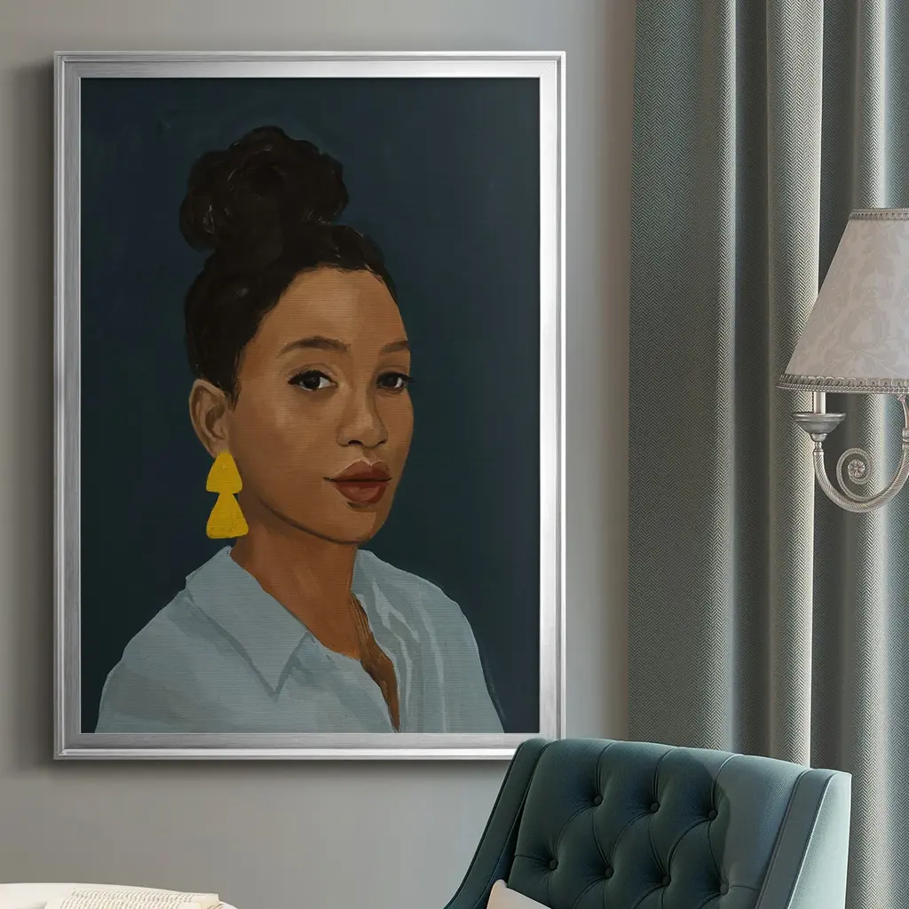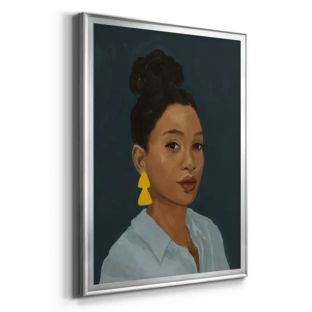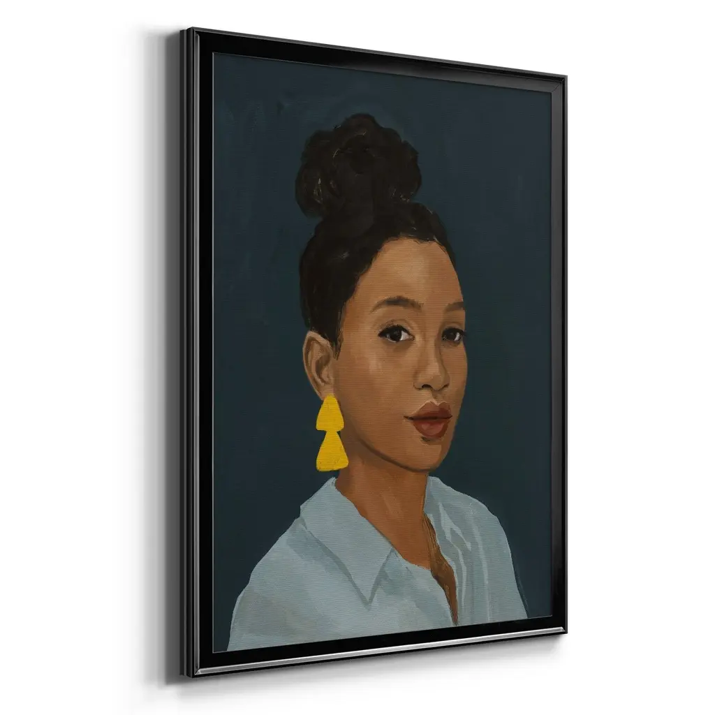 Figure in Yellow Earring Premium Framed Print - Ready to Hang A Premium Framed Print created to last. Framed in distressed wood and available in an array of sizes and colors Featuring a beveled a solid wood stretcher bar, each piece comes ready to hand 4 SIZES AVAILABLE 30.5''X42.5'' - Overall Size 26.5'X36.5'' - Overall Size 22.5''x30.5'' - Overall Size 18.5''x24.5'' - Overall Size Each piece is made to order. Each piece comes with hanging hardware. Made in the USA Ready to Hang