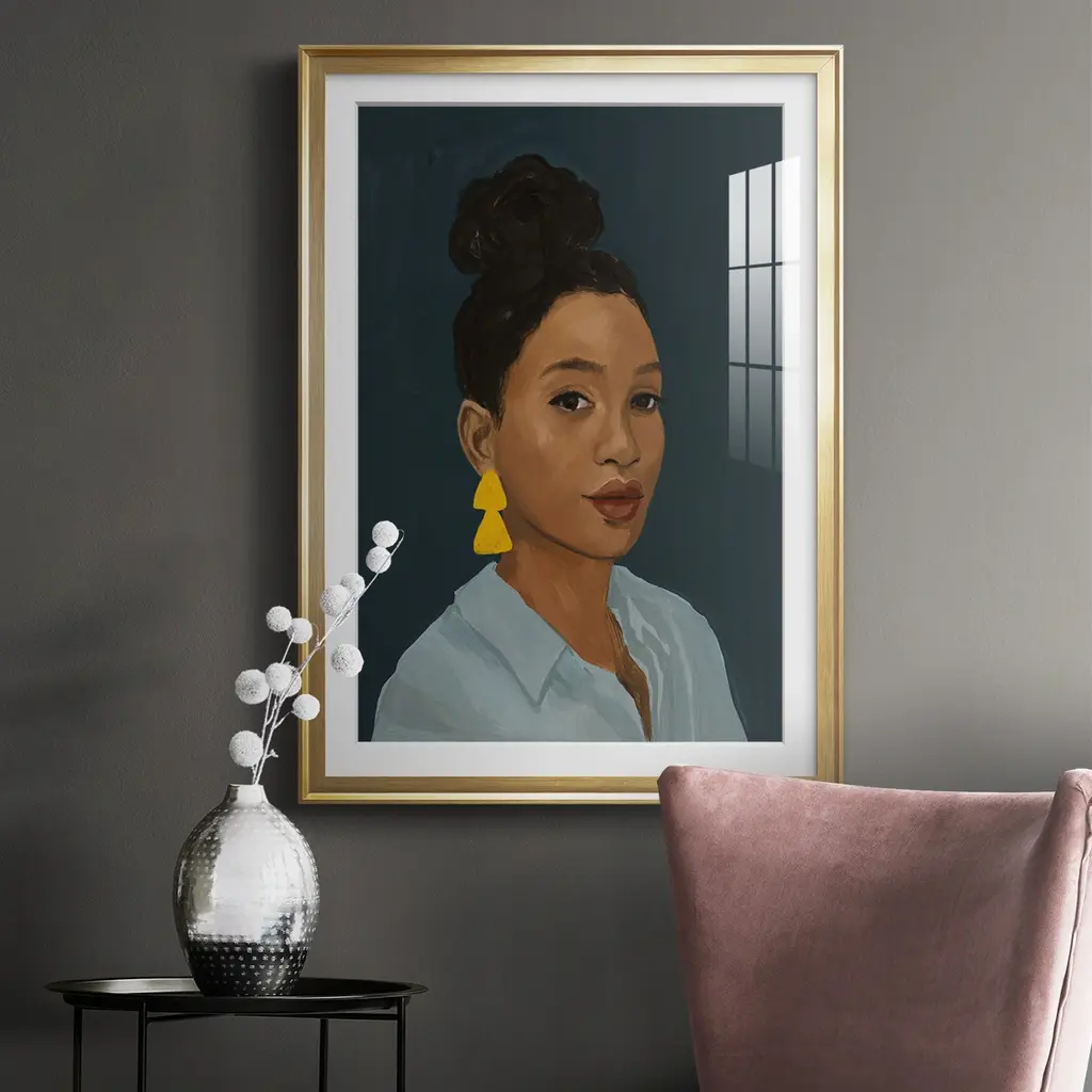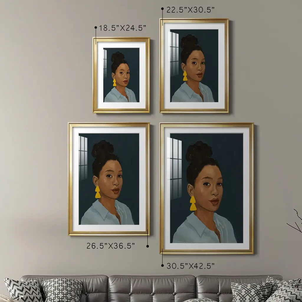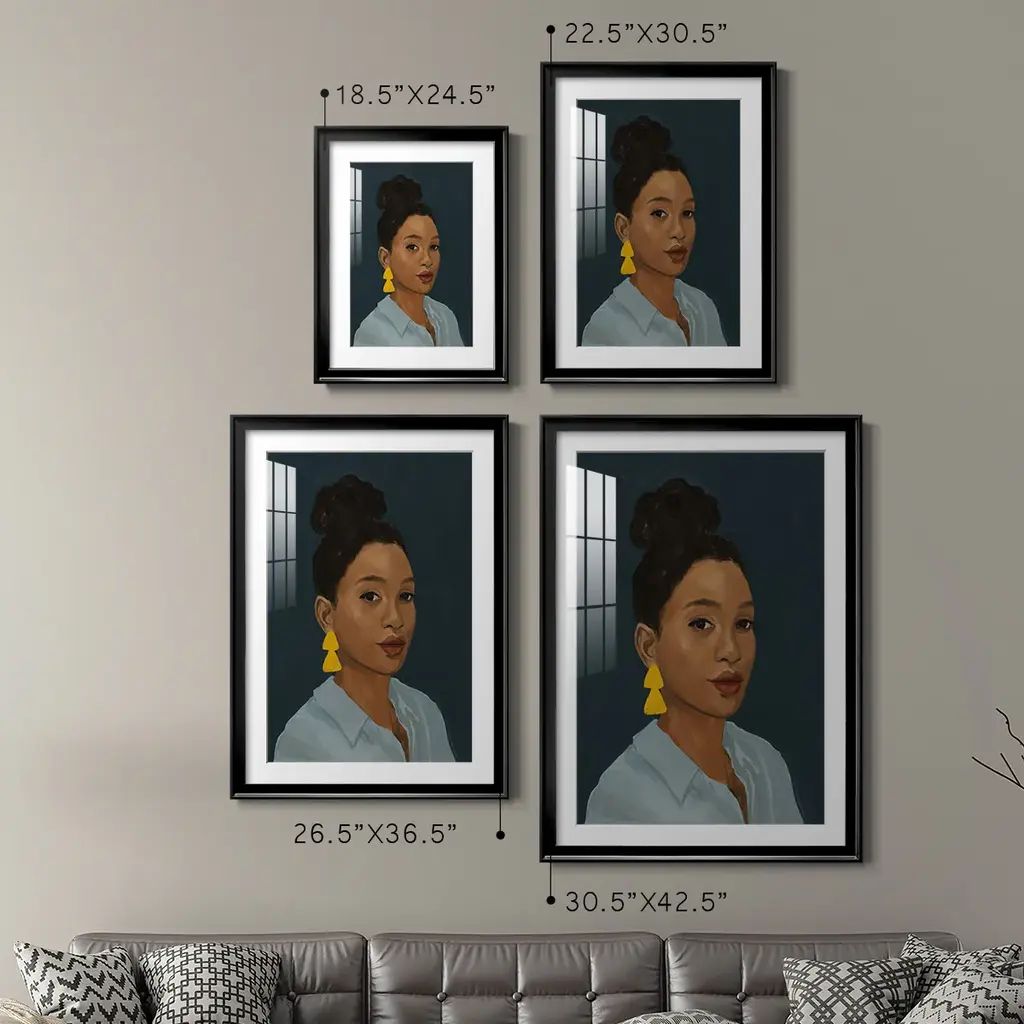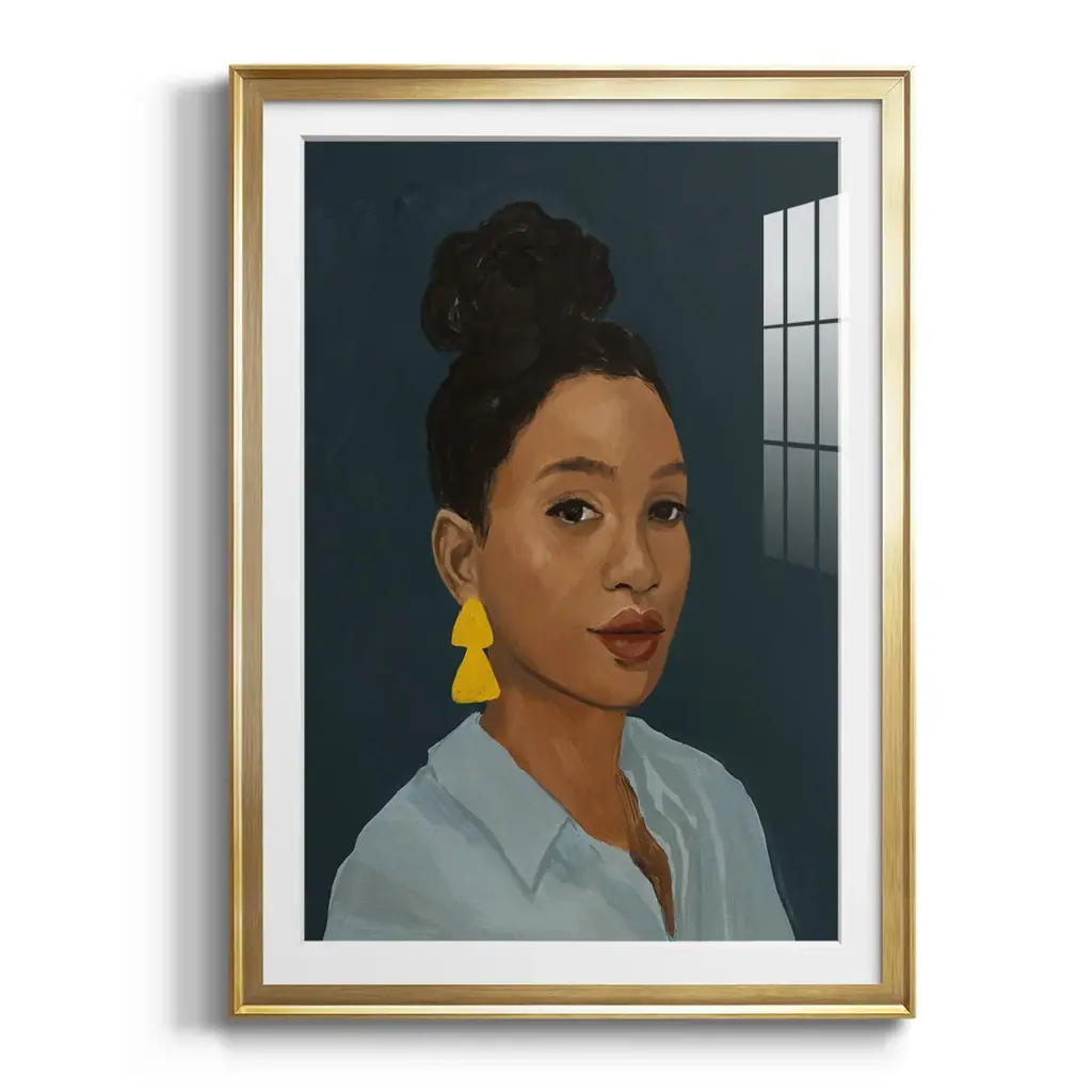 Figure in Yellow Earring Premium Framed Print - Ready to Hang A Premium Framed Print created to last. Framed in distressed wood and available in an array of sizes and colors Featuring a beveled a solid wood stretcher bar, each piece comes ready to hand 4 SIZES AVAILABLE 30.5''X42.5'' - Overall Size 26.5'X36.5'' - Overall Size 22.5''x30.5'' - Overall Size 18.5''x24.5'' - Overall Size Each piece is made to order. Each piece comes with hanging hardware. Made in the USA Ready to Hang Giclee Paper Print Acrylic Glass Beveled Matt Board