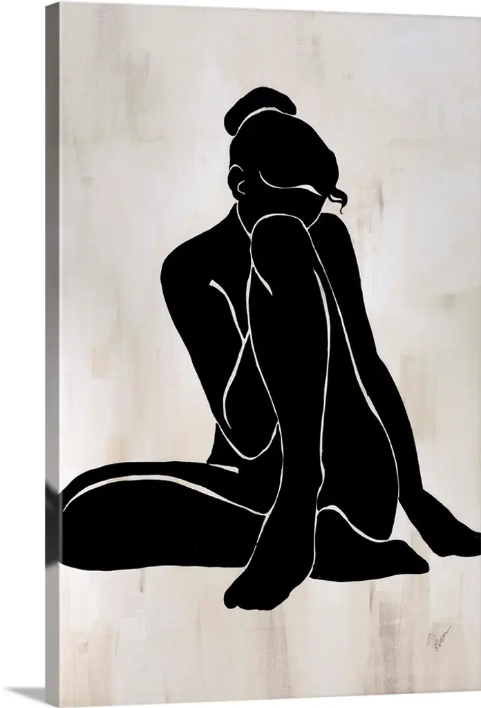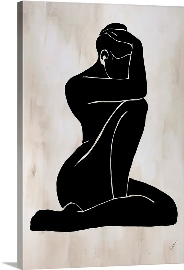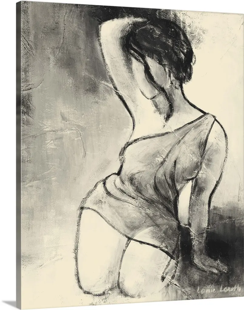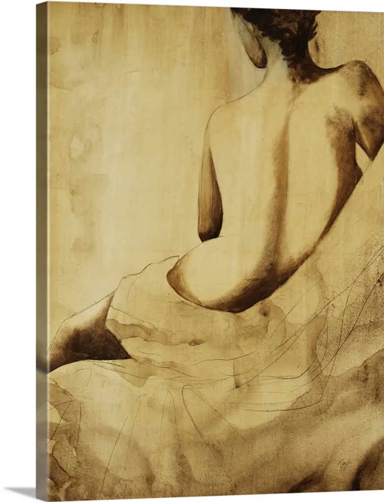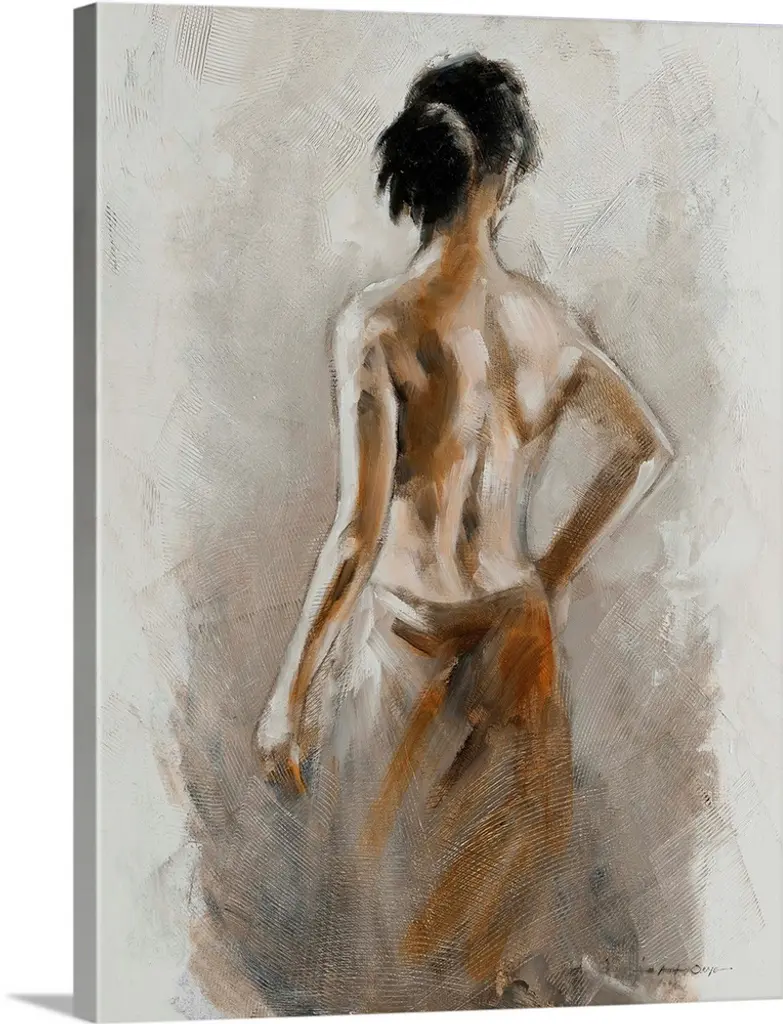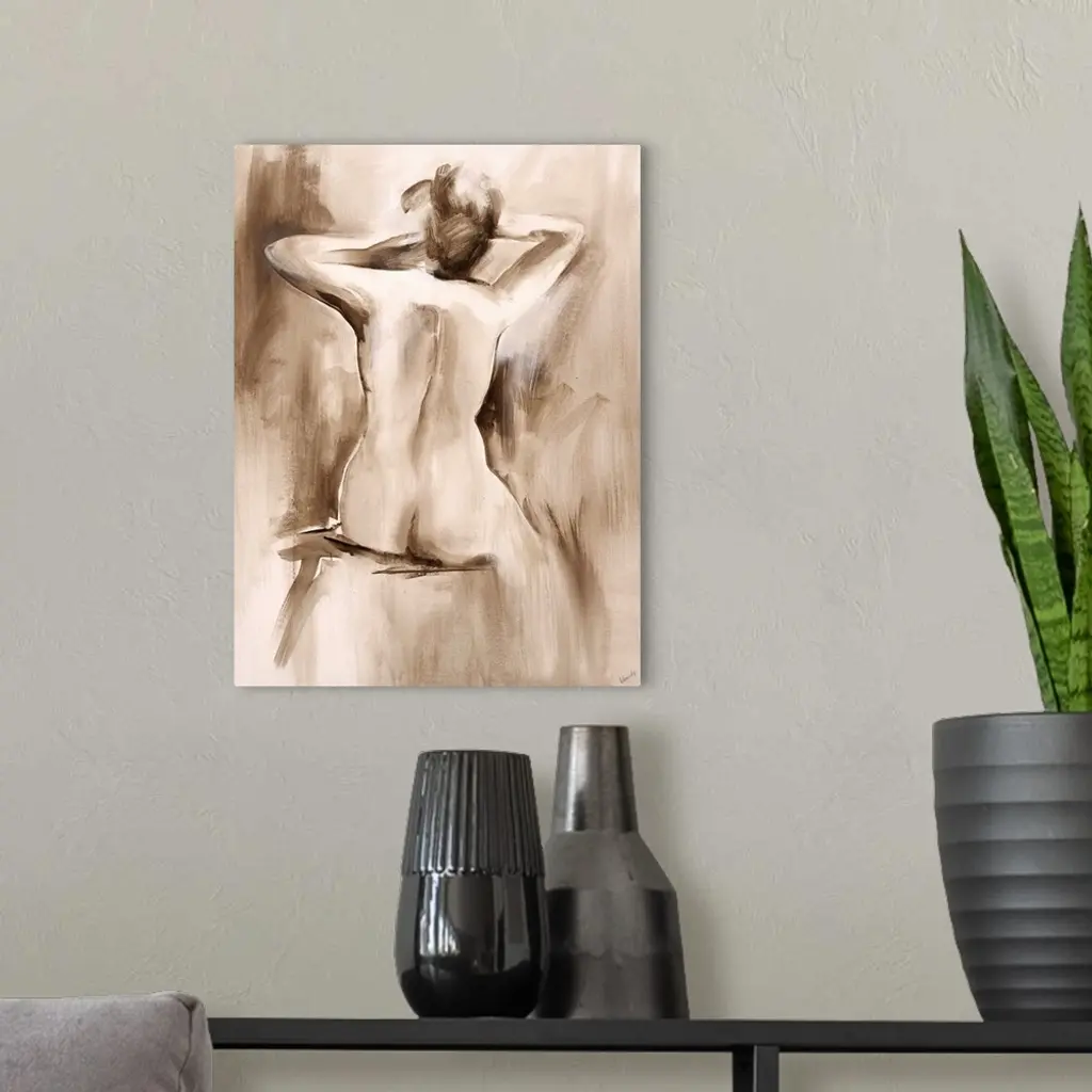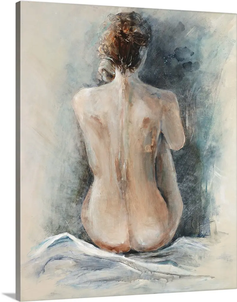 Contemporary figurative painting of a nude female seated with arms lifted and back facing viewer.