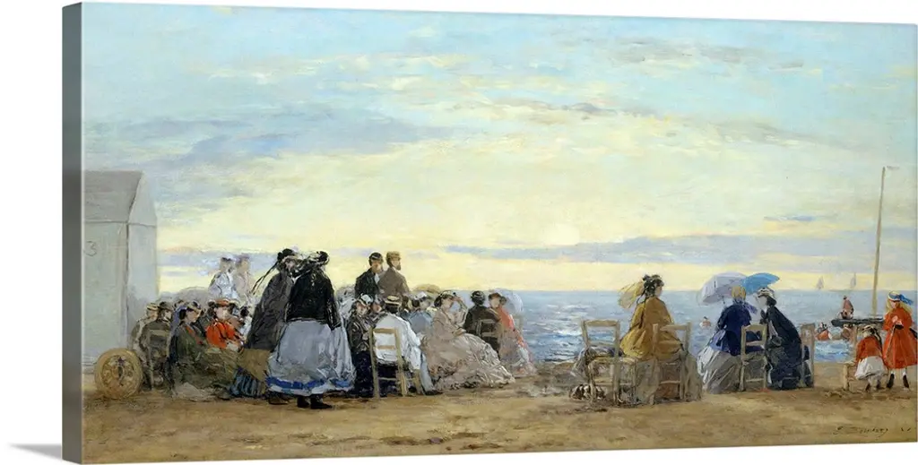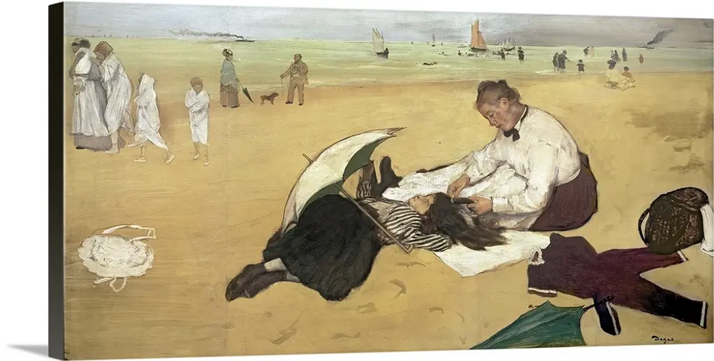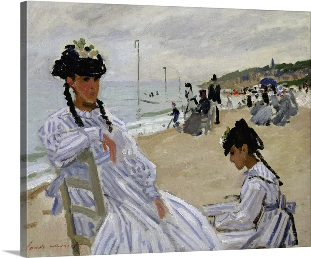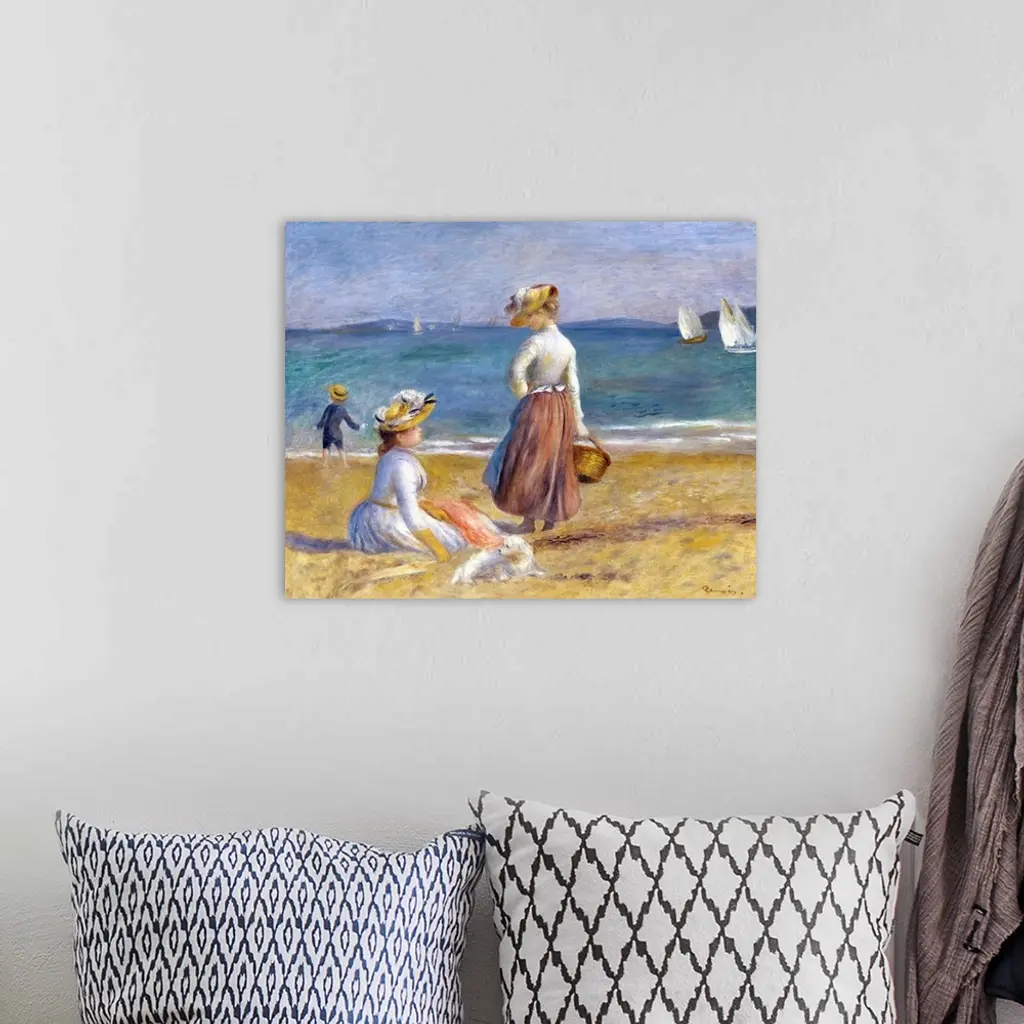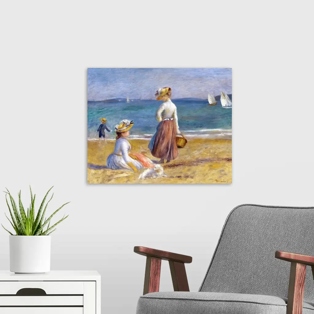 Probably painted in 1890 on the Cote d'Azur in southern France, this sun-filled painting shows two female figures at the beach. The seated figure is shown in profile, her right hand holding a parasol on the sand. She exchanges a look with the standing figure to her right who holds a basket at her side. The women are joined by a small white dog, and before the water stands a young boy dressed in blue, seemingly throwing an object into the ocean. The standing figure serves as a vertical force which connects the horizontally banded foreground, water, and sky.?The women appear carefree and neither at work nor in the presence of men. Painted later in Renoir's career, a period at which point the artist expressed skepticism of industrialism and machines, this quiet seascape pays homage to the resplendent beauty of what is ordinary and simple.�