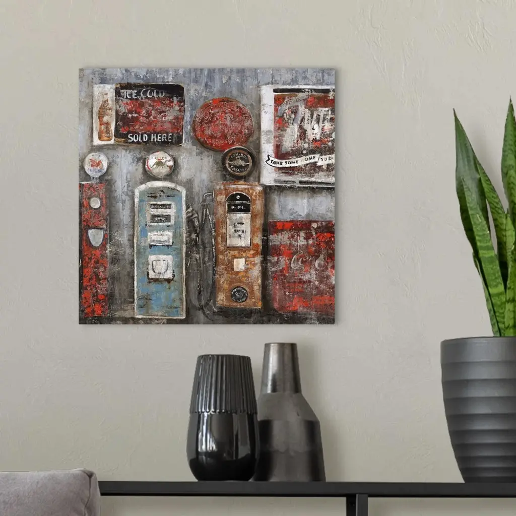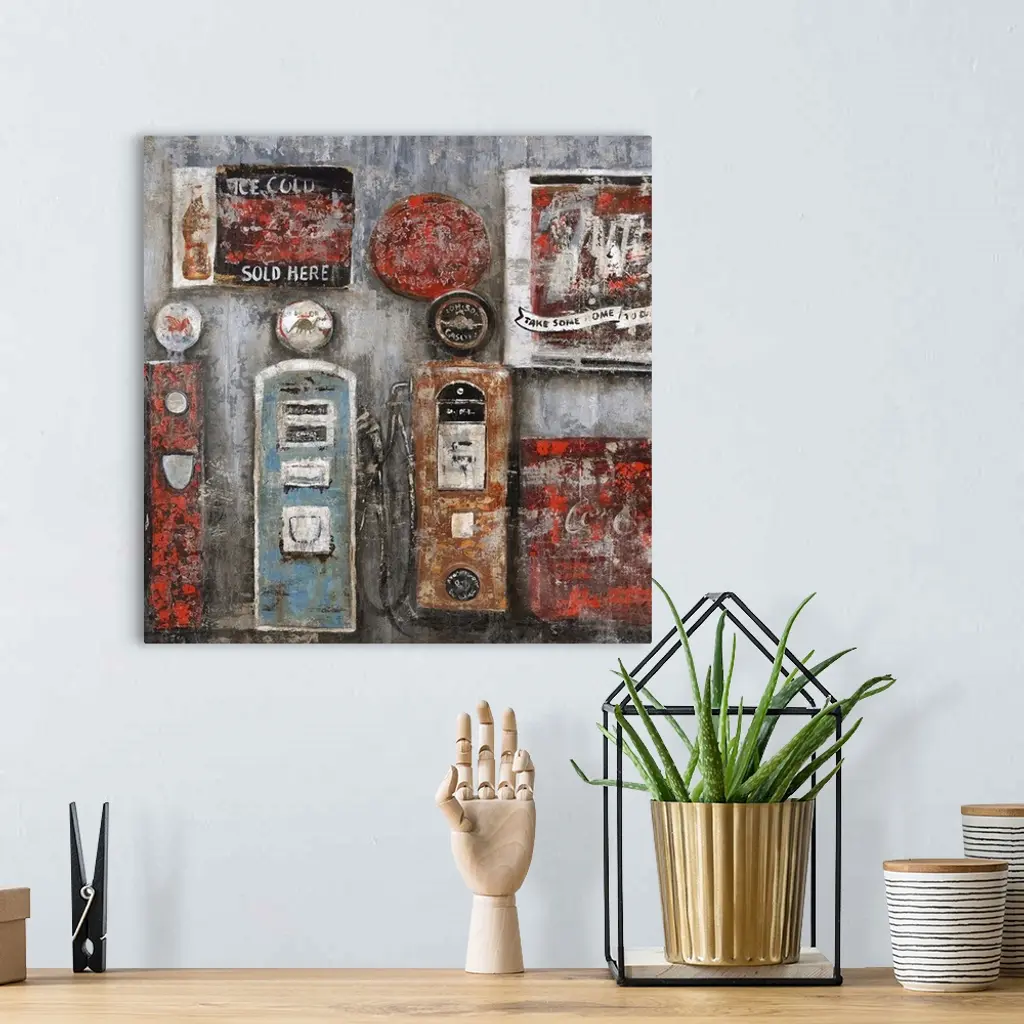 Painting of several vintage gas pumps and signage, painted with a texture that gives an antique feel to the image.