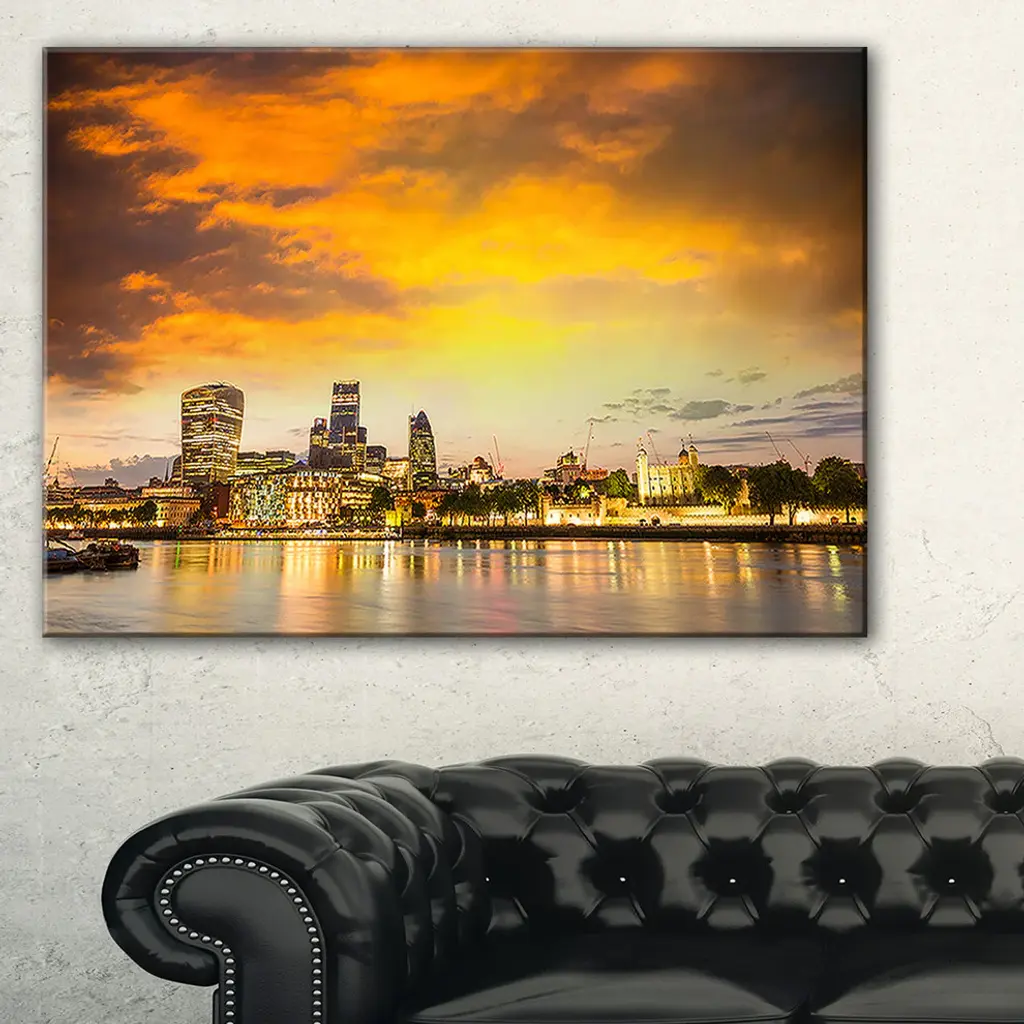 The Financial District of London at Twilight canvas art print is sure to make an impression on anyone who sees it. This artwork is gallery wrapped around a 1-inch solid wood frame and arrives carefully packaged and entirely ready to hang on the wall. Design Art only uses the highest resolution and pigments to ensure a crisp colorful print that is never faded or pixelated. This artwork is sure to be a conversation starter in any home or office.