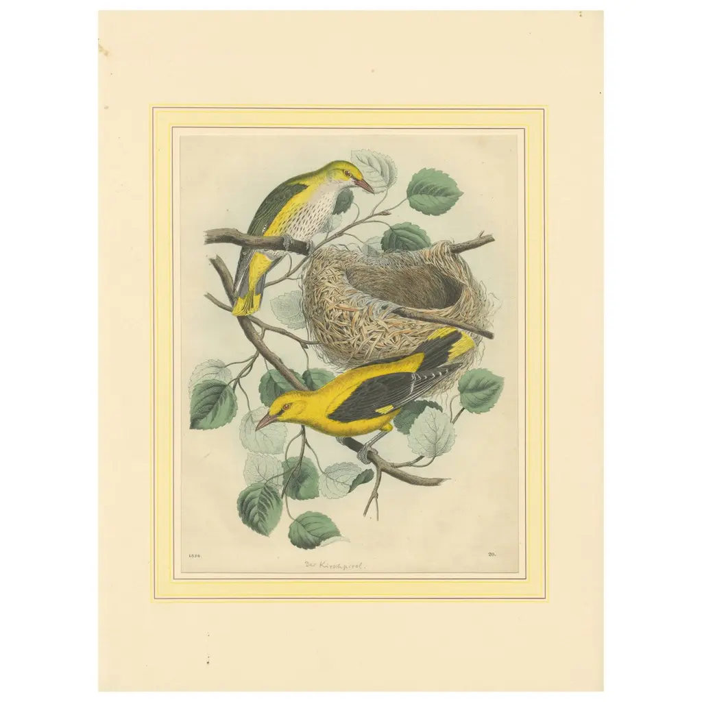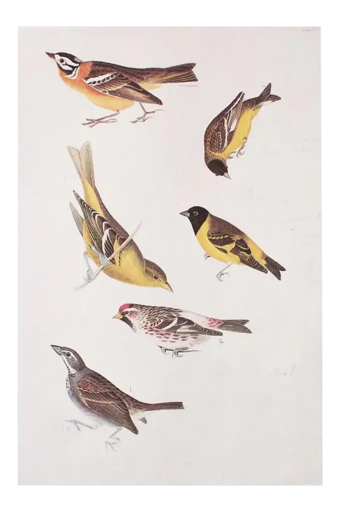 Title: "Finches and Sparrows: An 1849 Avian Assembly"Description: This delightful print, titled "Finches and Sparrows," is a detailed illustration from the "Book of Worlds," published in 1849 to document the natural and cultural diversity of the globe. Likely created by an artist commissioned for the book, the artwork features a group of small birds perched on a tree, showcasing a variety of finches and sparrows. The birds include species like the Eurasian Goldfinch (top right, with its red face and yellow wing bars), the European Greenfinch (middle right, with its olive-green body), and the House Sparrow (bottom right, with its gray and brown plumage). Other birds in the scene, such as the ones with speckled breasts and striped patterns, may represent species like the Chaffinch or Linnet, common in Europe and often depicted in 19th-century ornithological art. The natural setting, with its bare branches and grassy base, reflects their typical woodland habitat.The print is particularly interesting for its early representation of avian diversity, capturing the 19th-century fascination with natural history. In 1849, such illustrations were vital for scientific study, serving as both educational tools and decorative art before photography became widespread. The "Book of Worlds" aimed to bring the wonders of nature to a broader audience, and this piece exemplifies that mission by showcasing a range of small birds, each rendered with meticulous detail. The fine engraving techniques and subtle coloring highlight the birds' distinct plumage and the texture of the tree, creating a harmonious composition. This print not only appeals to collectors of historical wildlife art but also provides insight into the early documentation of European bird species, making it a valuable piece for those interested in the history of ornithological illustration.Condition Report: The print shows minor foxing on the edges with slight yellowing of the paper due to age. No tears or significant creases are present, and the colors remain vibrant. The mat board has light discoloration but is intact. Overall, the piece is in good condition for its age.Framing Tips: Use a soft olive or beige mat board to complement the natural tones of the birds and tree. A simple wooden frame in a light ash finish would enhance the 1849 aesthetic. Ensure acid-free materials to preserve the print's condition.