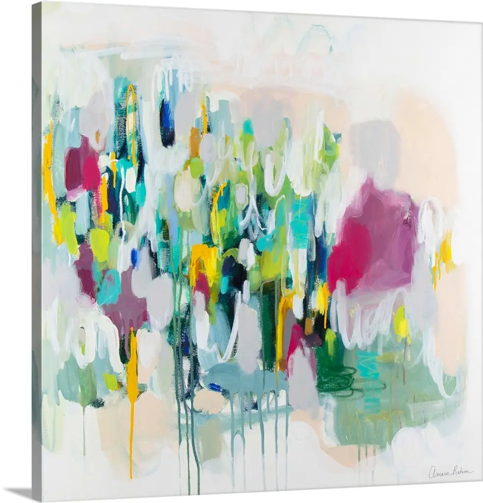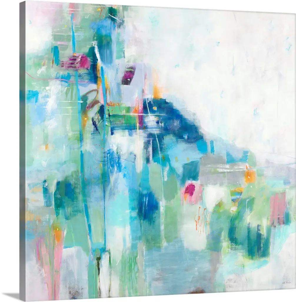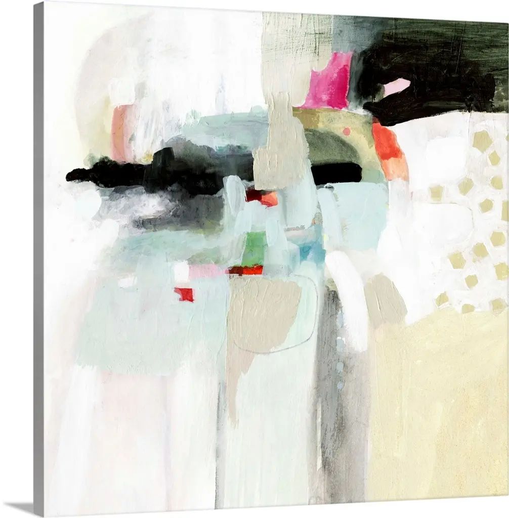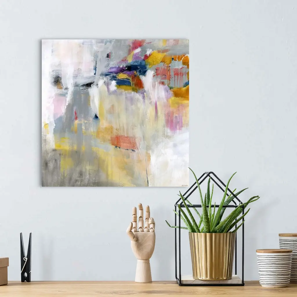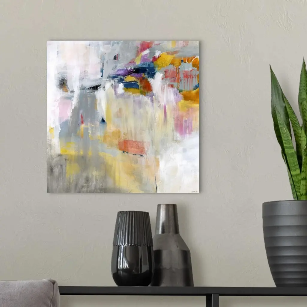 Contemporary abstract painting using tones of orange blue and pink against a multi-toned gray background.