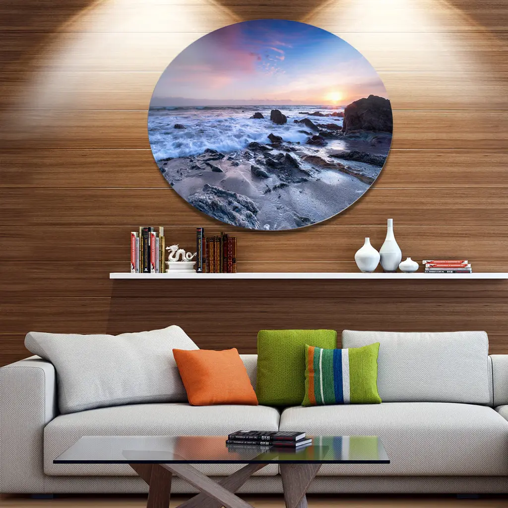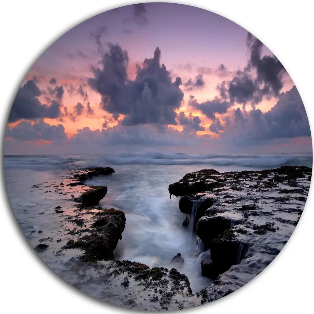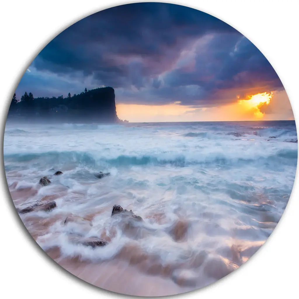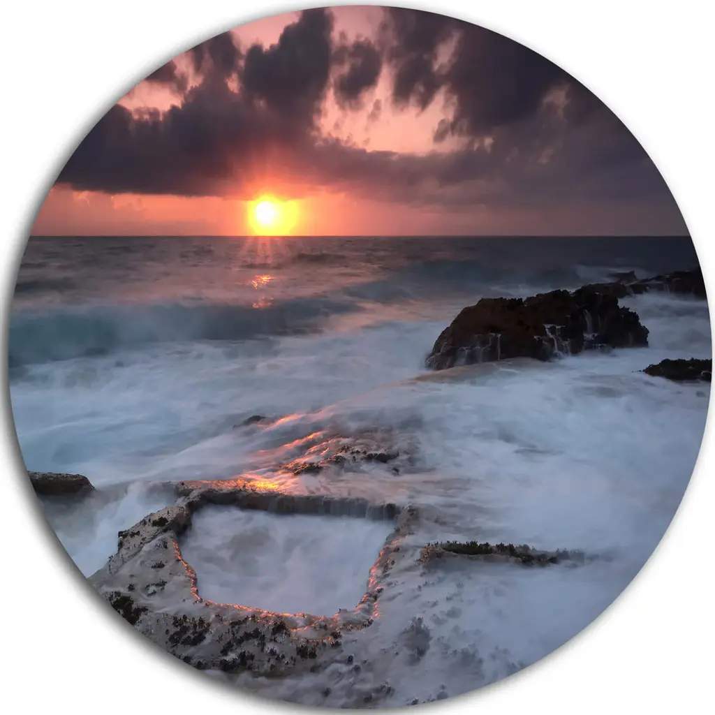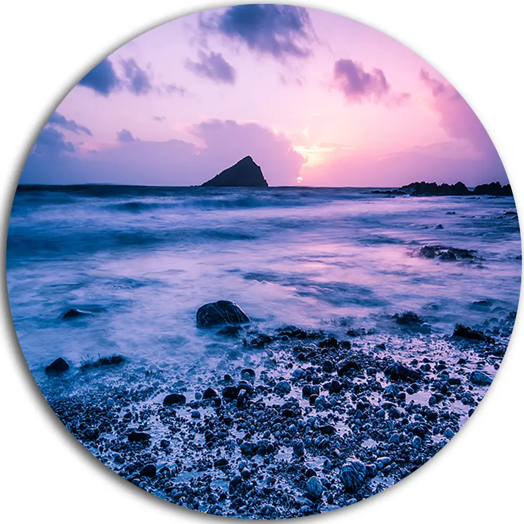 Bring Contemporary Abstraction to your home with this large Circle Metal wall art. This Finnygook Beach in Cornwall at Sunset Metal Artwork makes it the focal point of any room or office. - White Gloss Coating ensures colors are extra vibrant with light reflection.- Aluminum grade Sheet Metal with 1 inch mounting frame on the back giving the illusion that the artwork is floating on the wall..- Mounting Brackets are included along with instructions.- High Quality Digital images are created directly into a glossy aluminum panel producing a stunning and captivating print into the glossy finish of the metal.- Water, Fire and Scratch resistant HD Aluminum panels.- Looks better than any photo paper and guaranteed to last at least 20 years- Easy to clean with a microfiber cloth. Colors are far superior to regular Canvas Art. - Easy to Hang