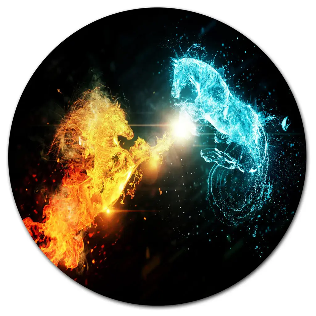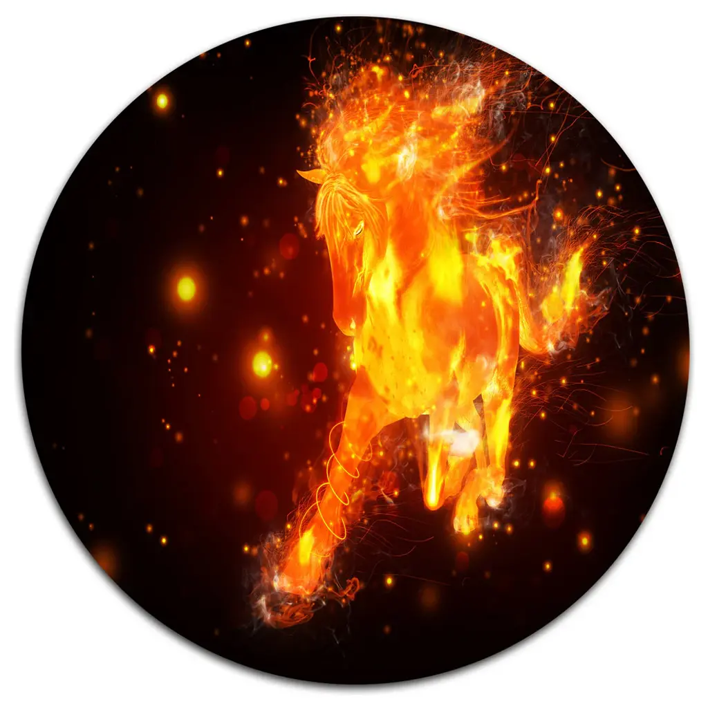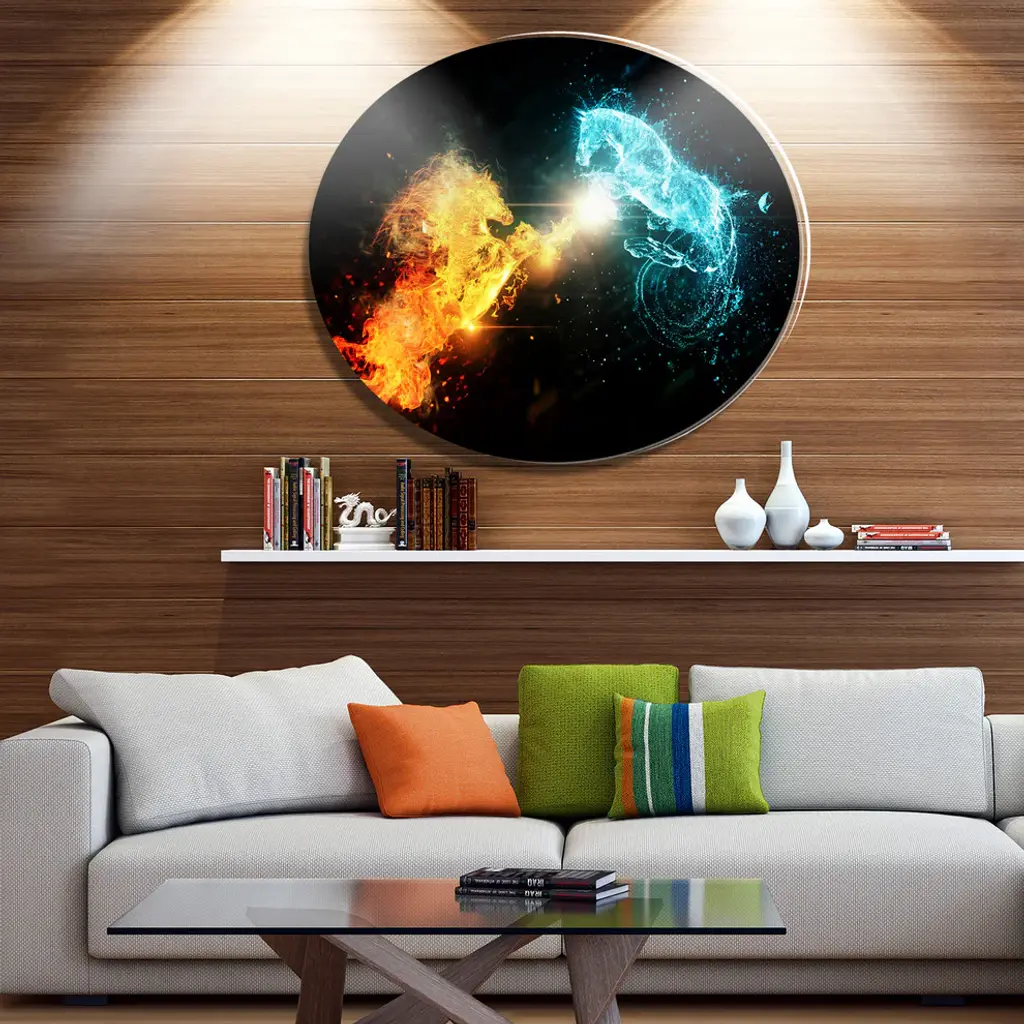 Bring Contemporary Abstraction to your home with this large Circle Metal wall art. This Fire and Water Abstract Horses Metal Artwork makes it the focal point of any room or office. - White Gloss Coating ensures colors are extra vibrant with light reflection.- Aluminum grade Sheet Metal with 1 inch mounting frame on the back giving the illusion that the artwork is floating on the wall..- Mounting Brackets are included along with instructions.- High Quality Digital images are created directly into a glossy aluminum panel producing a stunning and captivating print into the glossy finish of the metal.- Water, Fire and Scratch resistant HD Aluminum panels.- Looks better than any photo paper and guaranteed to last at least 20 years- Easy to clean with a microfiber cloth. Colors are far superior to regular Canvas Art. - Easy to Hang