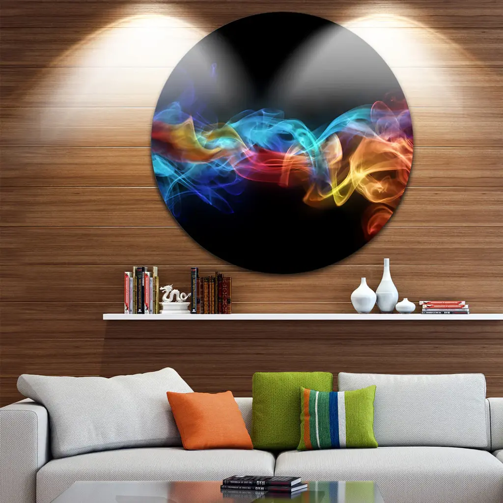Bring Contemporary Abstraction to your home with this large Circle Metal wall art. This Fire in Colors Metal Artwork makes it the focal point of any room or office. - White Gloss Coating ensures colors are extra vibrant with light reflection.- Aluminum grade Sheet Metal with 1 inch mounting frame on the back giving the illusion that the artwork is floating on the wall..- Mounting Brackets are included along with instructions.- High Quality Digital images are created directly into a glossy aluminum panel producing a stunning and captivating print into the glossy finish of the metal.- Water, Fire and Scratch resistant HD Aluminum panels.- Looks better than any photo paper and guaranteed to last at least 20 years- Easy to clean with a microfiber cloth. Colors are far superior to regular Canvas Art. - Easy to Hang