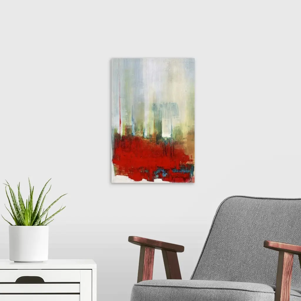 Contemporary abstract artwork in bright red with hazy blue and green.