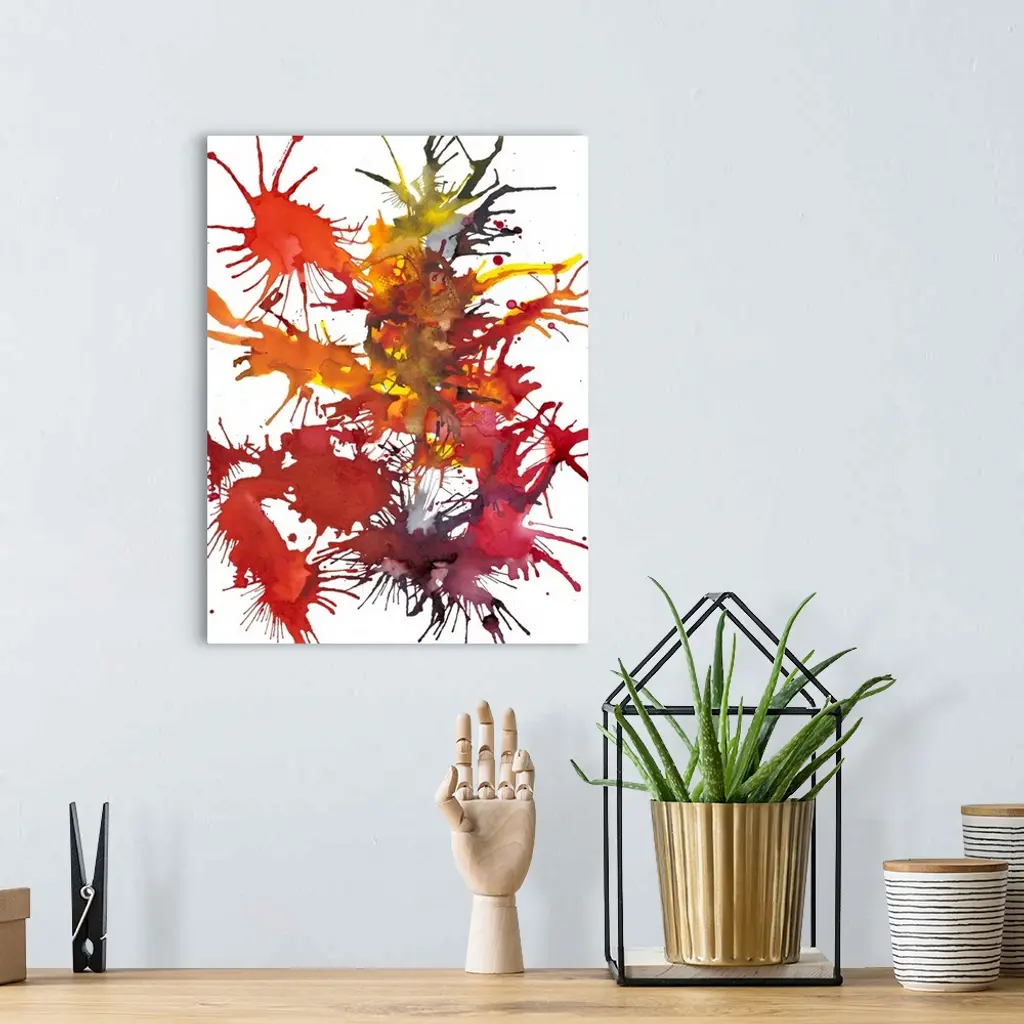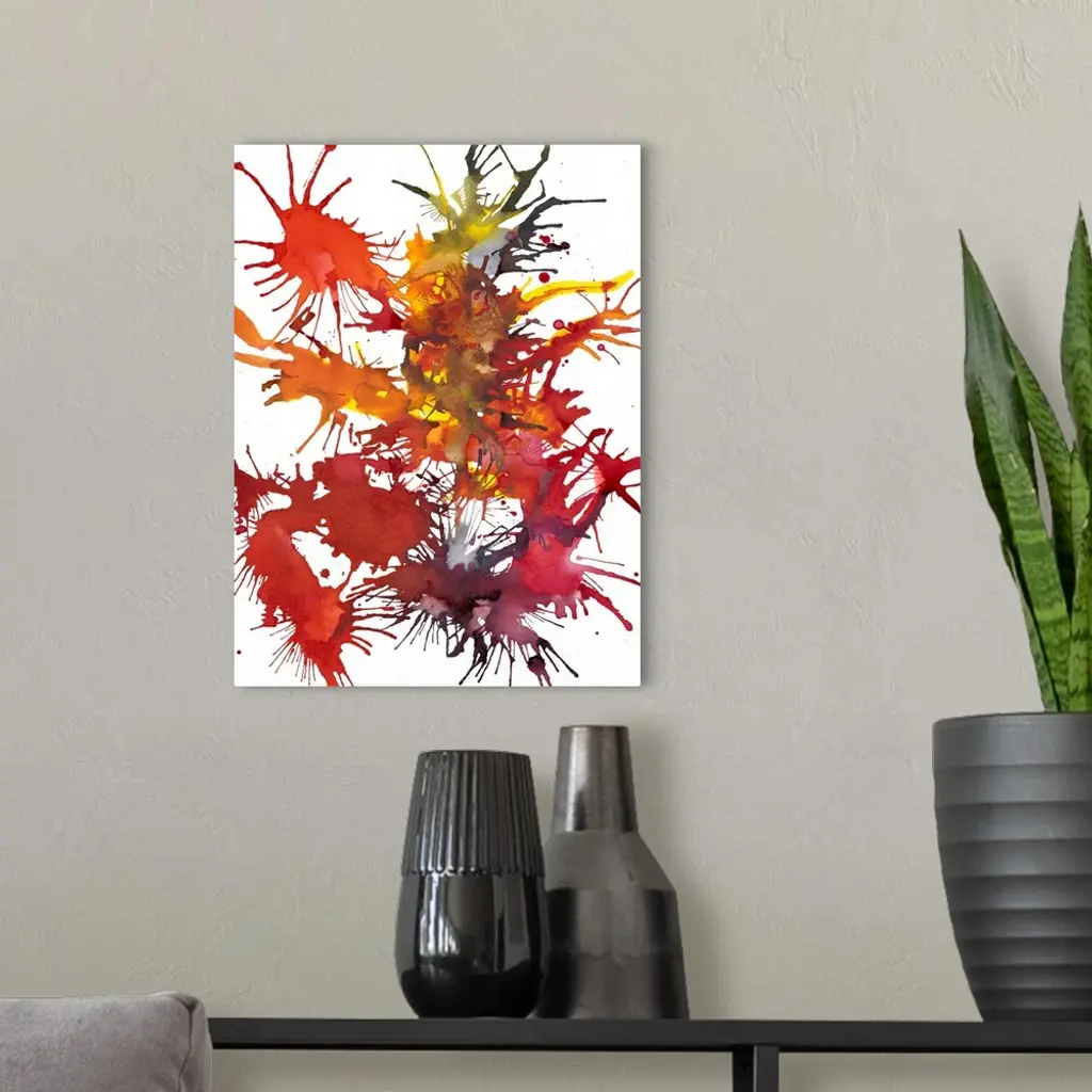 Abstract painting of splattered paint in deep red and orange, resembling fireworks.