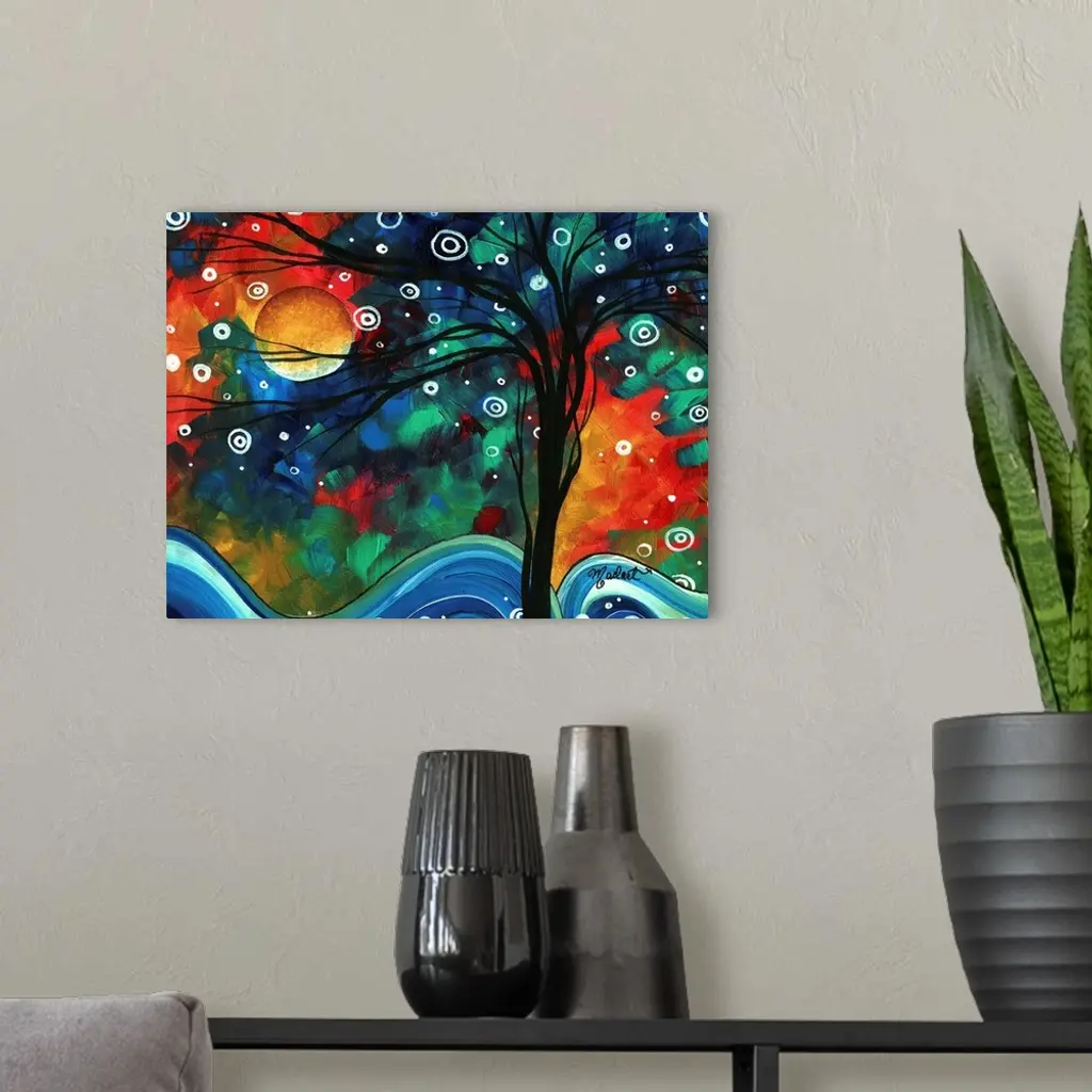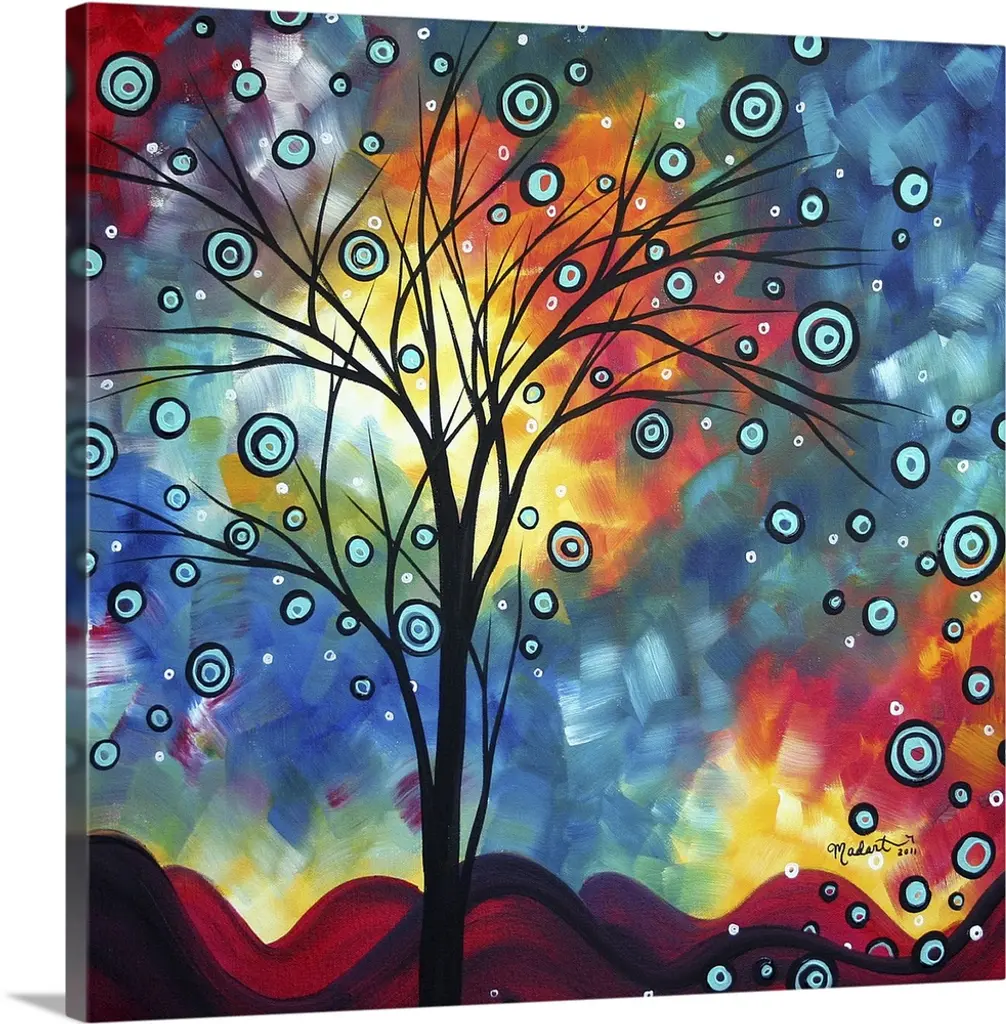 Whimsical painting of bare tree with snowflakes falling and hills of snow on the ground. The moon is visible and the sky is made of colorful paint daubs.