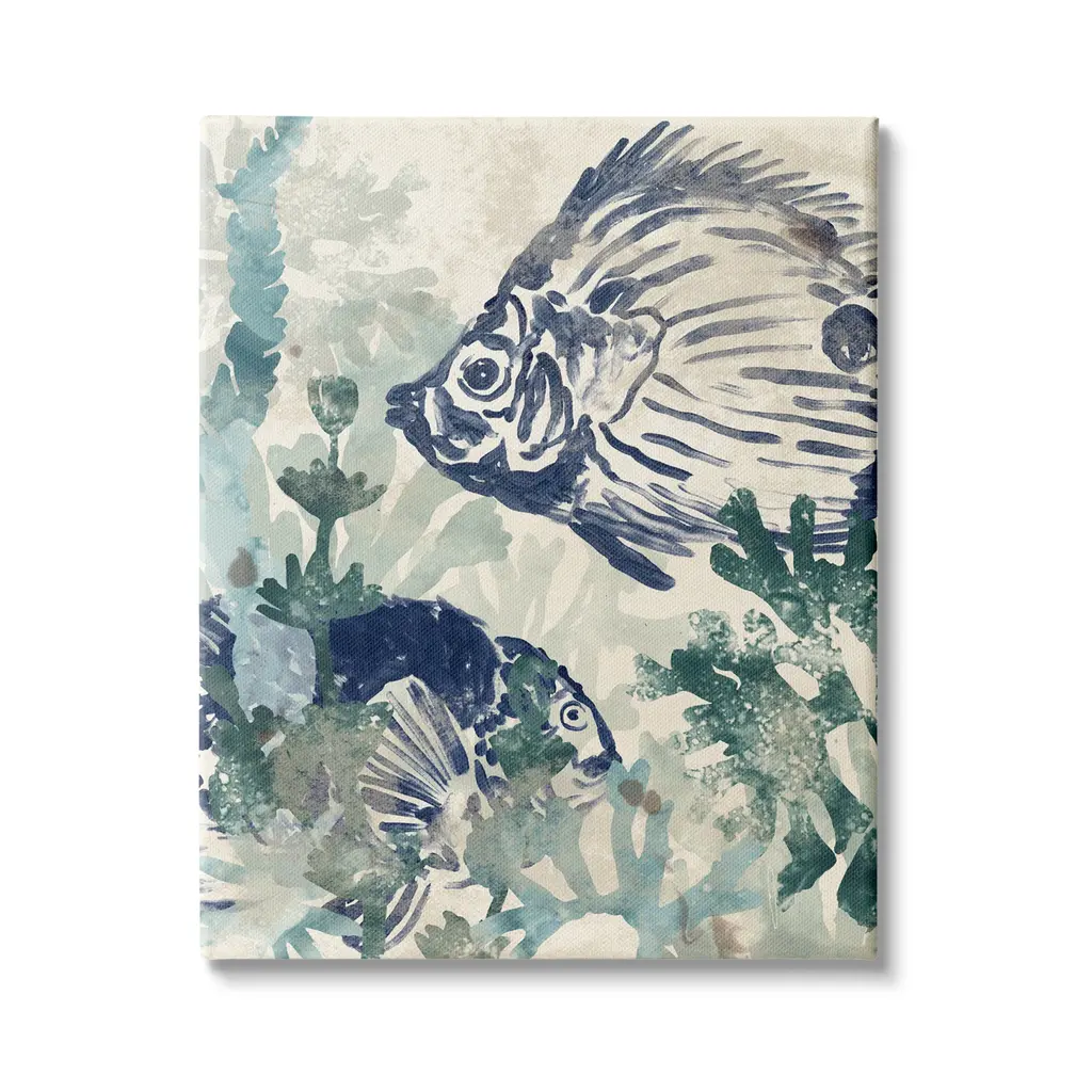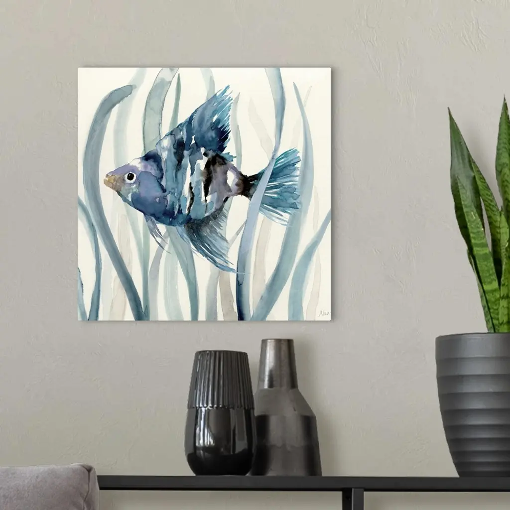 Square indigo watercolor painting of a fish underwater in seagrass on an off white background.