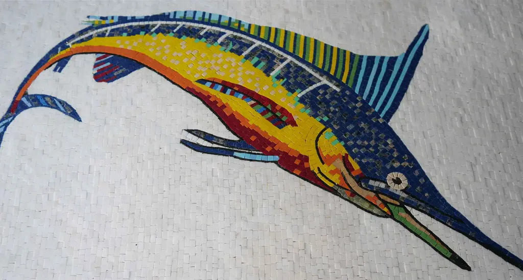 Dive into the vibrant world of marine art with our exquisite "Fish Mosaic - Colorful Swordfish." This stunning nautical mosaic art piece beautifully showcases the elegance of a swordfish, meticulously crafted with magnificent shades of orange, red, yellow, and blue, set against a pristine white background. Each tile of this fully handmade mosaic is made from high-quality marble stones, ensuring durability and a luxurious feel. Designed to add a splash of color and personality to your pool area or bathroom, this artistic creation serves as a captivating focal point that brings the beauty of the ocean right into your home. Whether you're looking to enhance your indoor decor or create a serene outdoor oasis, the vibrant hues and intricate details of the swordfish are sure to impress. Perfect for ocean lovers, art enthusiasts, or anyone looking to elevate their space, the "Fish Mosaic - Colorful Swordfish" is more than just decor; it's a conversation starter and a piece of art that tells a story. Easy to install and maintain, this mosaic is an ideal choice for both residential and commercial settings. Bring the charm of the sea into your life and let this stunning mosaic transform your space into a coastal getaway. Make a splash in your home decor with this unique and eye-catching piece today!