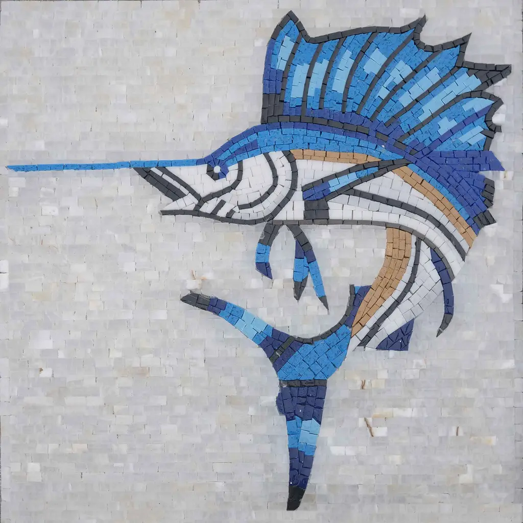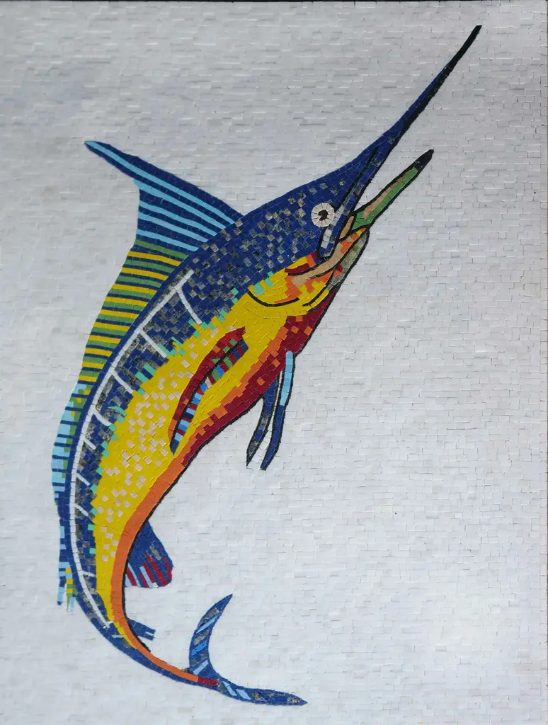 Dive into the vibrant world of marine art with our exquisite "Fish Mosaic - Colorful Swordfish." This stunning nautical mosaic art piece beautifully showcases the elegance of a swordfish, meticulously crafted with magnificent shades of orange, red, yellow, and blue, set against a pristine white background. Each tile of this fully handmade mosaic is made from high-quality marble stones, ensuring durability and a luxurious feel. Designed to add a splash of color and personality to your pool area or bathroom, this artistic creation serves as a captivating focal point that brings the beauty of the ocean right into your home. Whether you're looking to enhance your indoor decor or create a serene outdoor oasis, the vibrant hues and intricate details of the swordfish are sure to impress. Perfect for ocean lovers, art enthusiasts, or anyone looking to elevate their space, the "Fish Mosaic - Colorful Swordfish" is more than just decor; it's a conversation starter and a piece of art that tells a story. Easy to install and maintain, this mosaic is an ideal choice for both residential and commercial settings. Bring the charm of the sea into your life and let this stunning mosaic transform your space into a coastal getaway. Make a splash in your home decor with this unique and eye-catching piece today!