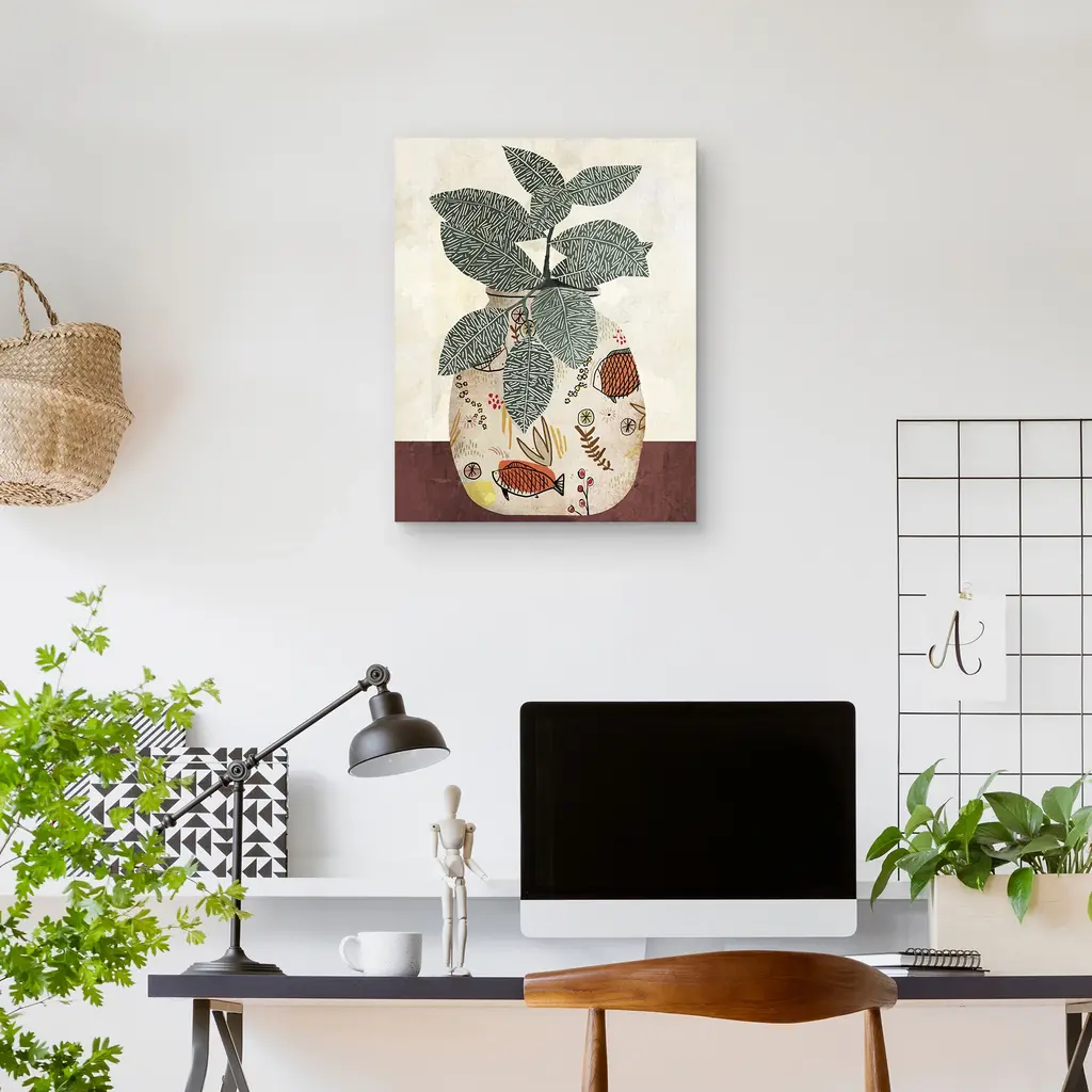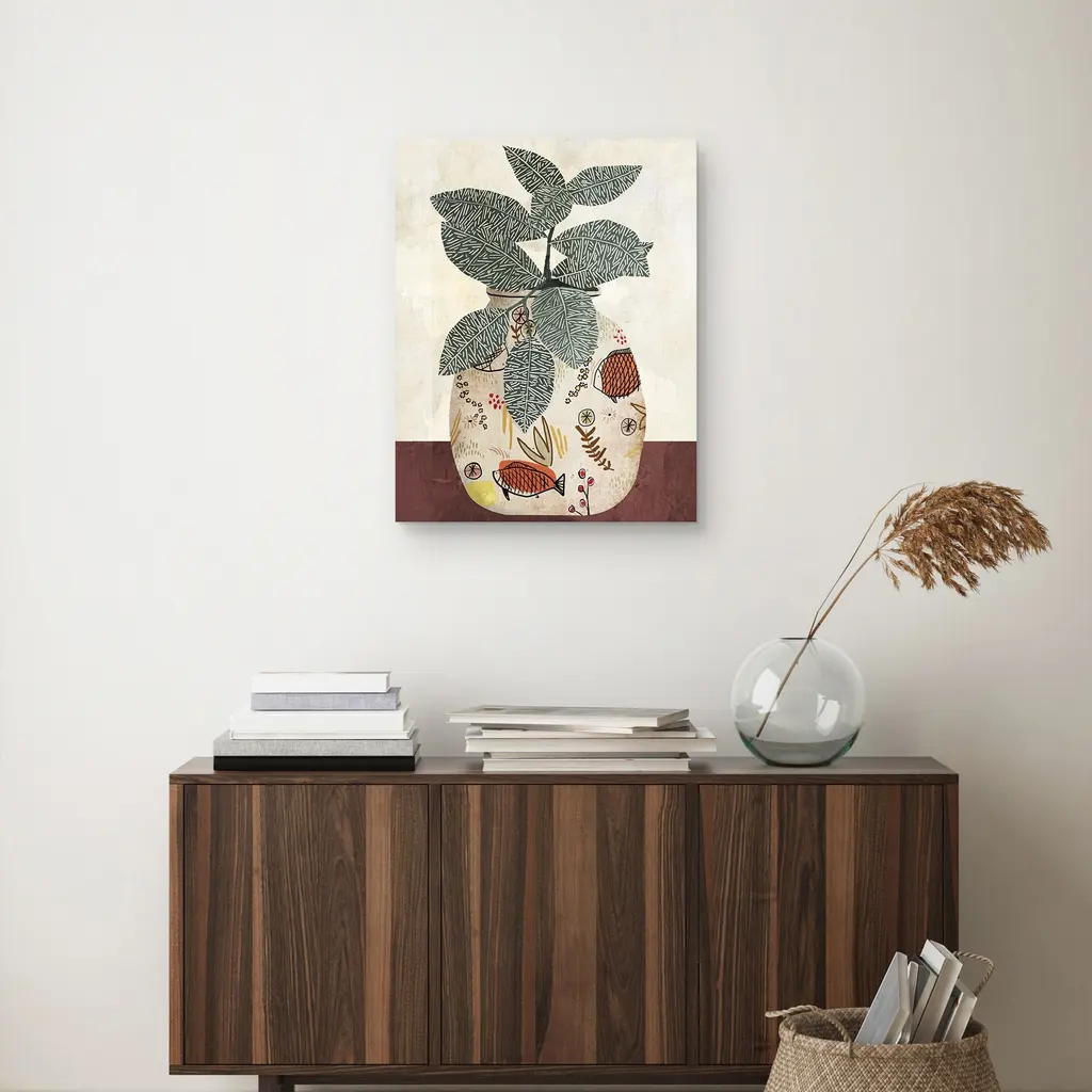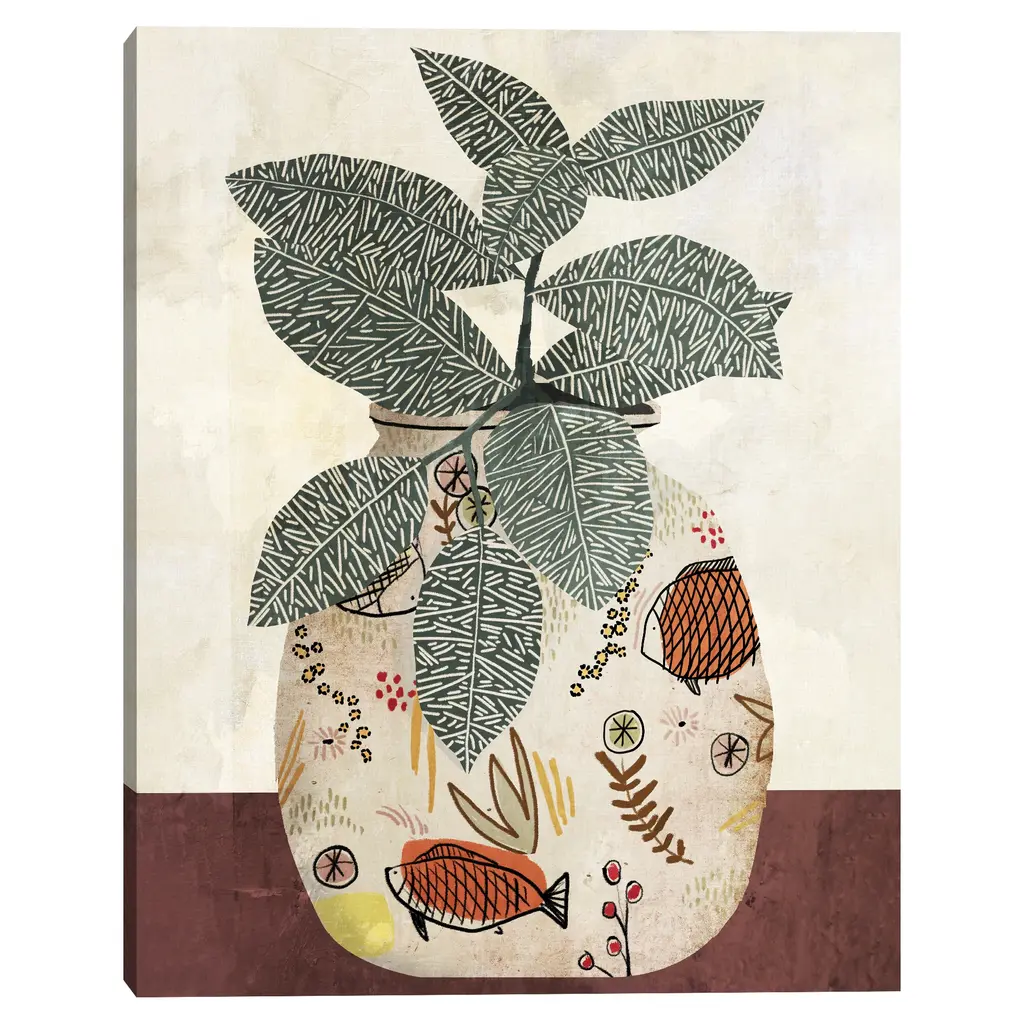 A clay vase endowed with illustrated fish sits atop a table filled with a leafy plant. Fish Pots I canvas art print by Belle Maison is a playful contemporary still-life portrait of ordinary objects portrayed innovatively. Change up your home decor with this unique wall adornment.